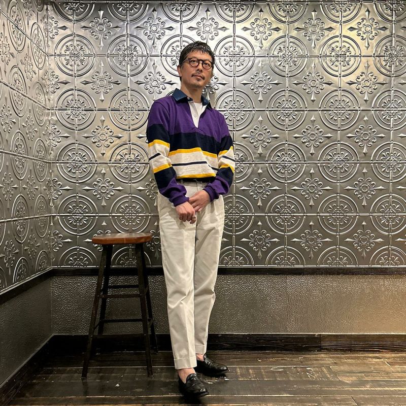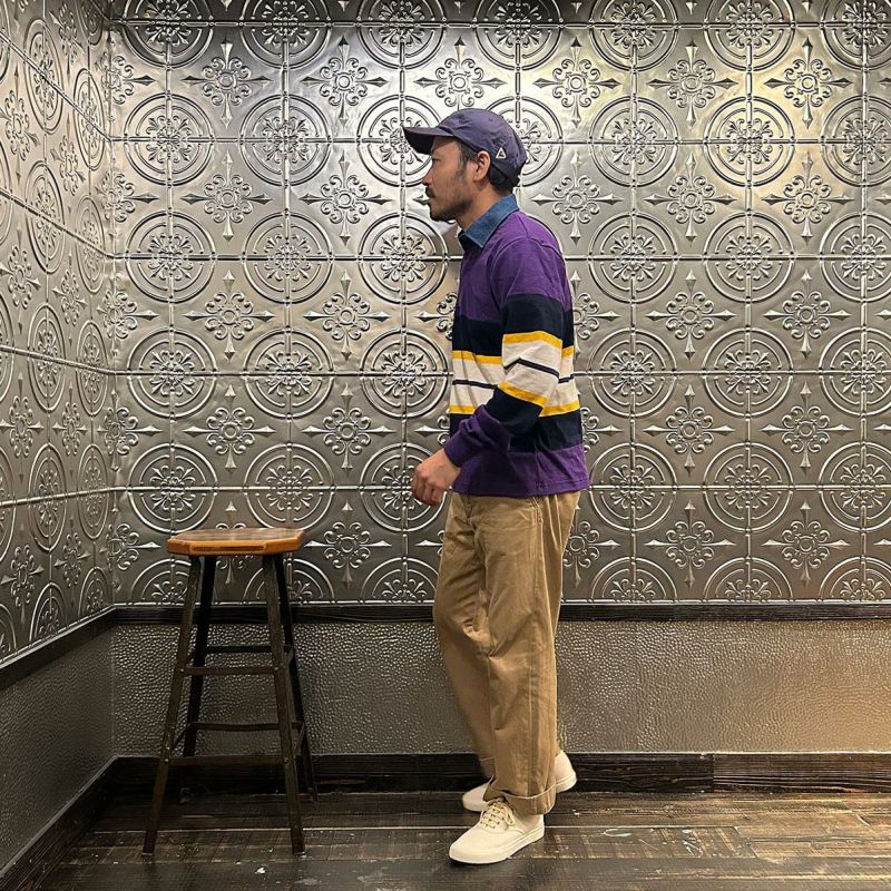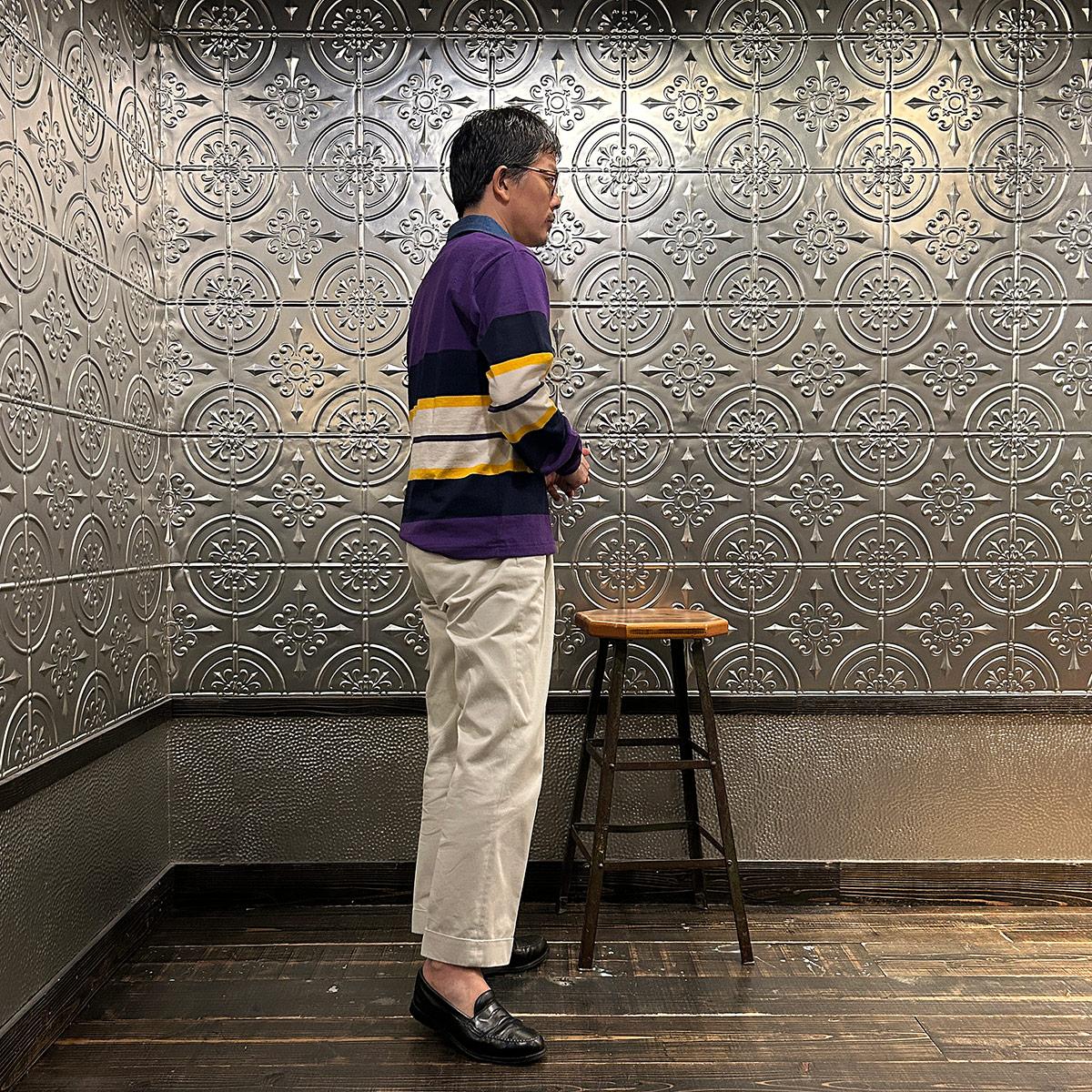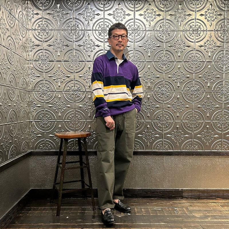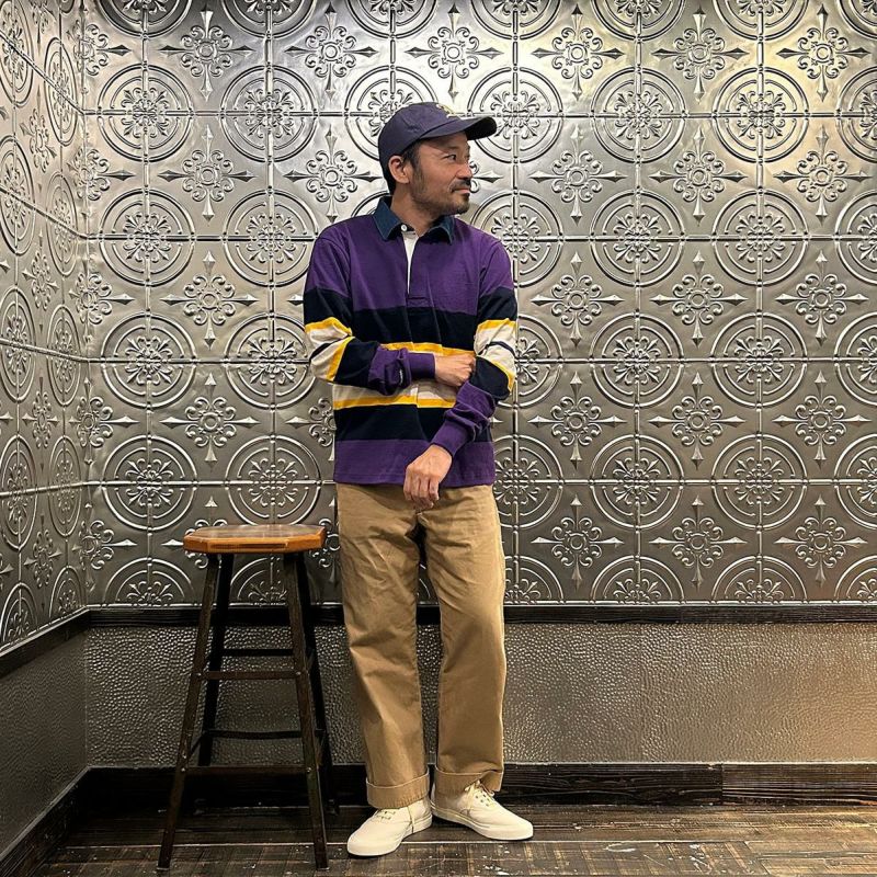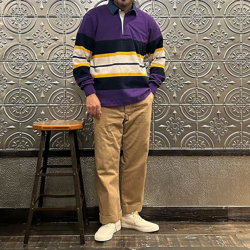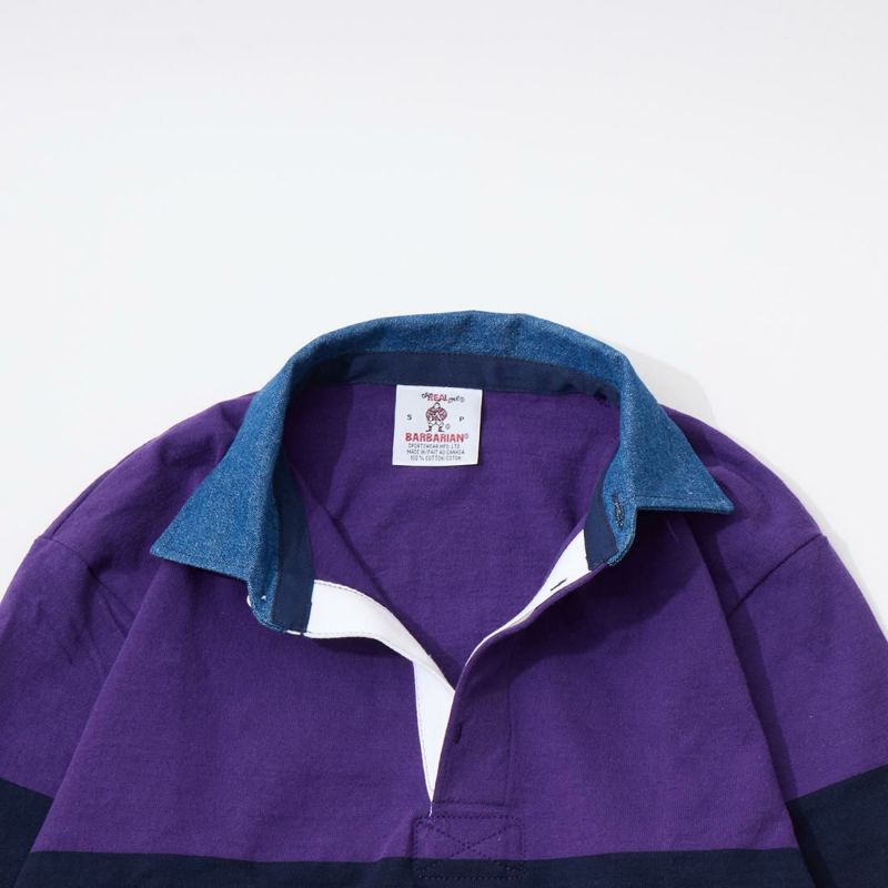 BARBARIAN(バーバリアン)のEXCLUSIVE LIGHT WEIGHT L/S RUGBY SHIRT。別注モデルの長袖ラグビーシャツ。配色から細かい仕様まで熟考して作った渾身の別注!定番の12オンスへヴィーウェイトコットンと同じ糸を使いながら、重量を約30%軽くした8オンスのライトウエイトの生地を使用。襟はデニム素材。すっきりとしたシルエットでありながら、肩幅、身幅に程良いゆとりを持たせた日本人の体形を考慮して作られたジャパンサイズスペック。着込む事で生まれる経年変化も楽しんで頂ける1着。洗濯によって着丈、袖丈が1-2センチ程度縮みます。