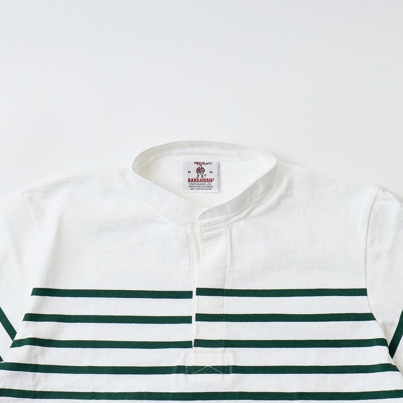BARBARIAN(バーバリアン)のS/S LIGHT WEIGHT HENLEY NECK SHIRT。定番のへビーウェイトコットンと同じ糸を使いながらも、重量を約30%軽くした8オンスのライトウエイト仕様のヘンリーネックの半袖ラグビーシャツ。襟もボディーと同生地仕様でバンド部分にボタンとボタンホールはございません。