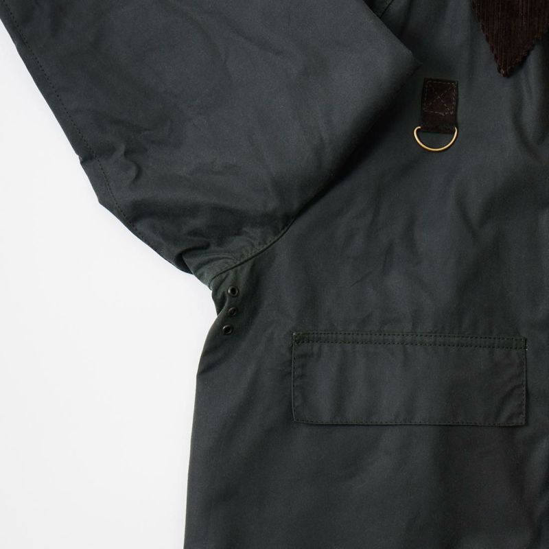 BARBOUR(バーブァー)のSPEY。BARBOURの代名詞的存在のオイルドジャケット。その中でもコアなファンを集める、フィッシングのために開発されたモデルSPEY JACKET。袖はラグランスリーブで、フロントはジップとスナップボタンで留める仕様。右胸と左側腹部にDリングが付き、脇下にはベンチレーションを装備。ポケットはフロントに大きめのフラップポケット2つと内側にも大きめのポケットが2つ付きます。袖口は2重構造になっており、ボタンで袖口の広さの調節が可能です。経年変化も楽しめる永く愛用して頂ける1着です。