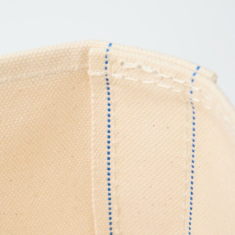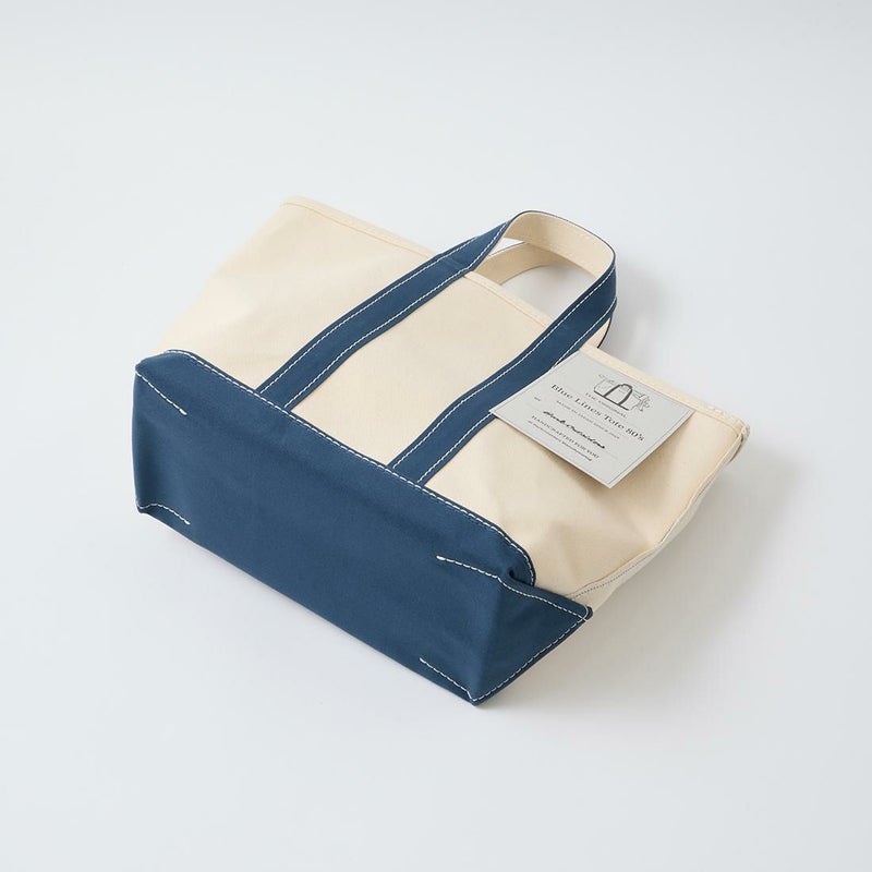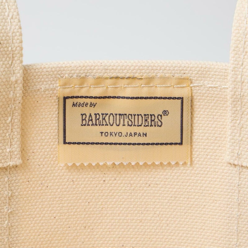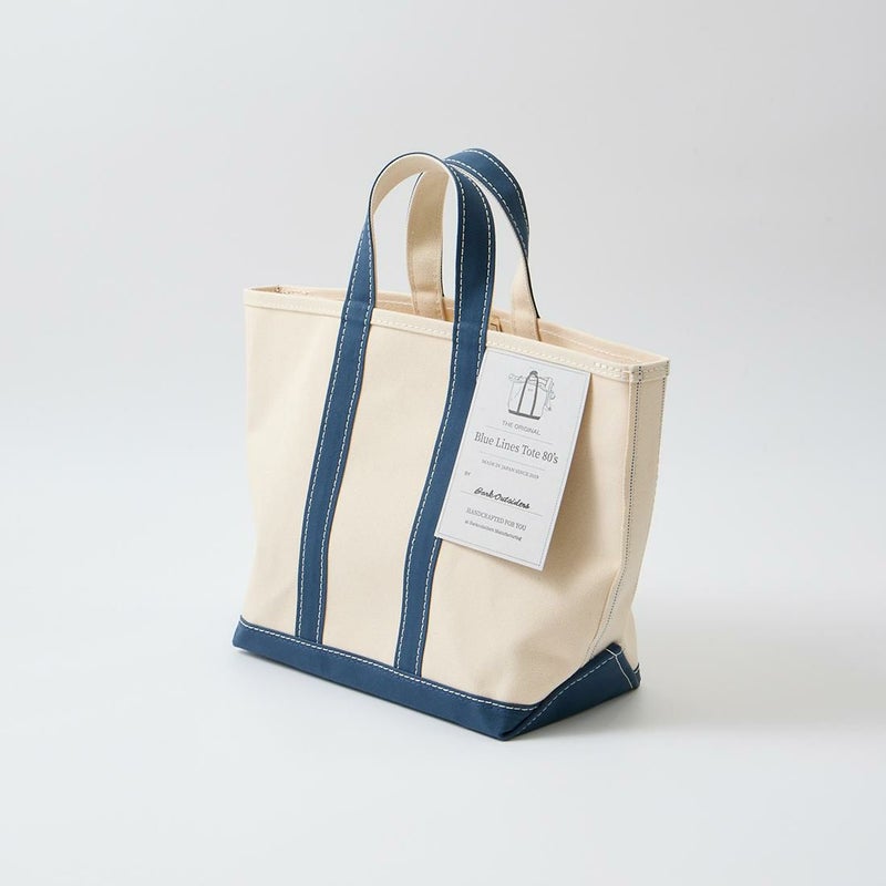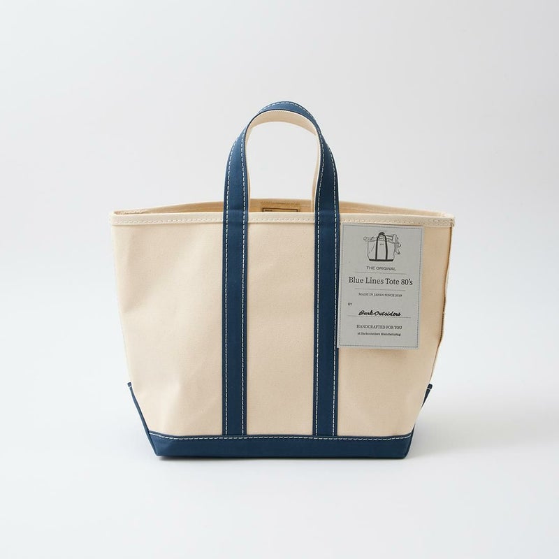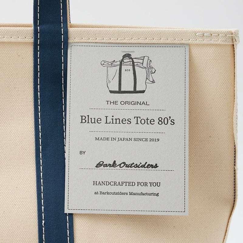 Barkoutsiders(バークアウトサイダーズ)のBLUE LINES TOTE 80's MEDIUM。国産の老舗キャンバスメーカーに特注した24ozパラフィン帆布を使用したキャンバストート。80年代のキャンバストート独特の雰囲気を日本の生産背景を活かして再現。狭幅のショートハンドル、サイドのブルーライン、現行よりボディの背が少し高かったフォルムなど細かい部分まで拘ったトート。スタイルを選ばないデザイン。経年変化も楽しみな逸品。