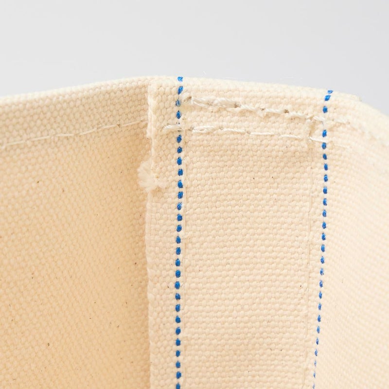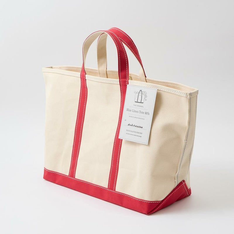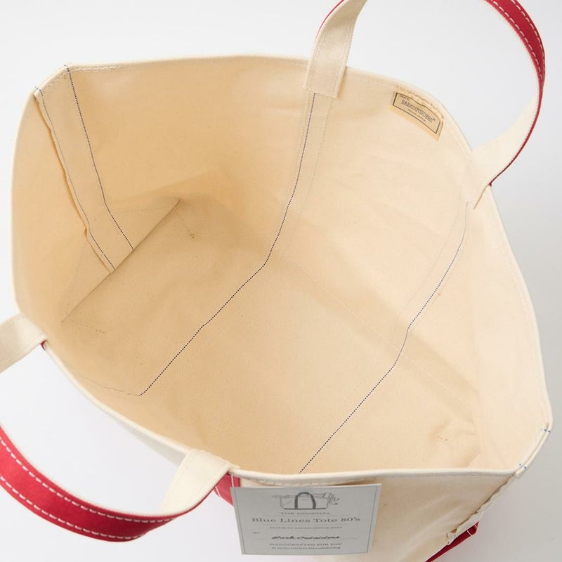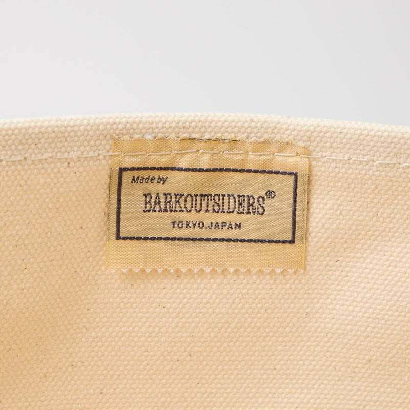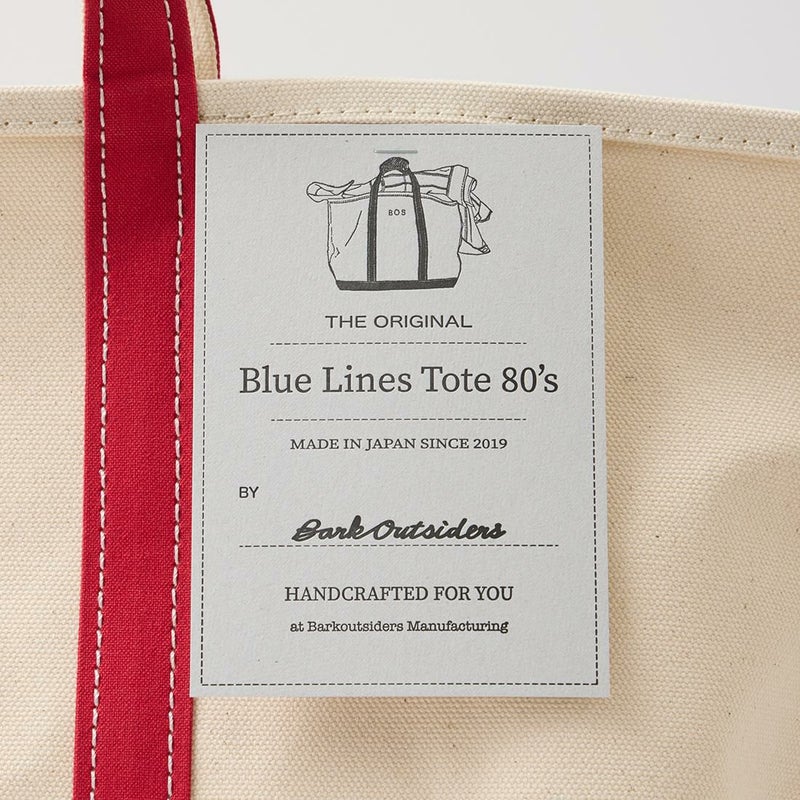 Barkoutsiders(バークアウトサイダーズ)のBLUE LINES TOTE 80's LARGE。国産の老舗キャンバスメーカーに特注した24ozパラフィン帆布を使用したキャンバストート。80年代のキャンバストート独特の雰囲気を日本の生産背景を活かして再現。狭幅のショートハンドル、サイドのブルーライン、現行よりボディの背が少し高かったフォルムなど細かい部分まで拘ったトート。スタイルを選ばないデザイン。経年変化も楽しみな逸品。