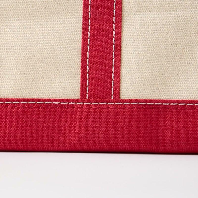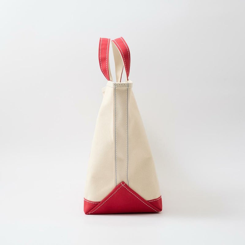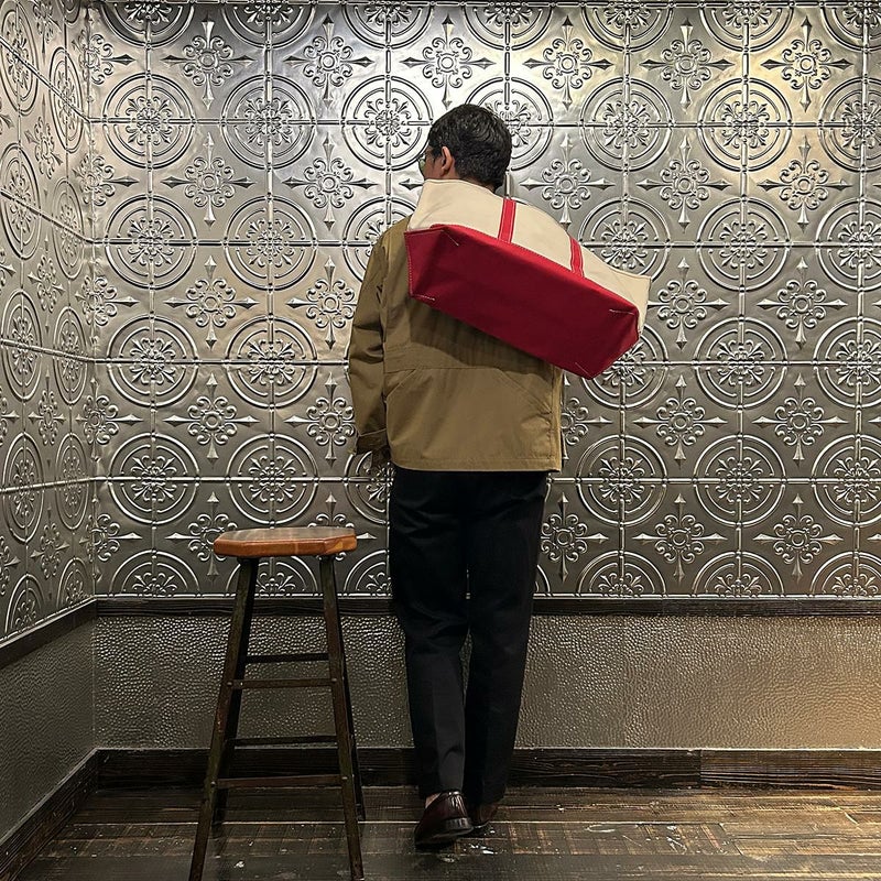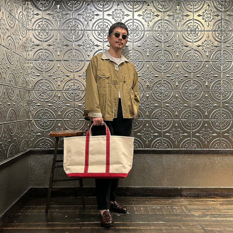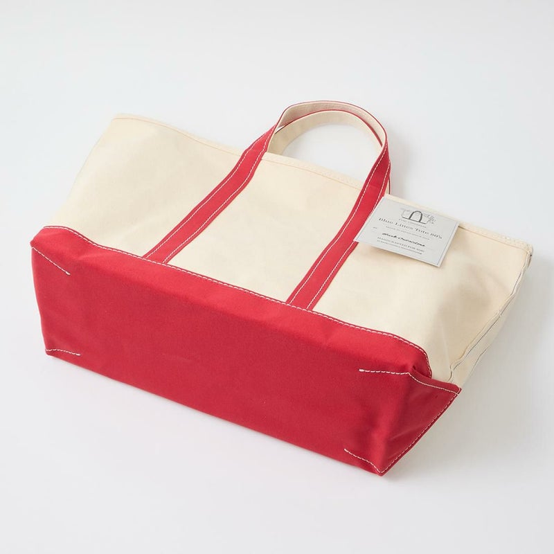 Barkoutsiders(バークアウトサイダーズ)のBLUE LINES TOTE 80's LARGE。国産の老舗キャンバスメーカーに特注した24ozパラフィン帆布を使用したキャンバストート。80年代のキャンバストート独特の雰囲気を日本の生産背景を活かして再現。狭幅のショートハンドル、サイドのブルーライン、現行よりボディの背が少し高かったフォルムなど細かい部分まで拘ったトート。スタイルを選ばないデザイン。経年変化も楽しみな逸品。