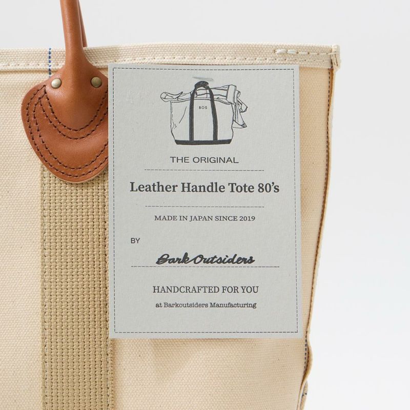 Barkoutsiders(バークアウトサイダーズ)のLEATHER HANDLE TOTE 80s MEDIUM。国産の老舗キャンバスメーカーに特注した24ozパラフィン帆布を使用したレザーハンドルのキャンバストート。80年代のキャンバストート独特の雰囲気を日本の生産背景を活かして再現。ハンドルのレザーは姫路で作られている革。忠実な質感のものにする為、当時の革の染色方法から考えてより良いものをセレクト。スタイルを選ばないデザイン。経年変化も楽しみな逸品。