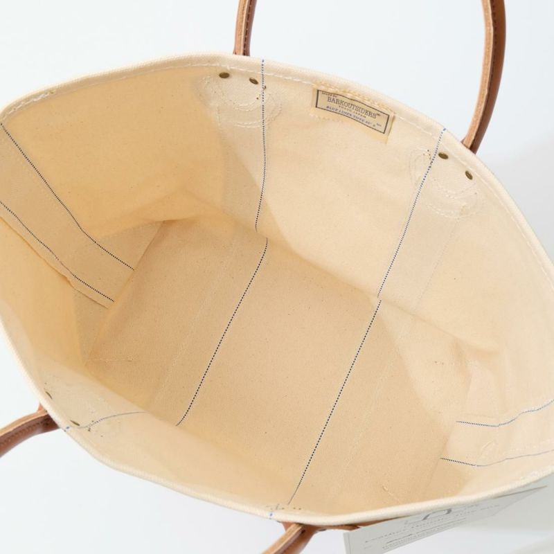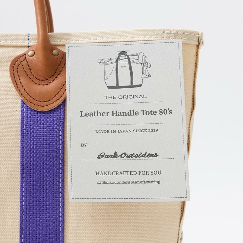 Barkoutsiders(バークアウトサイダーズ)のLEATHER HANDLE TOTE 80s MEDIUM。国産の老舗キャンバスメーカーに特注した24ozパラフィン帆布を使用したレザーハンドルのキャンバストート。80年代のキャンバストート独特の雰囲気を日本の生産背景を活かして再現。ハンドルのレザーは姫路で作られている革。忠実な質感のものにする為、当時の革の染色方法から考えてより良いものをセレクト。スタイルを選ばないデザイン。経年変化も楽しみな逸品。