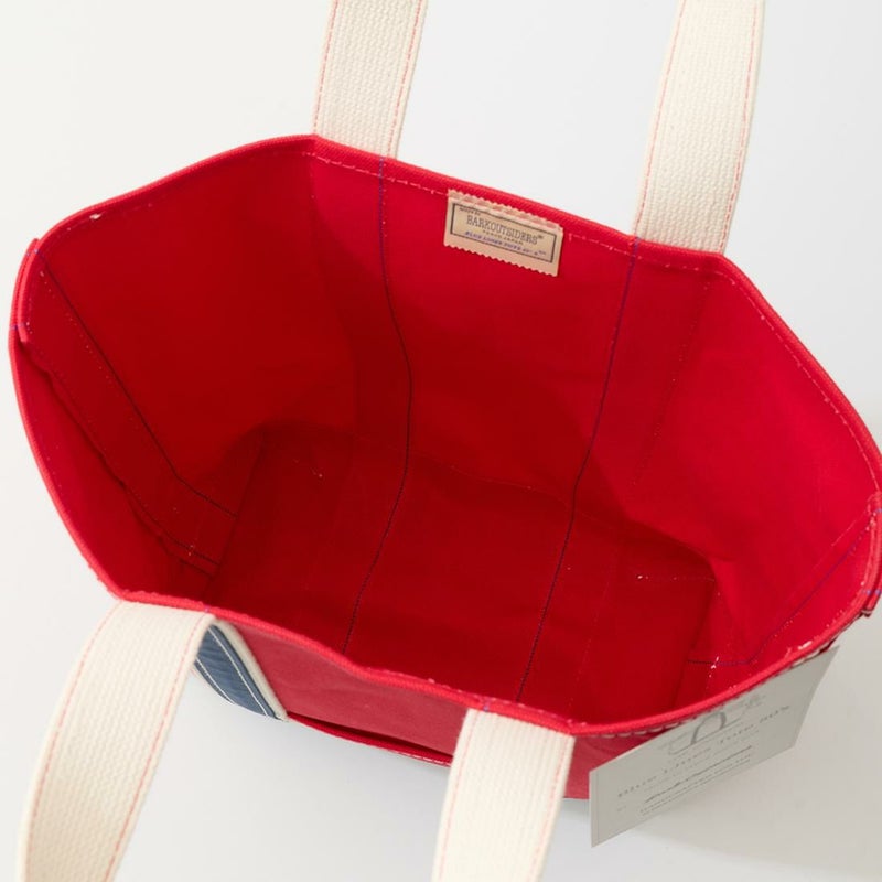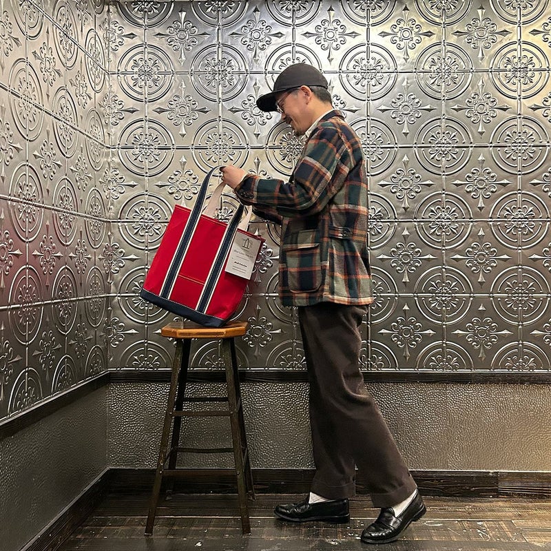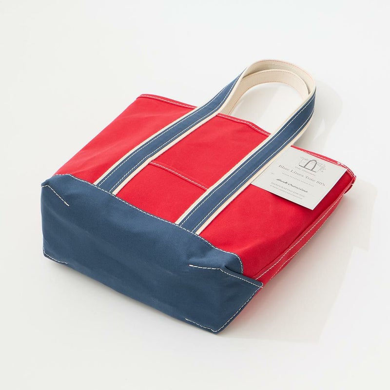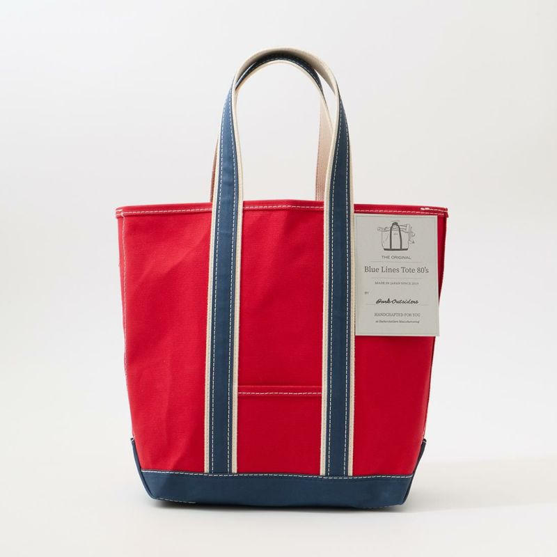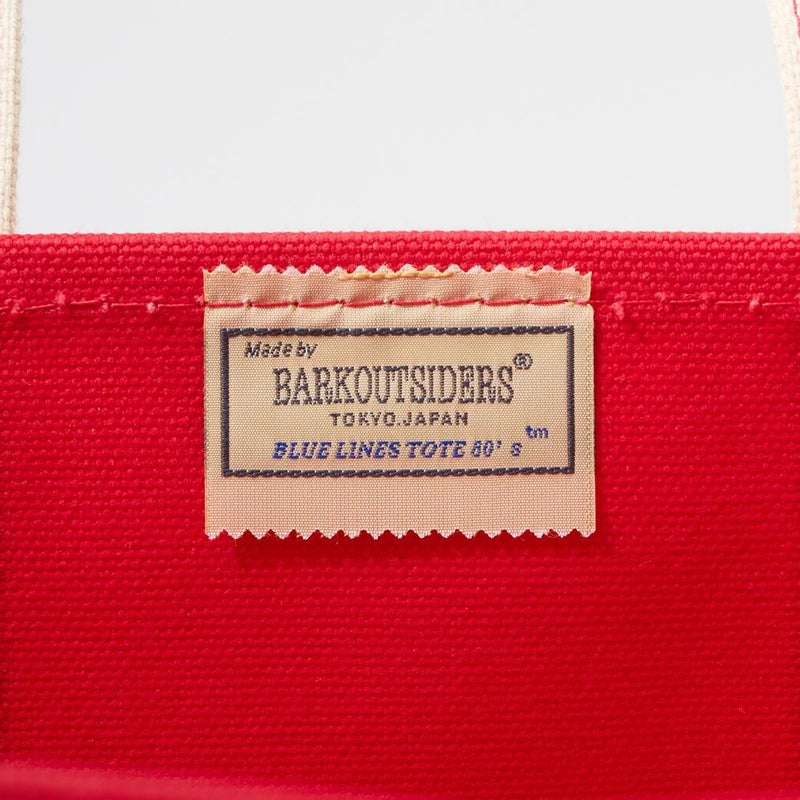 Barkoutsiders(バークアウトサイダーズ)のBLUE LINES TOTE 80's DX TALL LIMITED。80年代DXモデルの復刻版。耳付きシャトル織機で織られた別注ブルーラインキャンバスを使用したトートバック。80年代のキャンバストート独特の雰囲気を日本の生産背景を活かして再現。コットンテープを挟み込んだデラックス仕様。現存しない 4.5号帆布相当の特注高密度キャンバス。 80年代のTALLサイズを忠実に再現。総生産数が限定40個、店頭販売のみのスペシャルモデル。