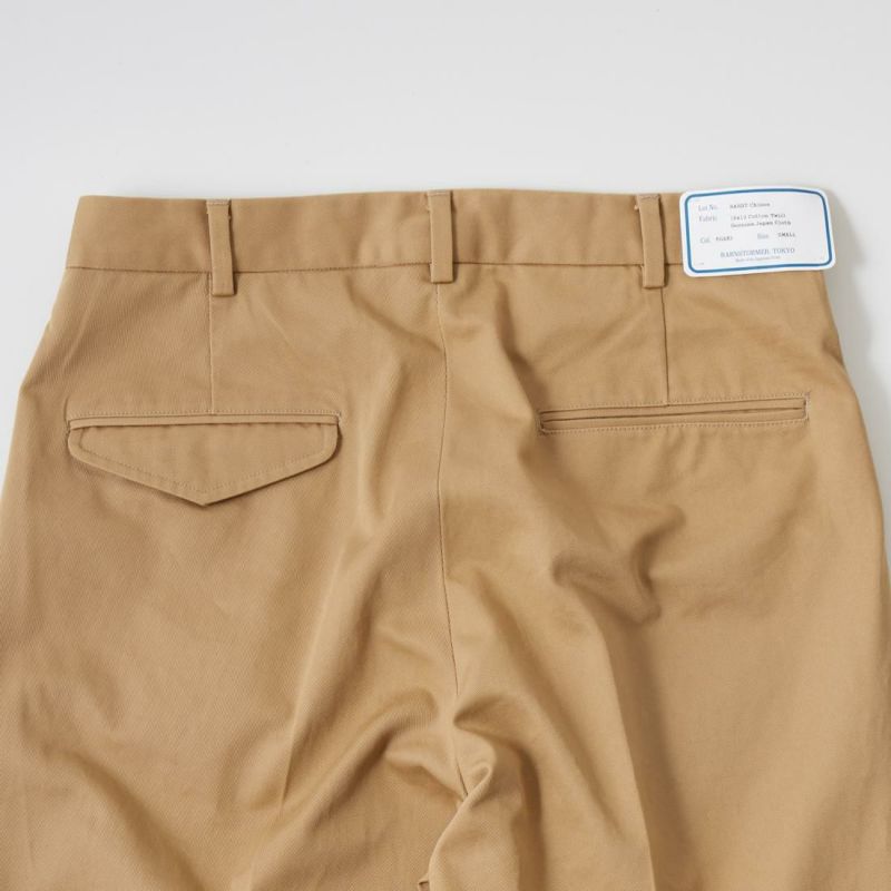 BARNSTORMER(バーンストーマー)の"BARRY" COTTON TWILL CHINO TROUSER。当店別注モデルのバリー。某アメリカの有名ブランドのチノをベースにアレンジを加えて型から完全別注。フロントはカジュアルさを演出する為にアウトタック仕様でゆとりのある腰回りに。ボトムに向かって緩やかにテーパード。股上、ワタリ、裾幅まで細かい修正を何度も繰り返した渾身の一本。着用するスタイルを選ばない穿き易いシルエット。前立てはジップフロント、バックポケットは向かって左側がフラップ付きポケット。右側はフラップなし。アメリカのチノパンブランドを彷彿とさせる紙のフラッシャーも別注のポイント。素材はコットンチノツイル。裾は裾上げされていない未処理(フラシ)状態。着用時には裾上げが必要になります。