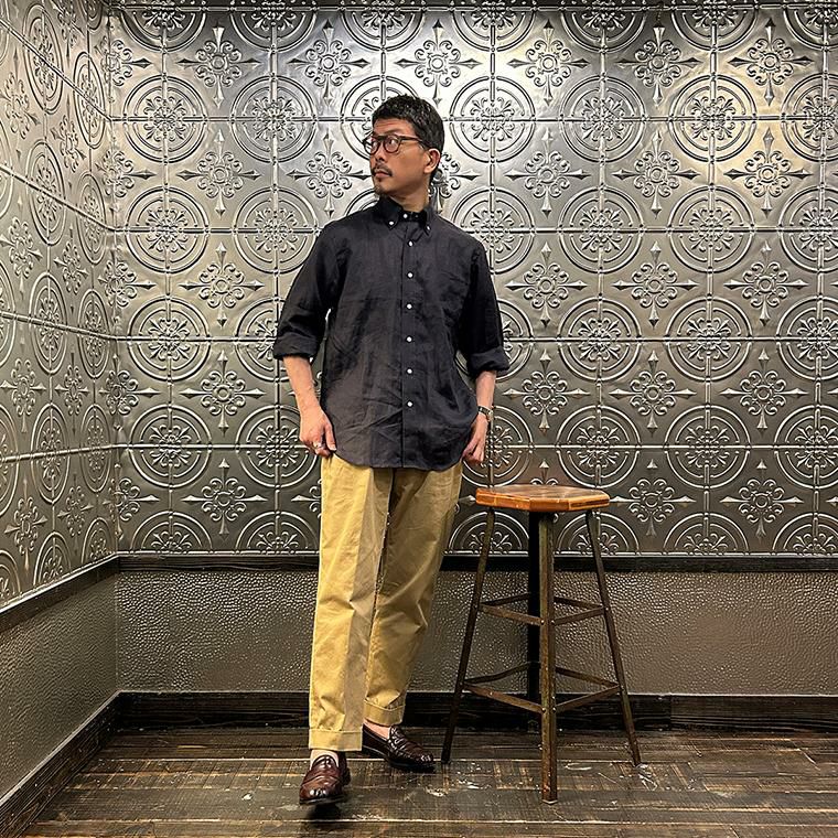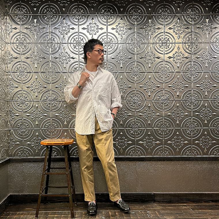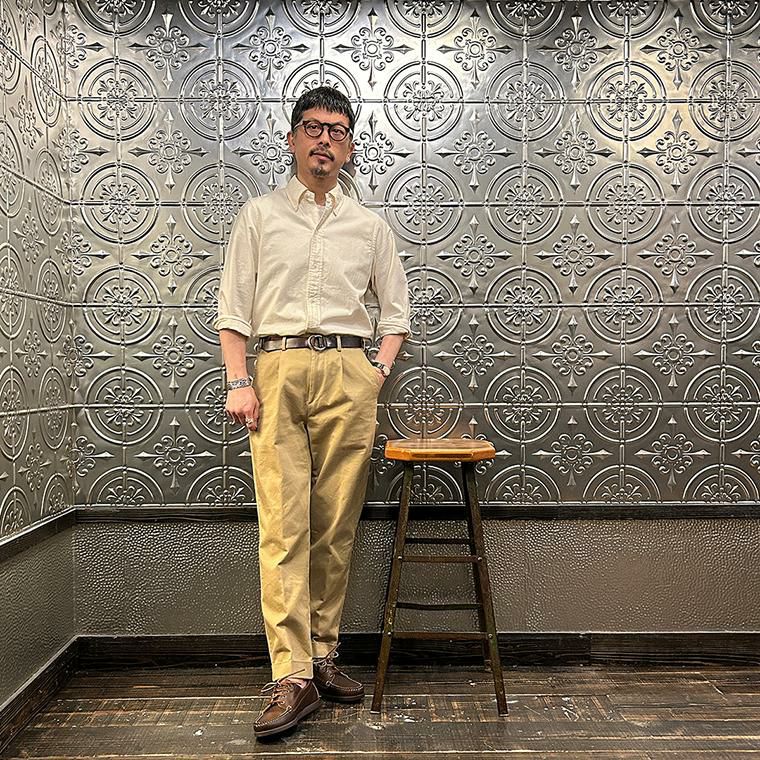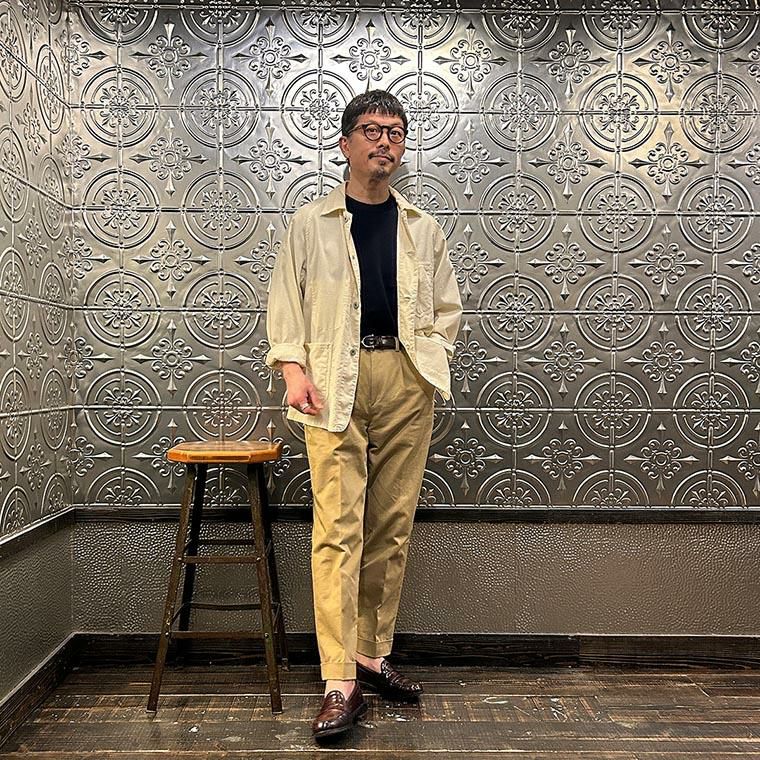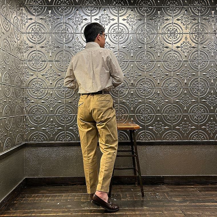 172センチ60キロでサイズは「M」を着用しています。少しウェストにゆとりはあります。「S」でも穿けない事はないのですがウェストがかなりギリギリなので「M」サイズが適正サイズだと思っています。自身の所有しているチノをベースに作ってもらった別注。申し訳ない位サンプルの修正を何度もして頂きようやく完成した一本。往年のアメリカンチノの雰囲気(いい意味で「いなたい」)を残しつつ、今の気分で穿けるモノが欲しかった。