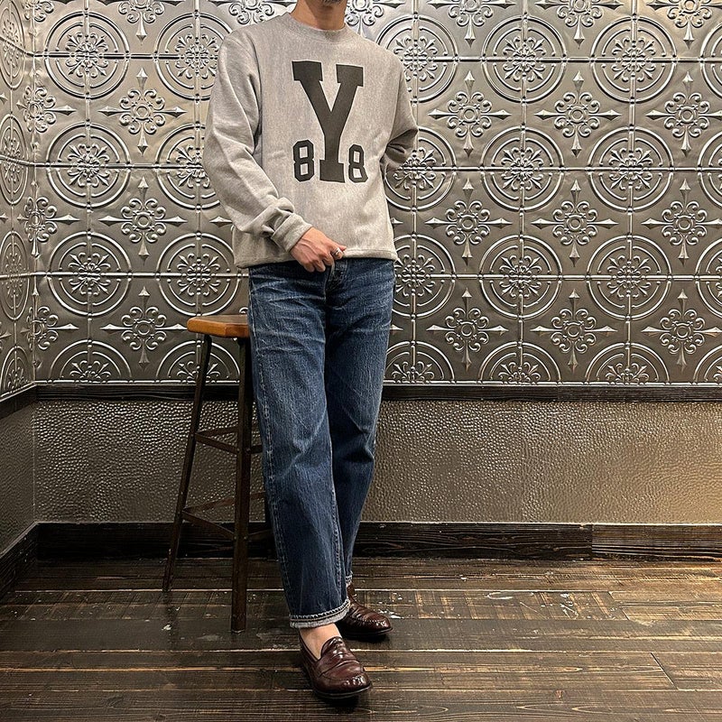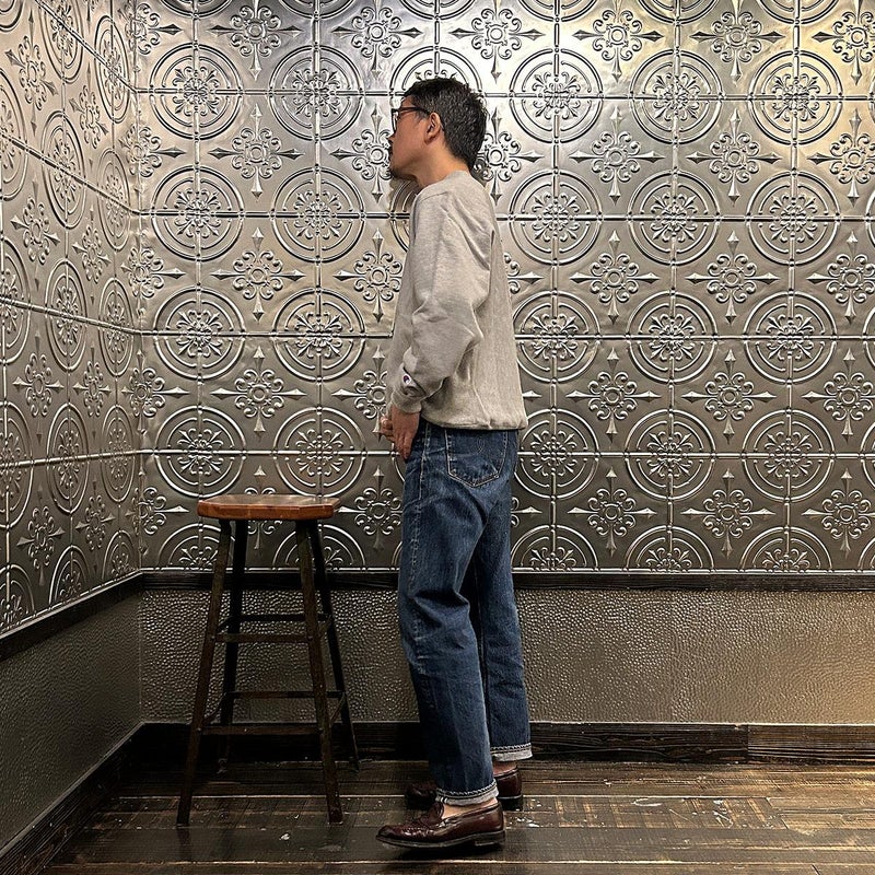 170センチ68キロで「M」でゆったりとしたサイズ感です。アメリカ規格のチャンピオンボディを使用したゆったり目のサイジング。単品でもインナーとしても楽しめる着回しの良いプリントデザイン。着続けていくことで経年変化も期待できる1着です。