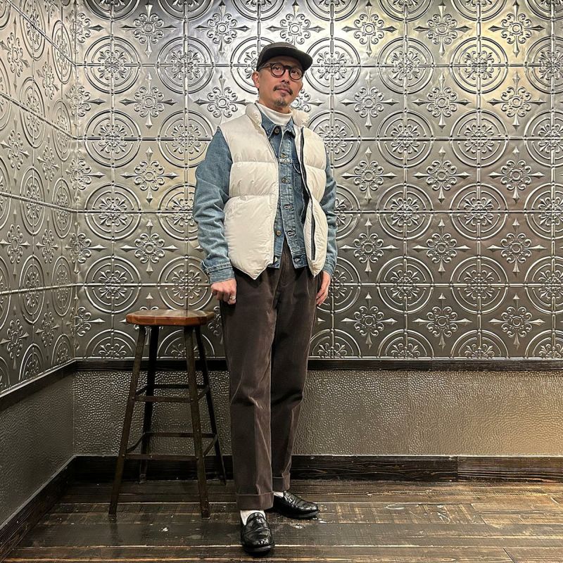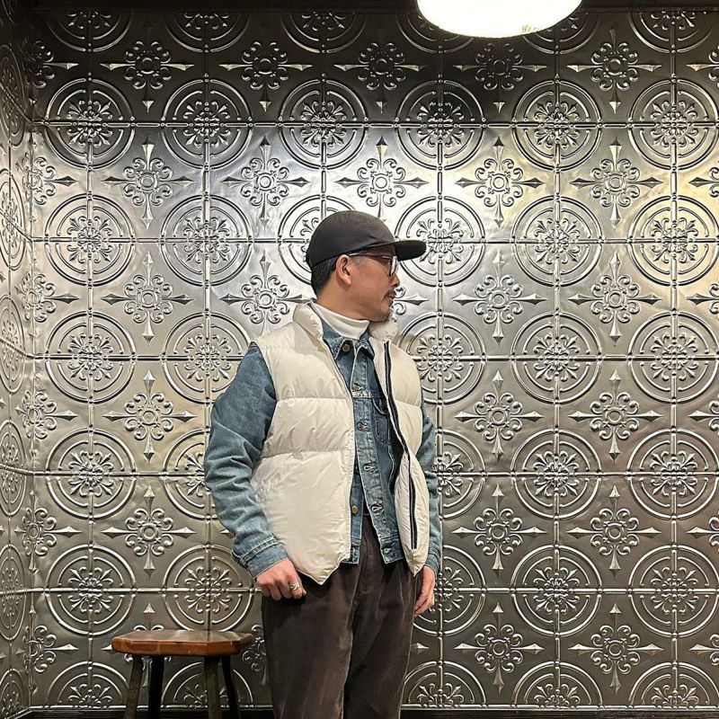 170センチ68キロやや肩幅広めの私の体型でLサイズで個人的には丁度良いサイズ感です。インナーに地厚めのスウェット、ジャケットの上に羽織っても身幅は若干ゆとりのある着用感です。個人的に大好きなノースバイノースウェストのダウンベスト。軽くて着易さ抜群。それでいて防寒性に優れた1着。それにインナーダウンベストとしても着回しできるとあって、なにかと持っていて損はしない便利なアイテム。それこそスタイリングを選ばないほど使い勝手の良いアイテムですから、ついつい色違いで欲しくなってしまいますね。