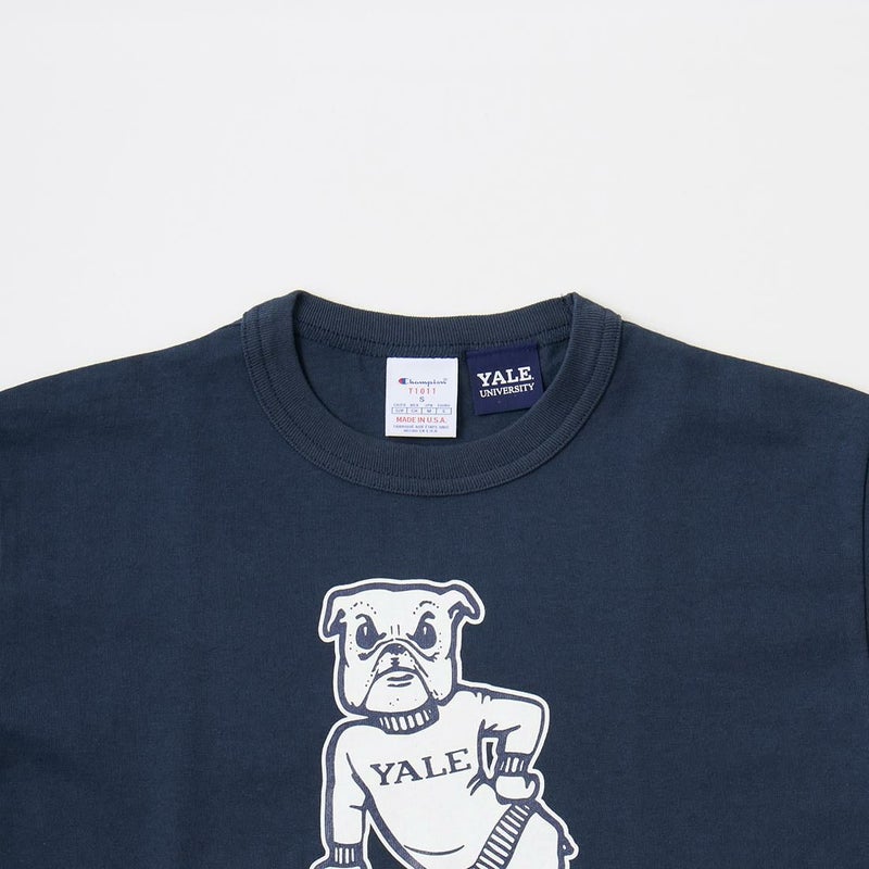 CHAMPION(チャンピオン)のT-1011 S/S US PRINT T SHIRT YALE。ヘビーウェイトTシャツの代名詞 T1011(ティーテンイレブン)をボディに使用したプリントTシャツ。バインダーネック仕様。サイドに縫製がない丸胴仕様。USコットン特有のドライタッチの生地。セットインスリーブ。洗い込むことで感じられるタフさにファンも多い逸品。こちらはアイビーリーグの一つに名を連ねるアメリカの名門校「イェール大学」の公式ライセンスプリントを施したモデル。