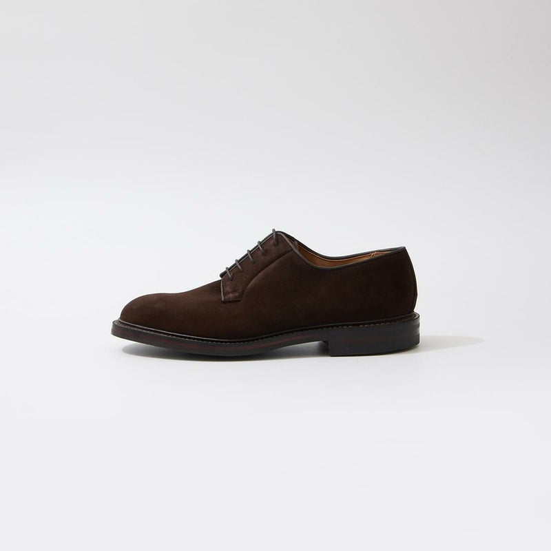 イギリス発「CROCKET&JONES(クロケットアンドジョーンズ)」のLANARK 3 Dainite Sole。シンプルなプレーントゥダービーシューズ。外羽根の取り付けにはステッチが表に出ないブラインドシームを施してパーツやステッチの主張を最小限に抑えた仕上がり。ボリュームのあるラウンドトゥを持つ【ラスト378】は、足幅の広い方にも適した設計で、前足部にゆとりを持たせつつ、バックパートにはしっかりフィットする新設計のヒールカップを採用。ソールは英国 Harboro Rubber Company のダイナイトスタッズソールをストームウエルトと組み合わせることでソール周りに重厚感を演出。アッパーには柔らかな印象を持つ上質なスエード素材を採用。なめし工程で防水加工が施され、高いレベルの耐水性を確保。クラシックなシルエットながらも様々なスタイル、シーンに適用できる1足。