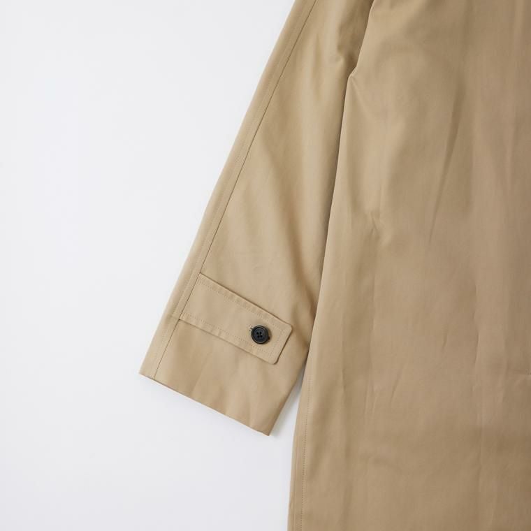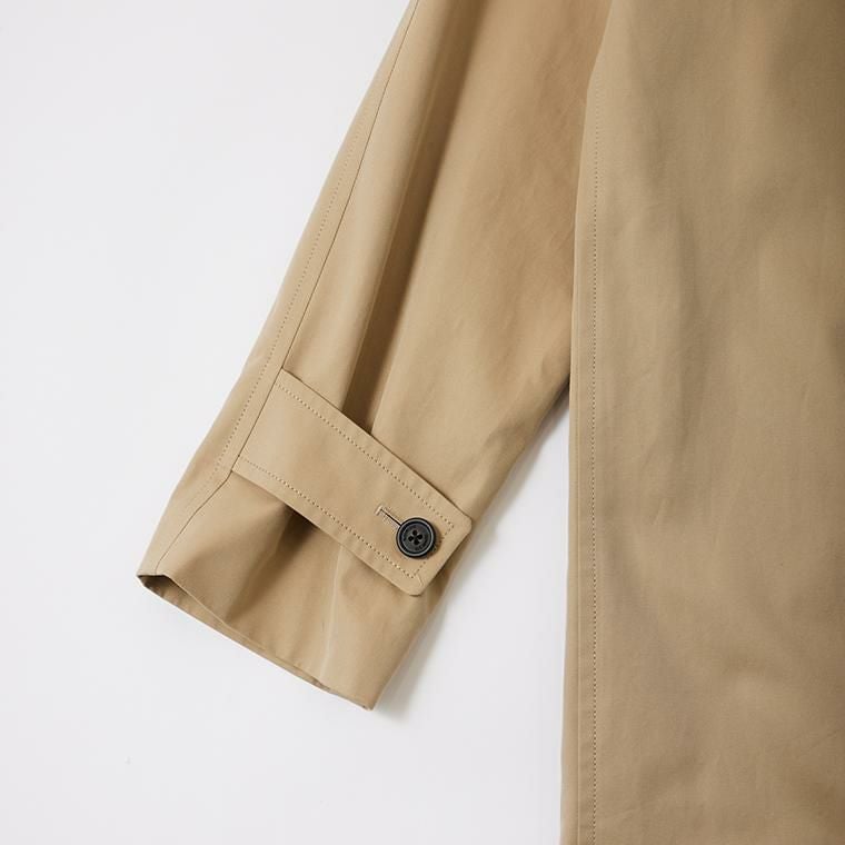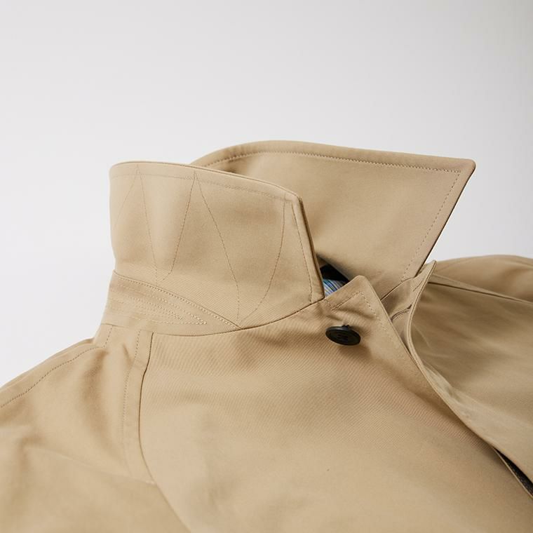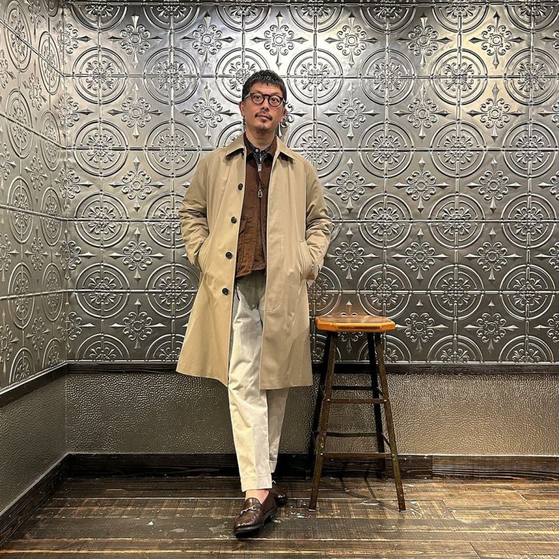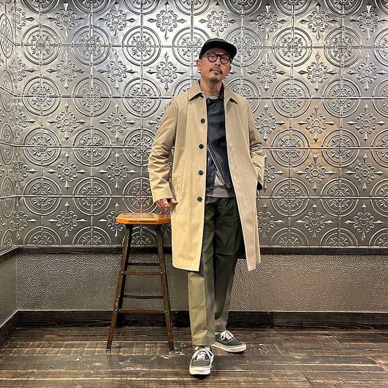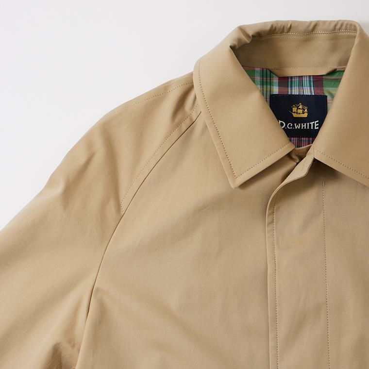 国内ブランド「D.C. WHITE」(ディーシーホワイト)のBALMACAAN COAT。24SS アルティメット(究極の)コレクションアイテム。スコットランド・ハイランド地方のバルマカーンという地名に由来すると言われている襟腰の後方が高く、前方に向かって低い状態で折り返る襟が特徴のバルマカーンコート。2枚袖のラグランスリーブ仕様で体に沿うナチュラルなシルエットが拘りのポイント。ライニングはオリジナルファブリックのマドラスチェック、刻印入りの水牛ボタンも良い雰囲気。素材には1893年創業の綿織物の工場で作られた先染め70番双糸のギャバジン素材。撥水、耐水、防風に加えて退色しづらいスレン染料(汗や水に強い)で染色した特徴的な素材。緩めのAラインシルエットが上品な雰囲気のコート。