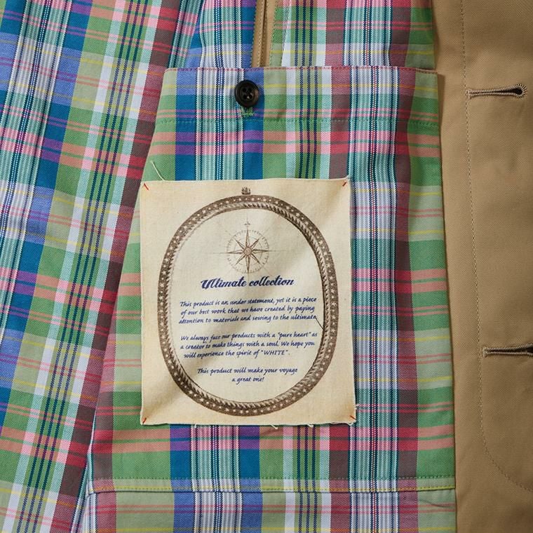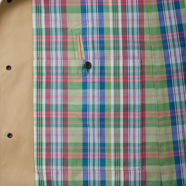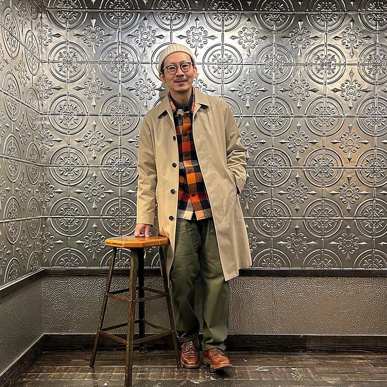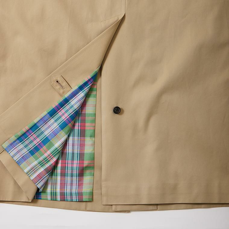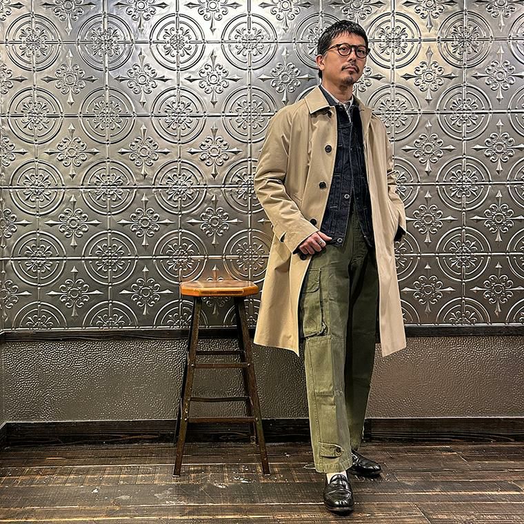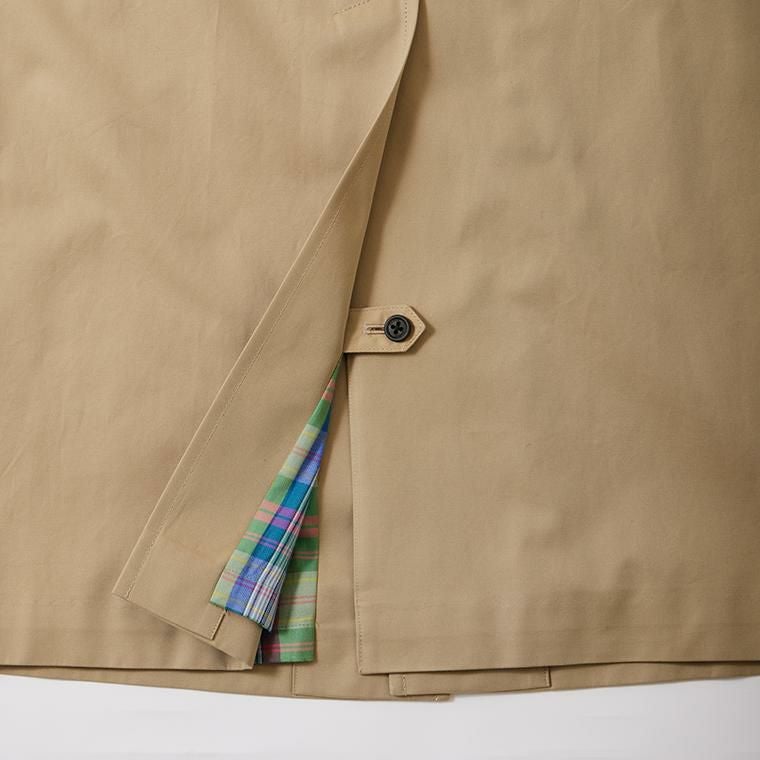 国内ブランド「D.C. WHITE」(ディーシーホワイト)のBALMACAAN COAT。24SS アルティメット(究極の)コレクションアイテム。スコットランド・ハイランド地方のバルマカーンという地名に由来すると言われている襟腰の後方が高く、前方に向かって低い状態で折り返る襟が特徴のバルマカーンコート。2枚袖のラグランスリーブ仕様で体に沿うナチュラルなシルエットが拘りのポイント。ライニングはオリジナルファブリックのマドラスチェック、刻印入りの水牛ボタンも良い雰囲気。素材には1893年創業の綿織物の工場で作られた先染め70番双糸のギャバジン素材。撥水、耐水、防風に加えて退色しづらいスレン染料(汗や水に強い)で染色した特徴的な素材。緩めのAラインシルエットが上品な雰囲気のコート。