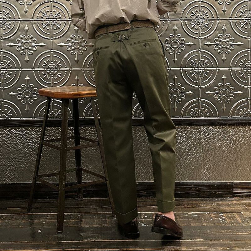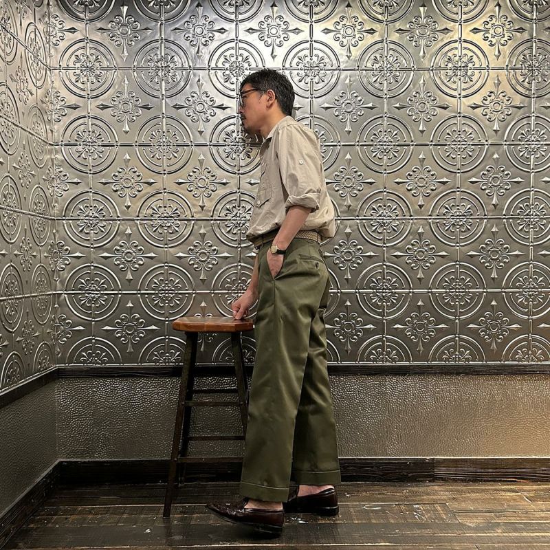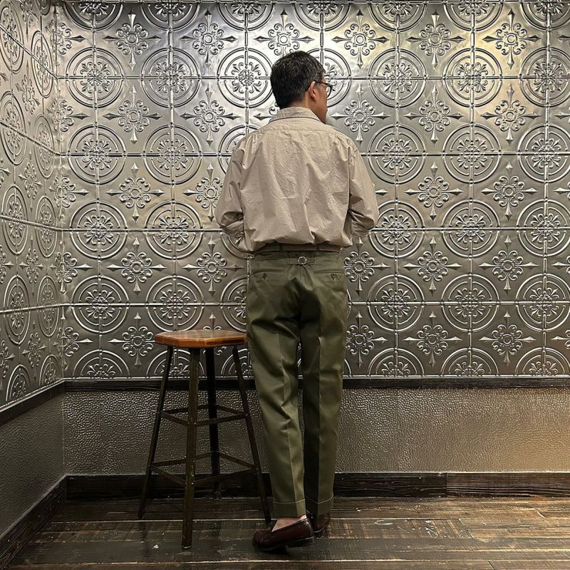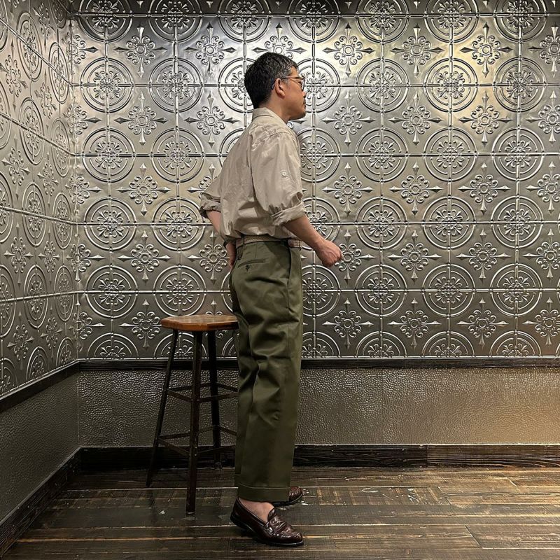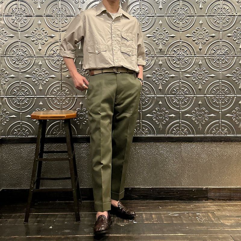172センチ60キロで「46」でウェストに少しゆとりのあるサイズ感です。普段は30インチを基準にパンツを穿いています。「44」でも穿けるのですがシルエット的に「46」ぐらいの方が好みだったので自分が穿くのであれば「46」を選びます。背面の尾錠を締めればウェストが少し緩くてもお尻の上部分で引っかかる感覚で特に問題はありません。同ブランドの定番のアメリカントラウザーは直線と曲線のバランスが非常に良いパンツ。いい意味での大量生産時代のアメリカのトラウザーズのイメージでしょうか。年間通して穿けるベーシックチノ。