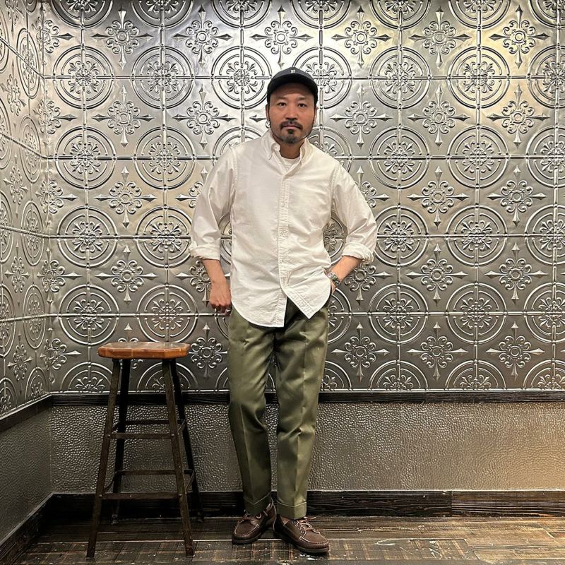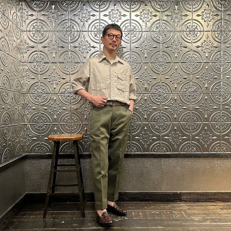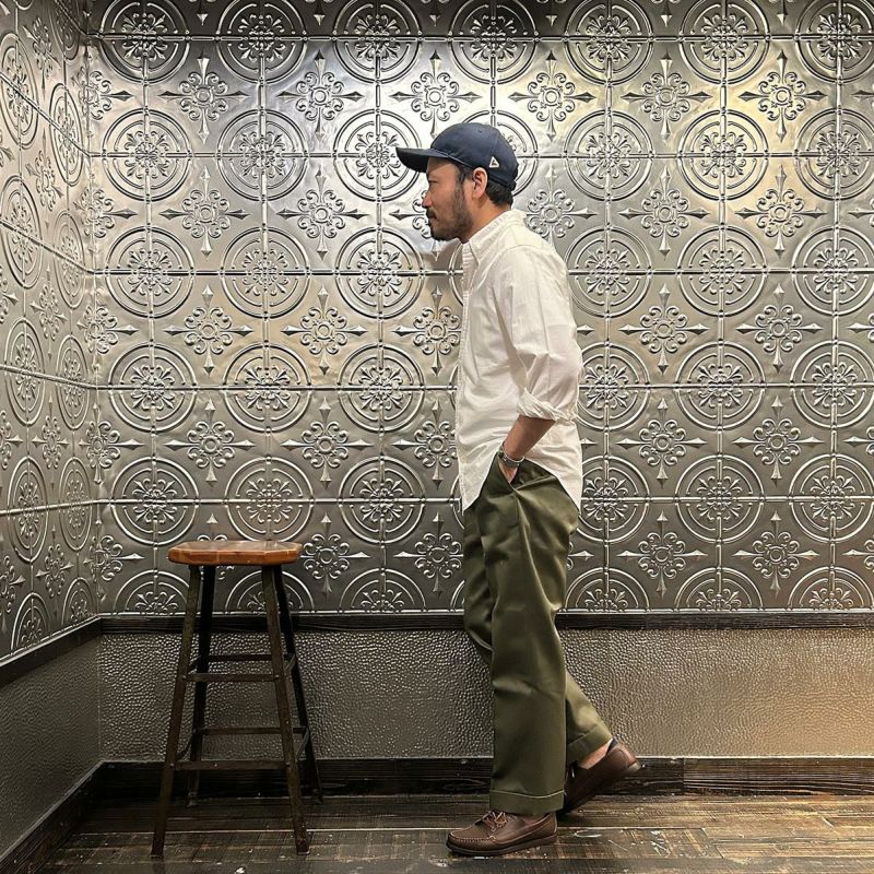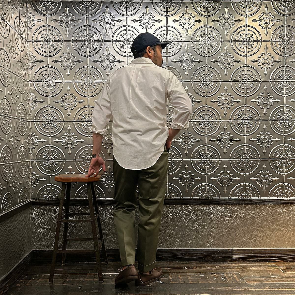 172センチ60キロで「46」でウェストに少しゆとりのあるサイズ感です。普段は30インチを基準にパンツを穿いています。「44」でも穿けるのですがシルエット的に「46」ぐらいの方が好みだったので自分が穿くのであれば「46」を選びます。背面の尾錠を締めればウェストが少し緩くてもお尻の上部分で引っかかる感覚で特に問題はありません。同ブランドの定番のアメリカントラウザーは直線と曲線のバランスが非常に良いパンツ。いい意味での大量生産時代のアメリカのトラウザーズのイメージでしょうか。年間通して穿けるベーシックチノ。