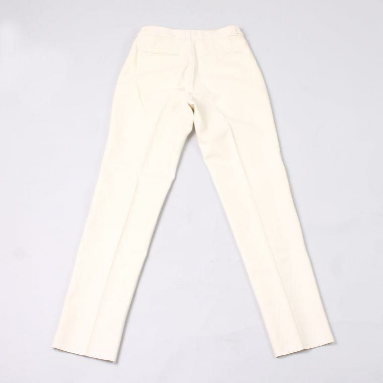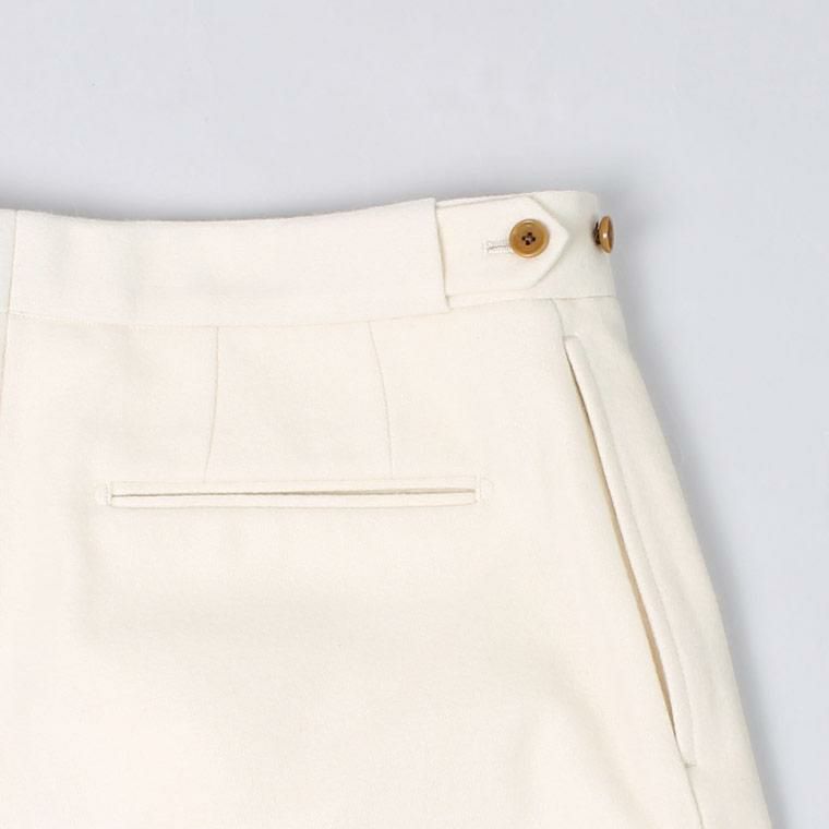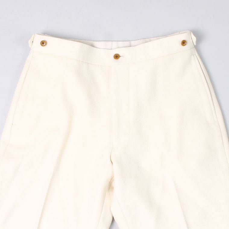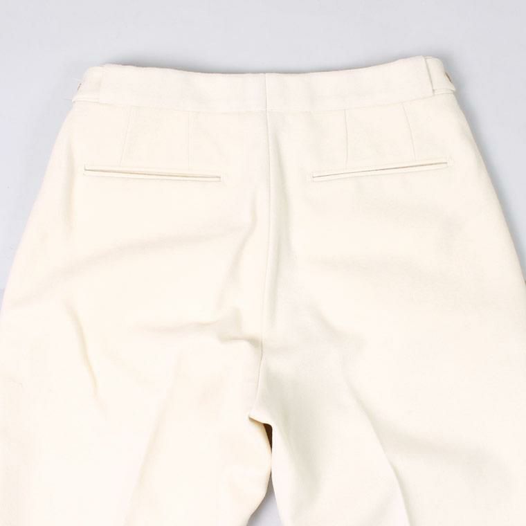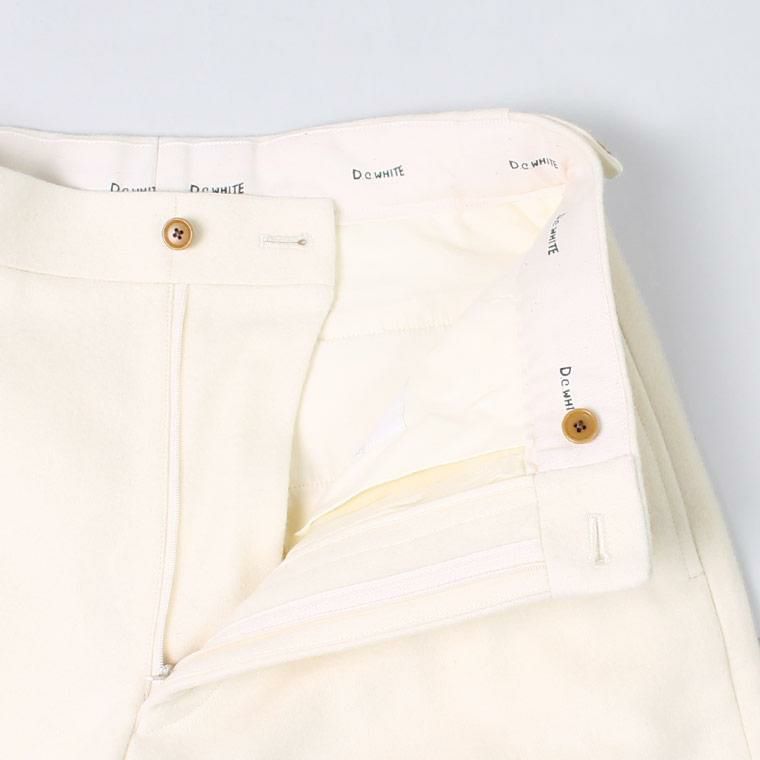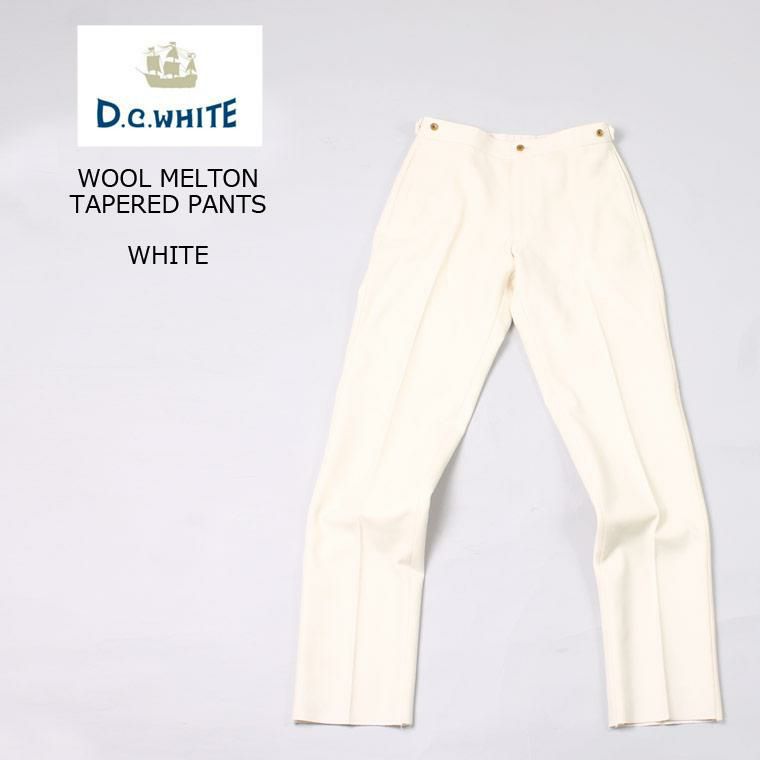 D.C. WHITE(ディーシーホワイト)のWOOL MELTON TAPERED PANTS。ウールメルトン素材を使用したトラウザー。ワタリから裾にかけて緩やかなテーパードが効いた、細すぎず太すぎない綺麗なシルエット。ベルトループなしのサイドアジャスターで着用する仕様。癖のないスタンダードなデザインのトラウザーなので様々なスタイルに対応可能。肉厚のウールメルトン素材を使用しており保温性も高いので寒い冬を快適に過ごして頂ける1本です。