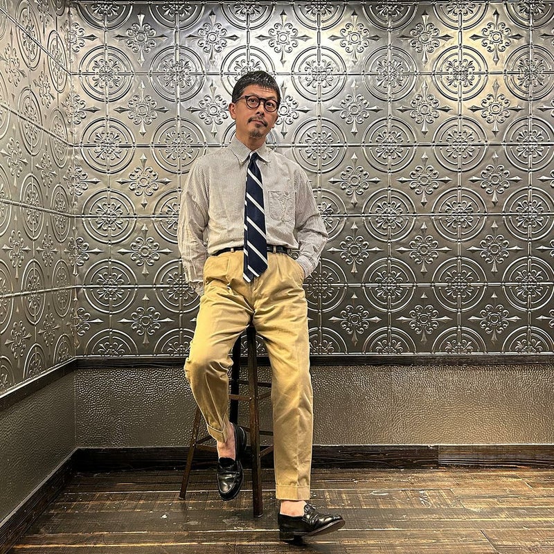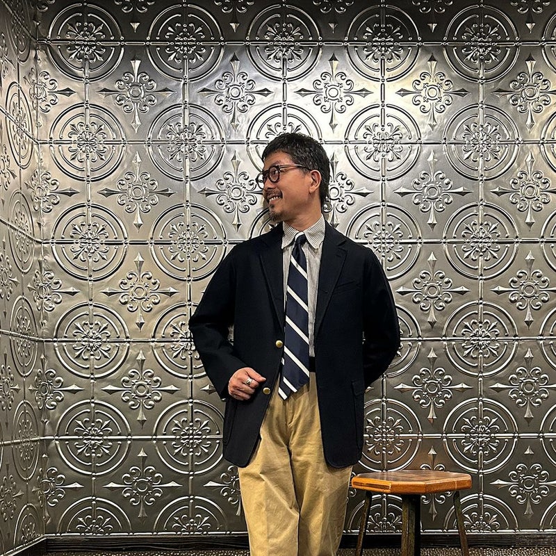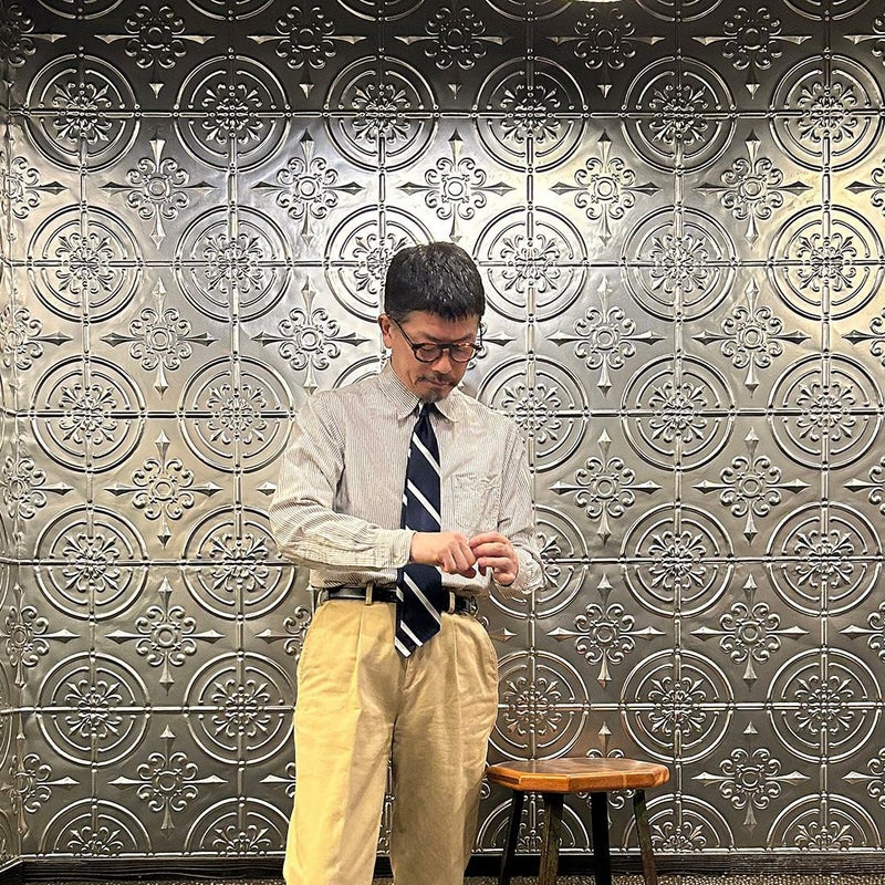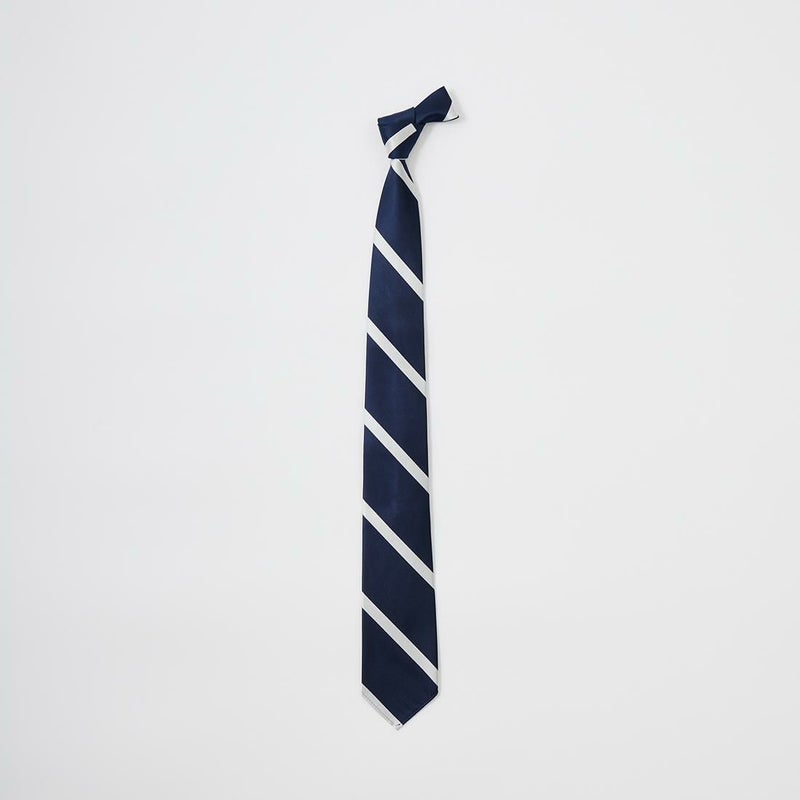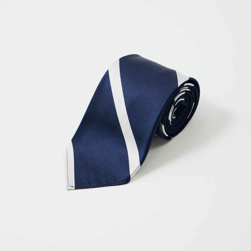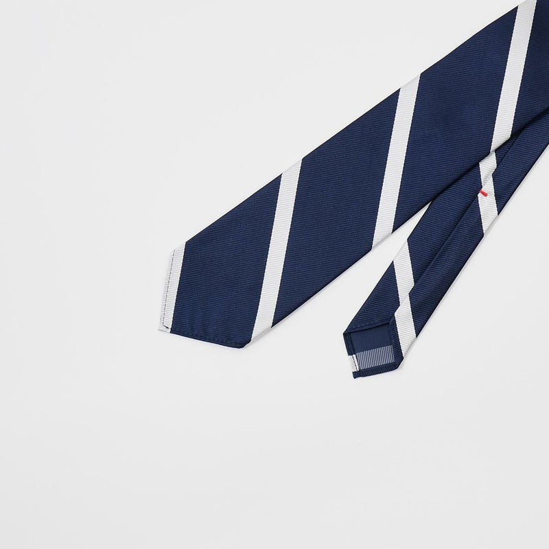 D.C. WHITE(ディーシーホワイト)のCLUB TIE REGIMENTAL。昔、イギリスでスカーフをネクタイにしていた縫製方法を現代的にアレンジし、剣先などのヘム部分をあえてミシンで叩きヴィンテージ感を出した独特な縫製仕様のネクタイ。大剣幅が8センチのスタンダードで使い勝手の良いサイズ。素材はシルクを使用。ツルッとした肌触りで光沢があり上品な雰囲気。レジメンタルは左上がりのアメリカ式。王道のアメリカントラッドブランドやイギリス、イタリアのタイブランドにはない隙間な一本。