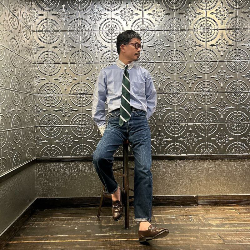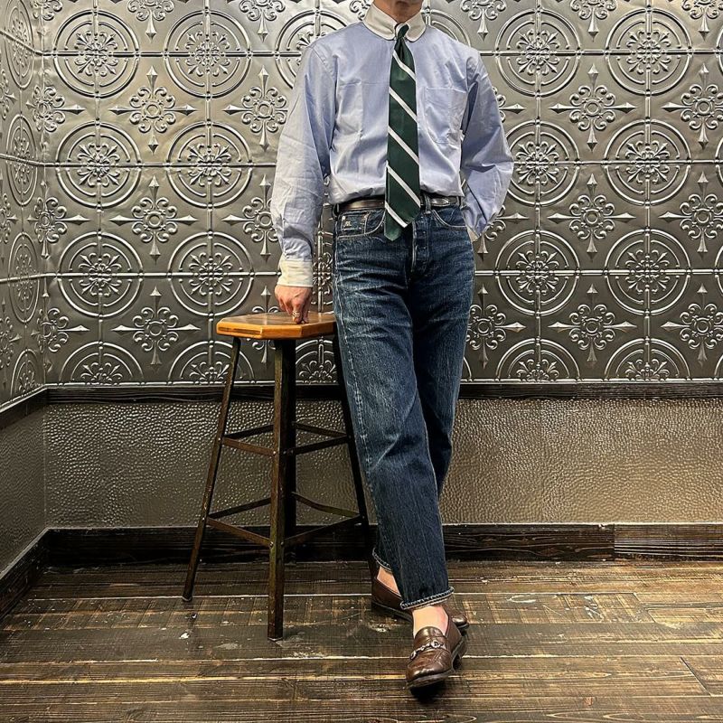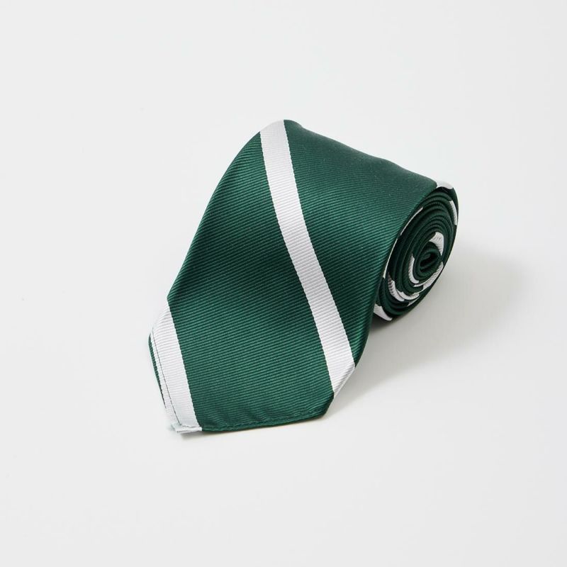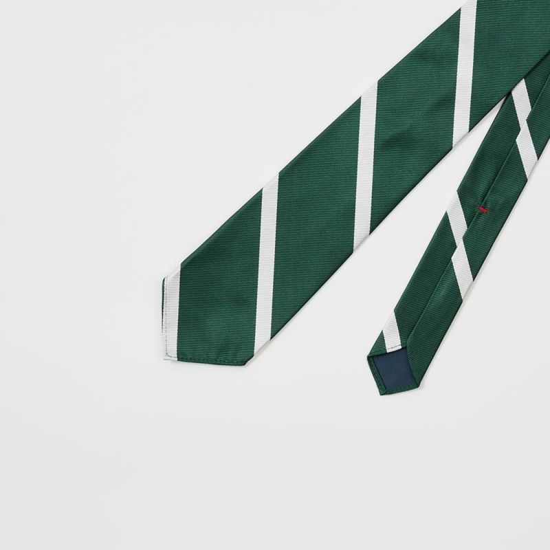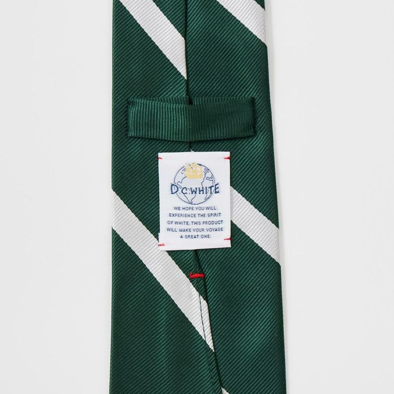 D.C. WHITE(ディーシーホワイト)のCLUB TIE REGIMENTAL。昔、イギリスでスカーフをネクタイにしていた縫製方法を現代的にアレンジし、剣先などのヘム部分をあえてミシンで叩きヴィンテージ感を出した独特な縫製仕様のネクタイ。大剣幅が8センチのスタンダードで使い勝手の良いサイズ。素材はシルクを使用。ツルッとした肌触りで光沢があり上品な雰囲気。レジメンタルは左上がりのアメリカ式。王道のアメリカントラッドブランドやイギリス、イタリアのタイブランドにはない隙間な一本。