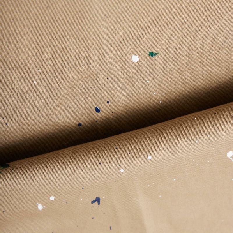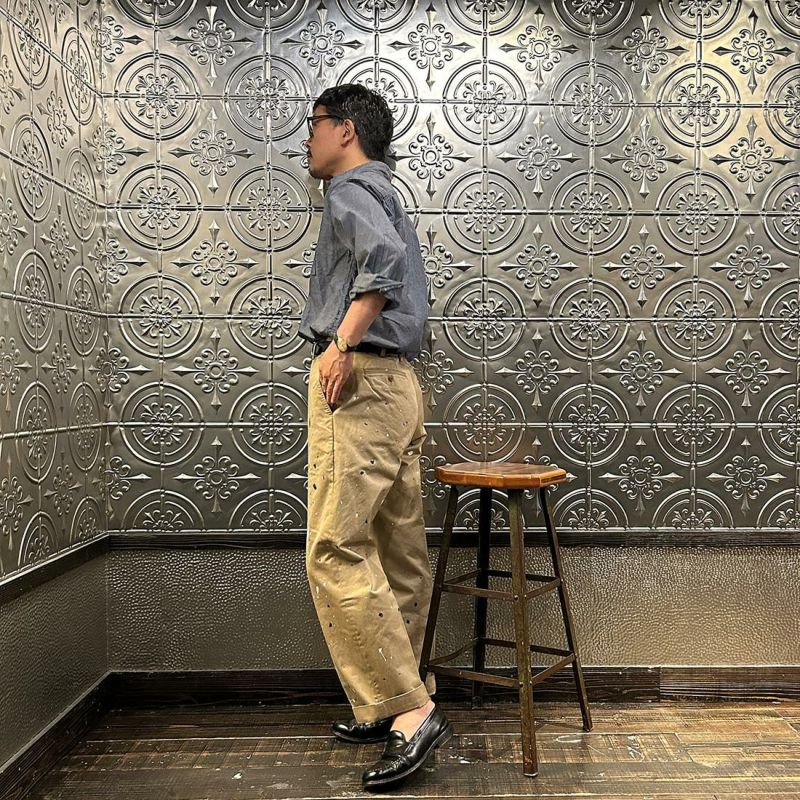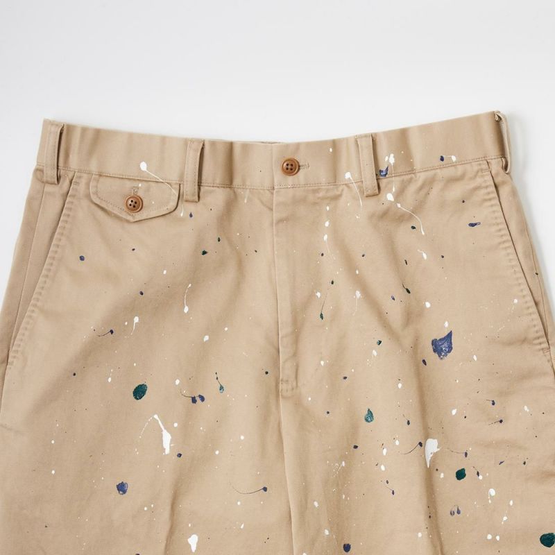 D.C. WHITE(ディーシーホワイト)のPAINTED WEST POINT OFFICER PANTS。デッドストックの通称「ウェポン(ウェストポイントチノクロス)」を使用したチノパンツ。ミリタリーチノでも、ドレスチノでもない、どちらの要素も兼ね備えたスタイリングの幅の広いリラックスフィットのチノパンツ。縫製仕様はウエスト部分にはフラップコインポケット、バックポケットは両玉縁仕上げというドレス仕立ての品のあるスラックス仕様。ペンキの色数をネイビー/グリーン/ホワイトの3色に抑え、ドリップを細かくして、上品な雰囲気に仕上げたペイントチノ。これまでペイントチノを経験されていない方にこそお試しいただきたい1本。