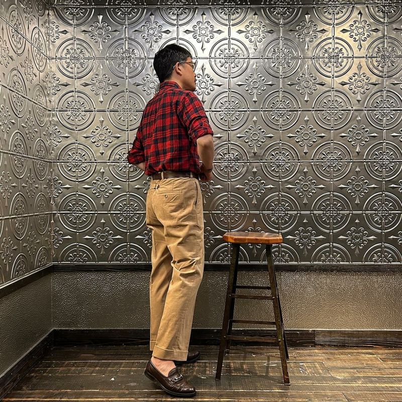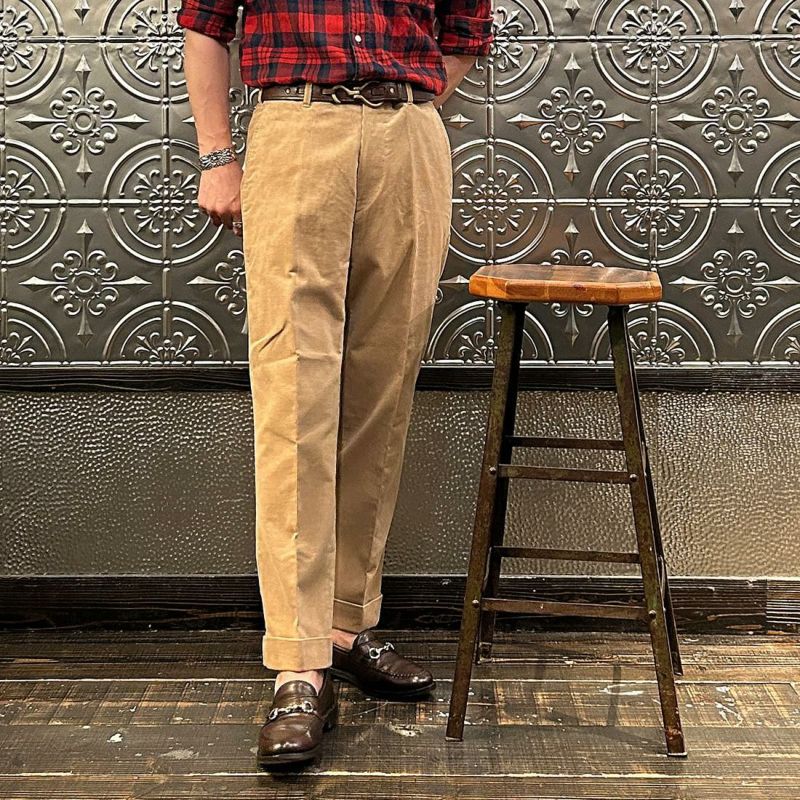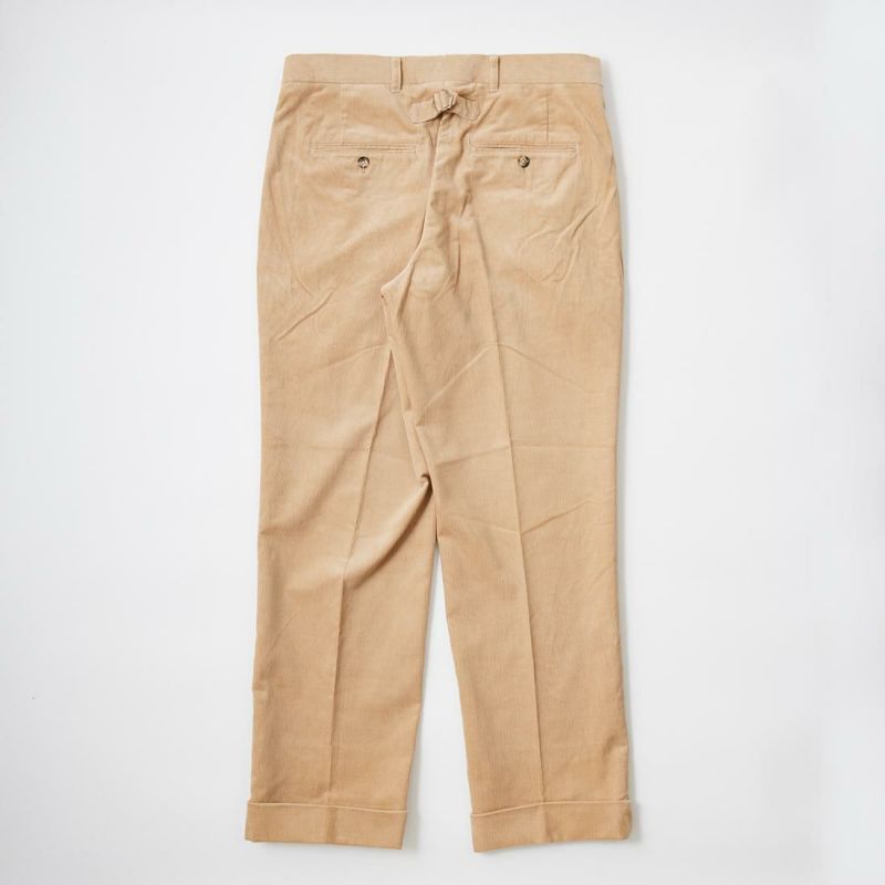 国内ブランドD.C. WHITE(ディーシーホワイト)のCORDUROY AMERICAN TROUSER。古き良きアメリカのトラウザーがデザインソース。凝った前立てや両玉縁のヒップポケット、タコ足つけのベルトループ、バックシンチなどの拘りのディテール。内股、外、ヒップなどを割縫いにすることにより、フラットなドレスパンツをイメージ。素材はイタリアの名門"DUCA VISCONTI"が誇る12ウェールのコーデュロイ。伝統的な"ハンドルカット"技法によって裁断されたこのコーデュロイは繊細な畝と美しい仕上がりそして何よりも絶妙な色彩。