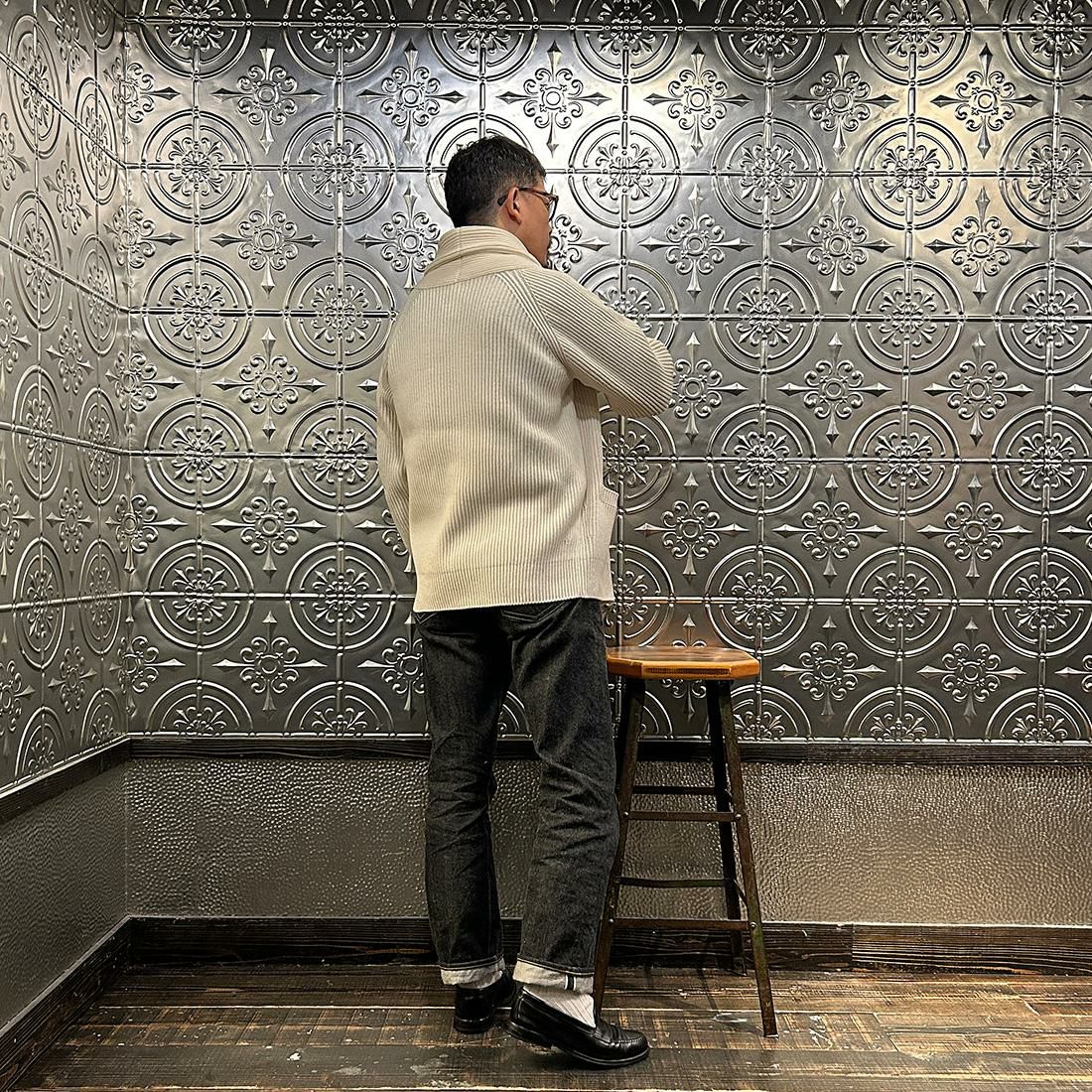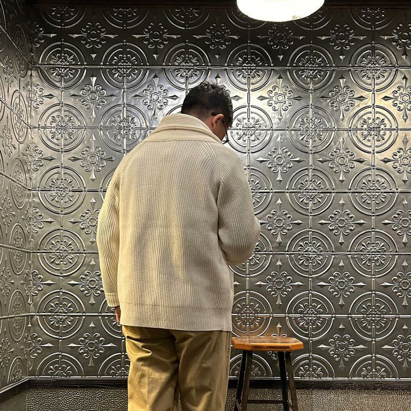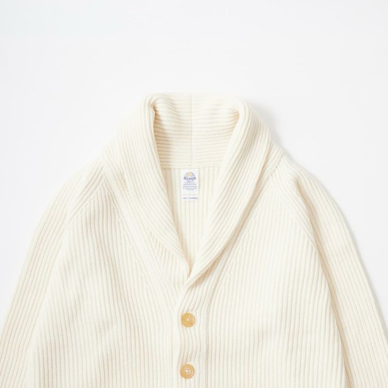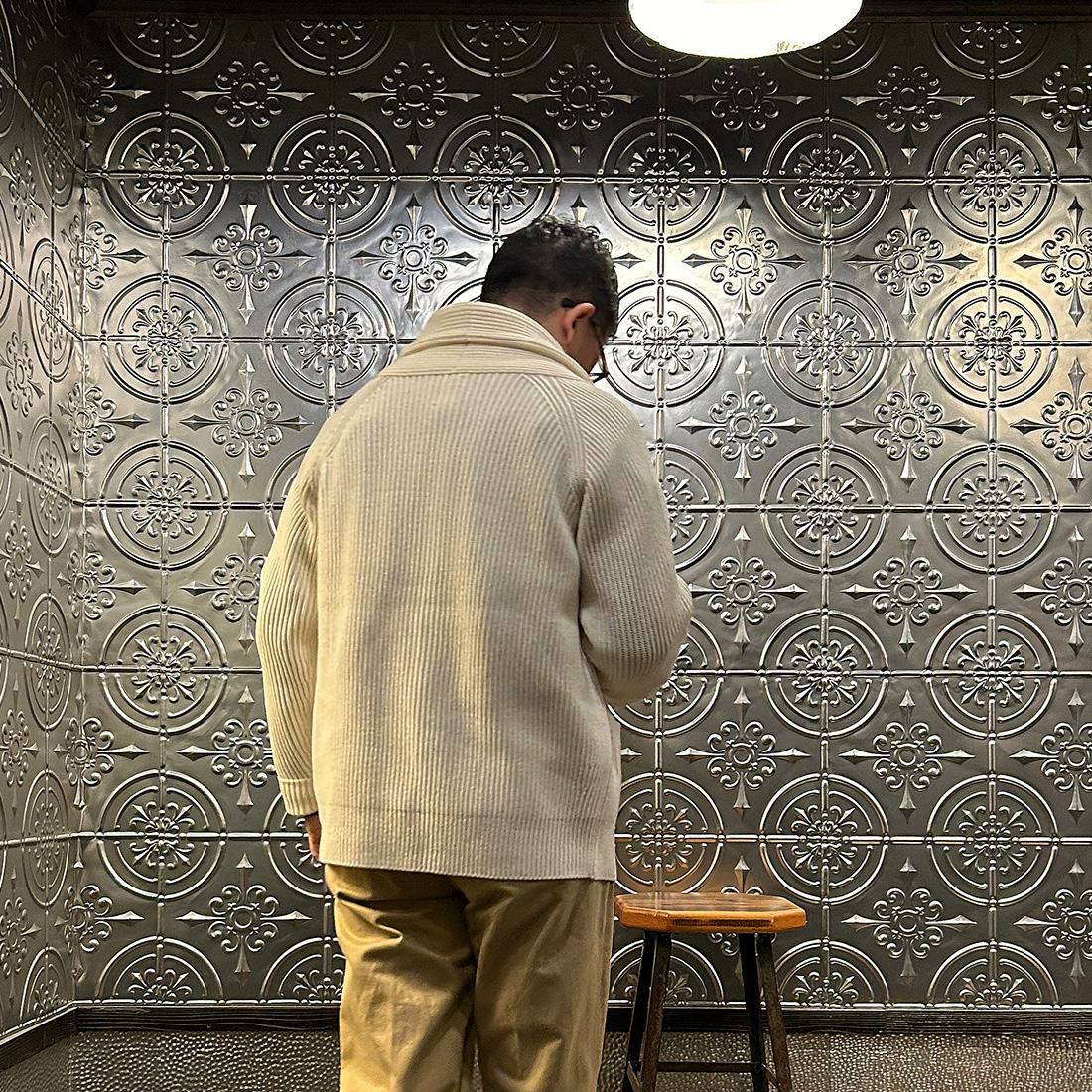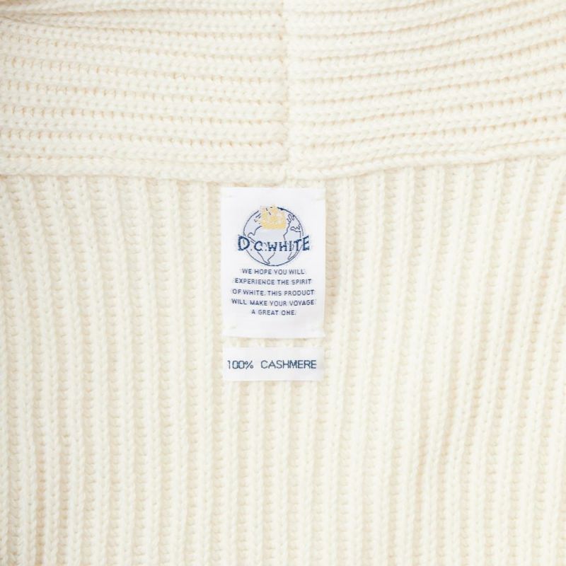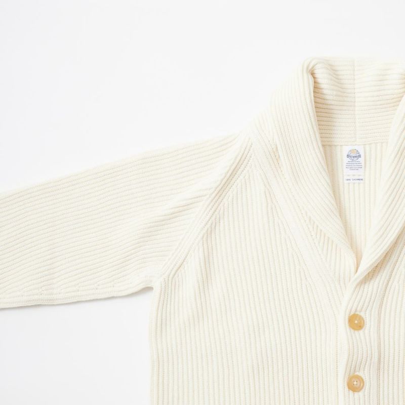国内ブランドD.C. WHITE(ディーシーホワイト)のSMOKING JACKET。100%カシミヤのショールカラーカーディガン。スポーティなスタジャンから着想した配色でトラッドウェアの源流ともいえるスモーキングジャケットにする、そんな遊び心とクオリティを高い次元で融合させることを目指したアイテム。モンゴルに拠点を持つ会社が集毛から一貫して製品化を担い、地域による個体差を排除すべく、限られた遊牧民とダイレクトに契約。特定のヤギのみから収集された高品質な毛のみを使用。ニッティングにおいては、両畔編みの7ゲージ、糸番手は2/26を使用。製品一着あたり約11頭分のヤギの産毛を使用した非常に贅沢な仕様。着込むほどにしなやかなカシミヤに成長していく、まさに一生ものとしてふさわしい1着。