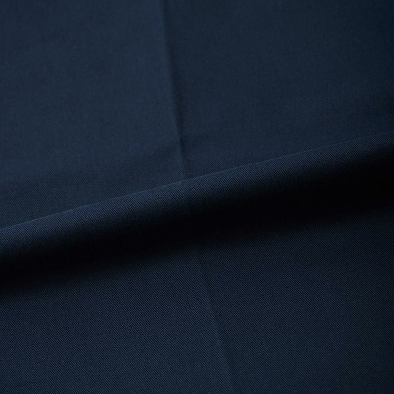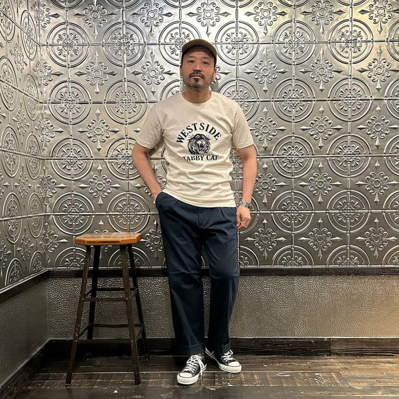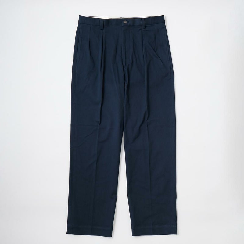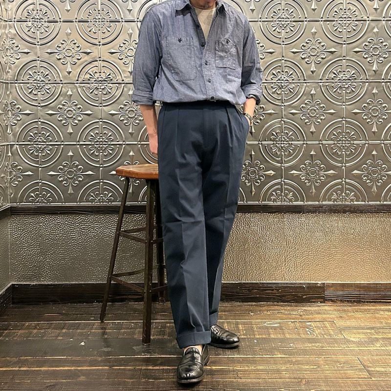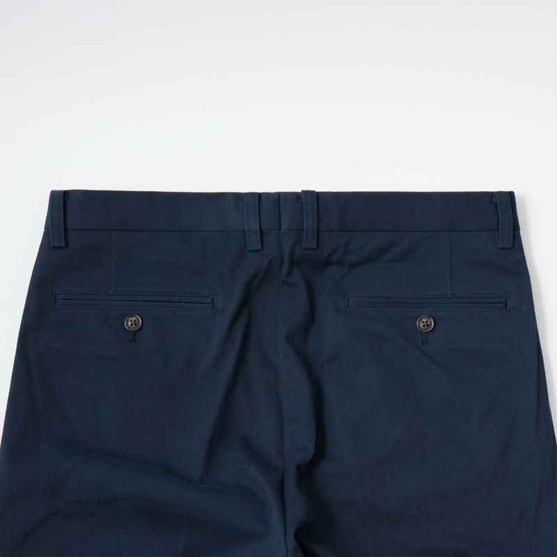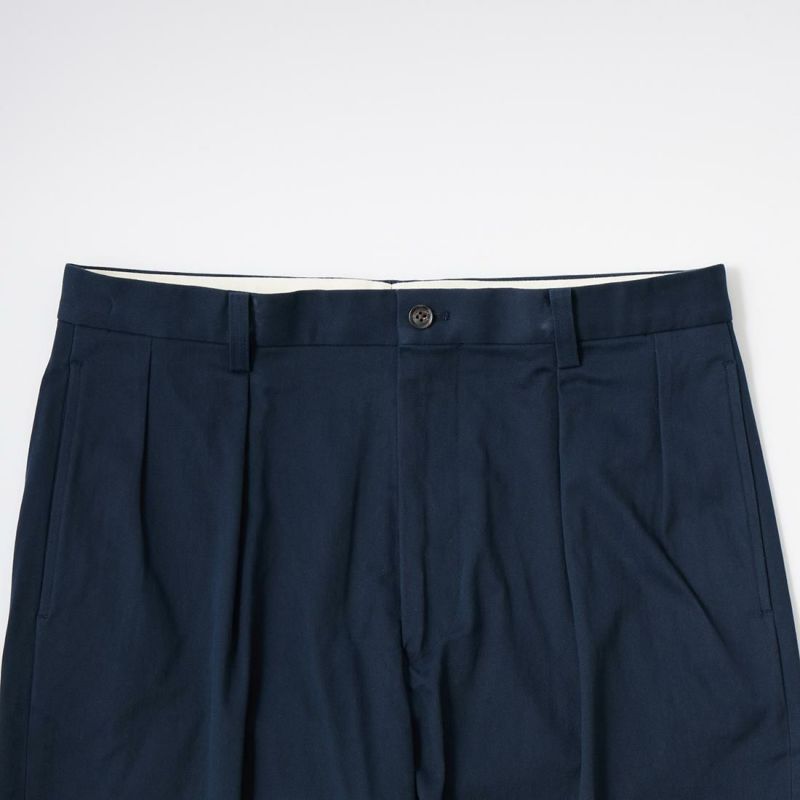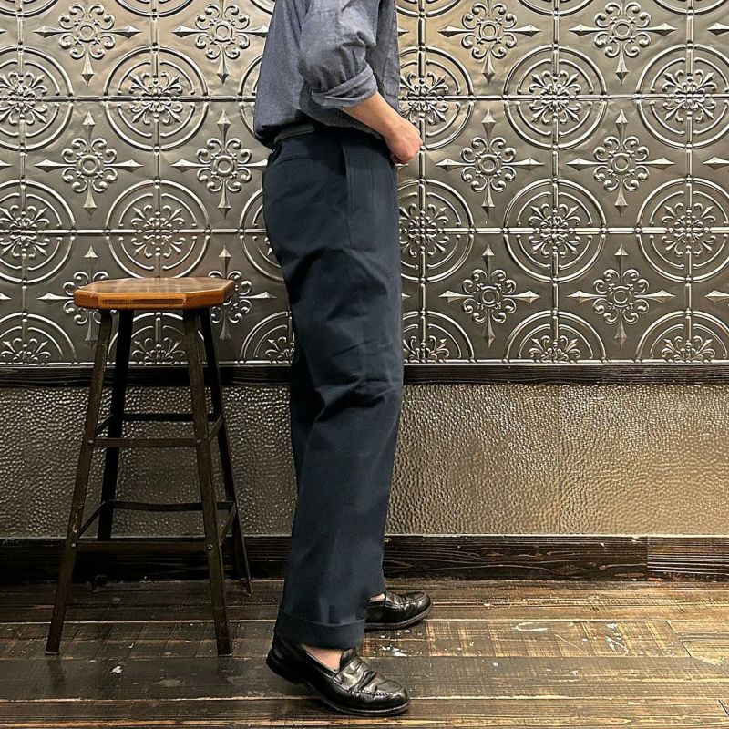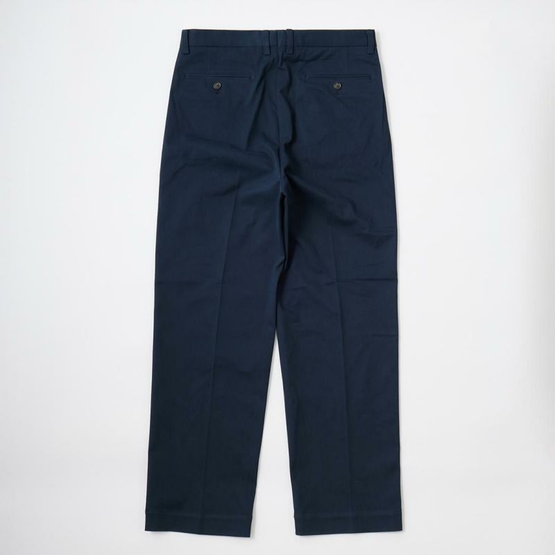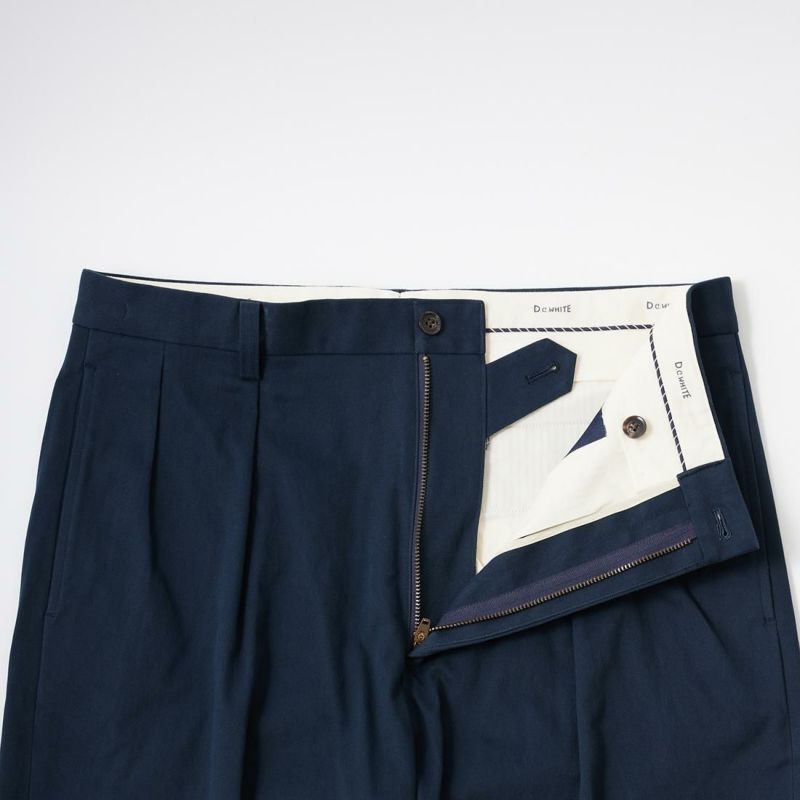 国内ブランドD.C. WHITE(ディーシーホワイト)のTHE NAVY。コットンポリウレタン素材のネイビーチノ。25年春夏のディーシーホワイトのコレクションテーマの「NAVY NAVY ネイビーネイビー」を象徴する一枚。あえてポリウレタン混の生地を使った理由は少し退色したような白っぽい風合いを出すため。雰囲気重視での生地セレクト。副産物的に生地に伸びがあり穿きやすくもあります。フロントは2インプリーツ仕様。股上も深め。少し太目のシルエット。クラシックなドレストラウザーを彷彿とするようなシルエット。合わせるモノを選ばない万能に使いやすいネイビーチノ。