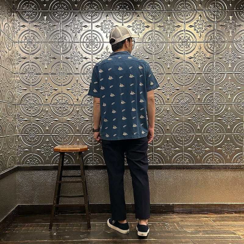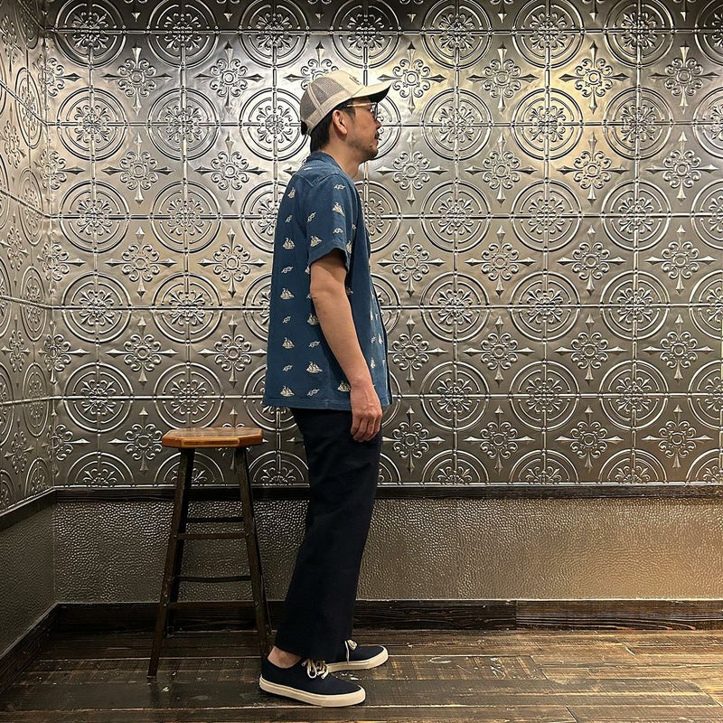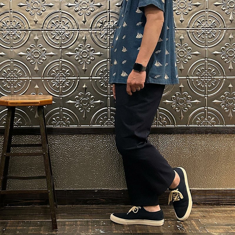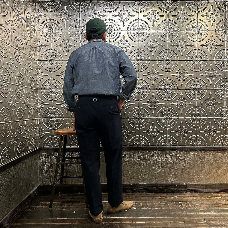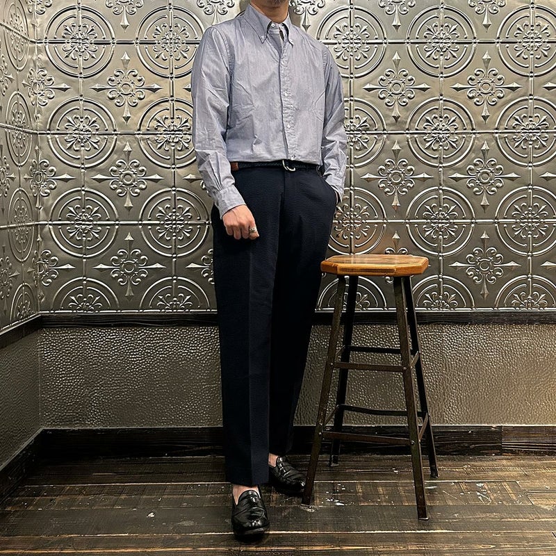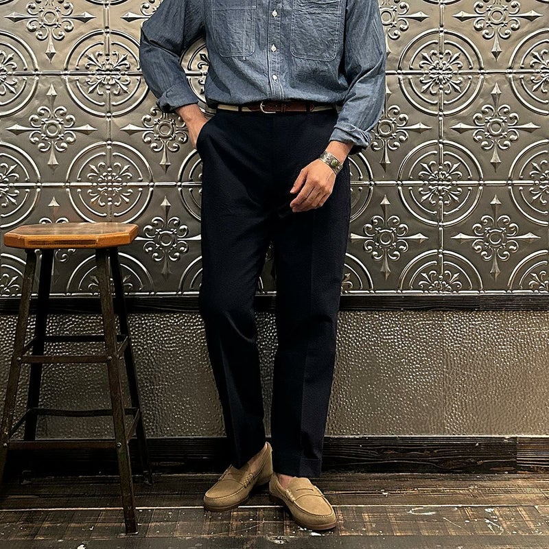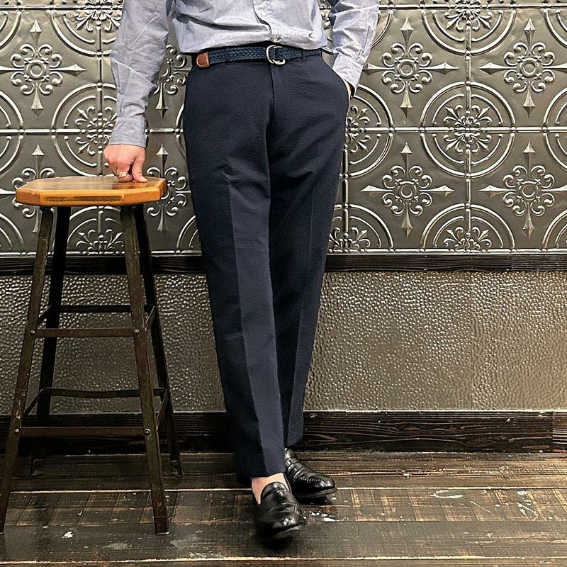 172センチ60キロで「46」でウェストに少しゆとりのあるサイズ感です。普段は30インチを基準にパンツを穿いています。「44」でも穿けるのですがシルエット的に「46」ぐらいの方が好みだったので自分が穿くのであれば「46」を選びます。背面の尾錠を締めればウェストが少し緩くてもお尻の上部分で引っかかる感覚で特に問題はありません。同ブランドの定番のアメリカントラウザーは直線と曲線のバランスが非常に良いパンツ。いい意味での大量生産時代のアメリカのトラウザーズのイメージでしょうか。夏にも快適に穿ける天然の機能素材「シアサッカー」をお楽しみください