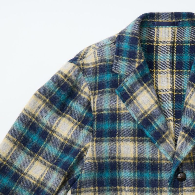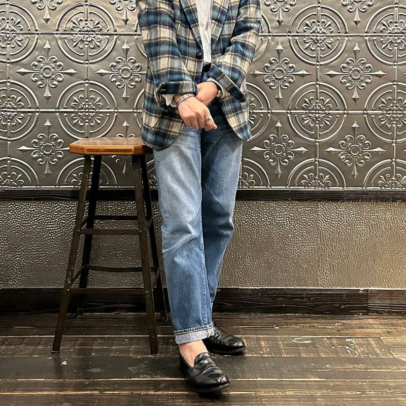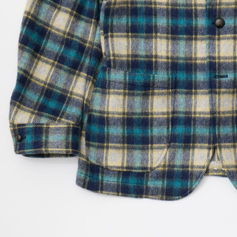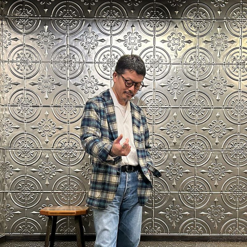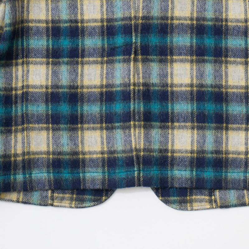 172センチ60キロで「44」で丁度良いサイズです。冬の着用を見越したサイズ感。中にそれなりに着込める余裕があります。レザーのくるみボタンと袖口のカフ仕様。アメリカのペンドルトンを彷彿とさせるディテール。アメリカンクラシックなワークなディテールをディーシーホワイトのテーラーリングで編集したジャケット。生地もアメリカンなざっくりコットンフランネルではなく、柔らかくドレープ感もキレイなウールナイロンアルパカの混紡。シャギー感が柄の出方を柔らかい印象に。シャツを合わせてきちんと着るのも良いですが、古着のTシャツやスウェットなどに合わせてラフに着るのがオススメ。ブランドの編集力が光る一枚ですねっ。