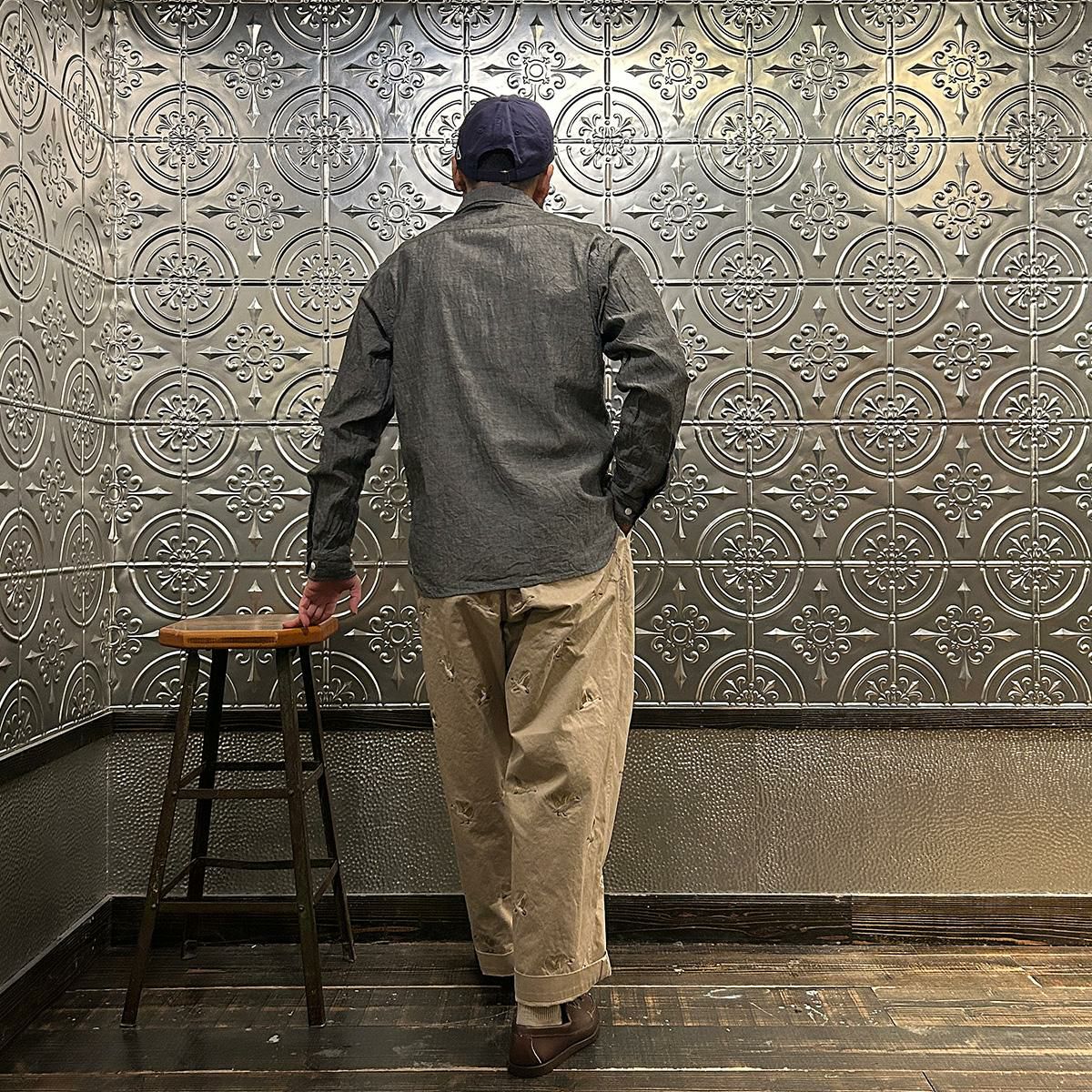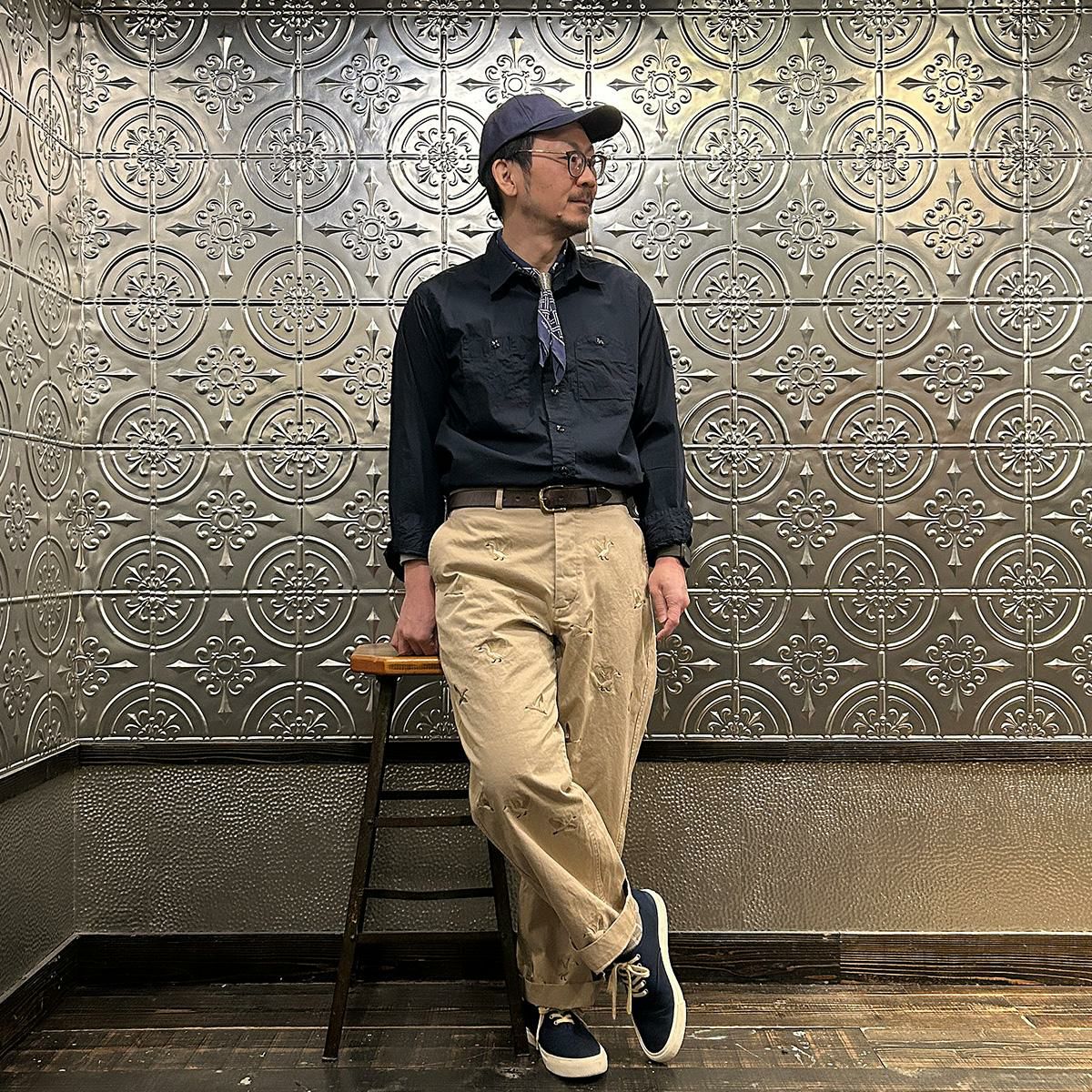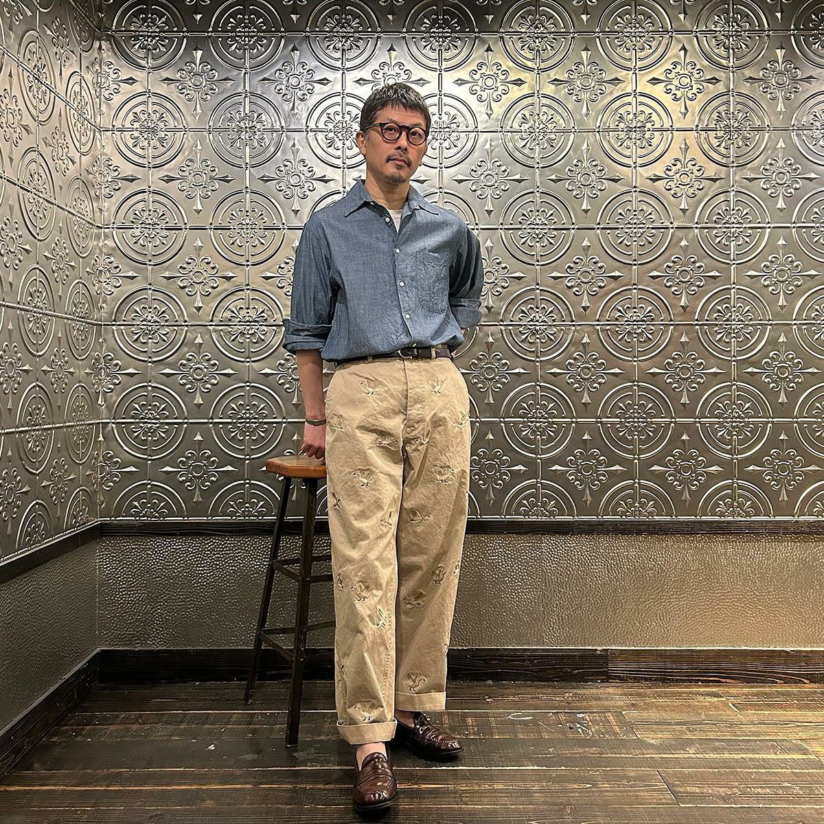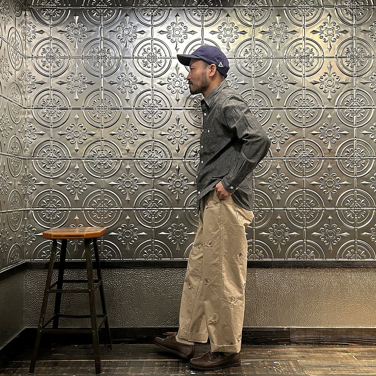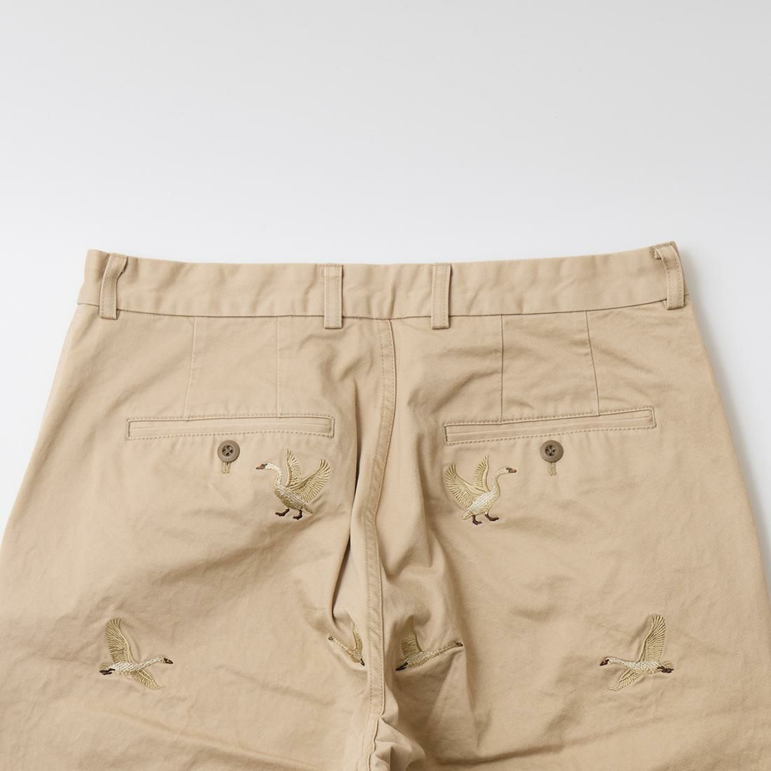 国内ブランドD.C. WHITE(ディーシーホワイト)のVINTAGE CHINO PANTS。ウェストポイント素材を使用したヴィンテージライクなチノパン。前立てはボタンフライ。左右にスラッシュポケット。バックの左右に両玉縁ポケット。ほぼ絞りのない太めのシルエット。刺繍のモチーフは白鳥。刺繍を単調な並びではなく、生地の段階で製品のパンツになった時のバランスを考え配置。ウエストポイントの経年変化も楽しみな1本。