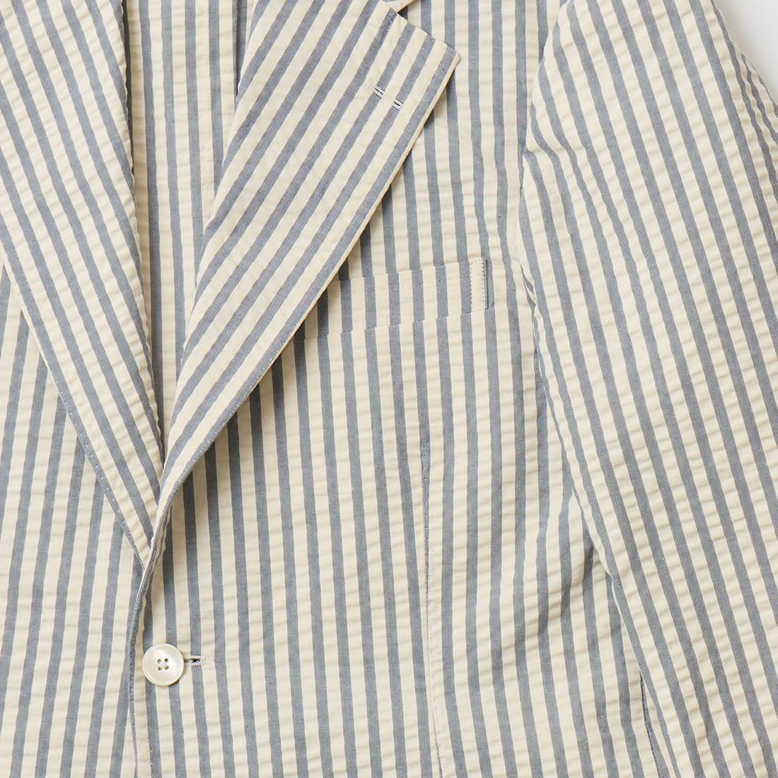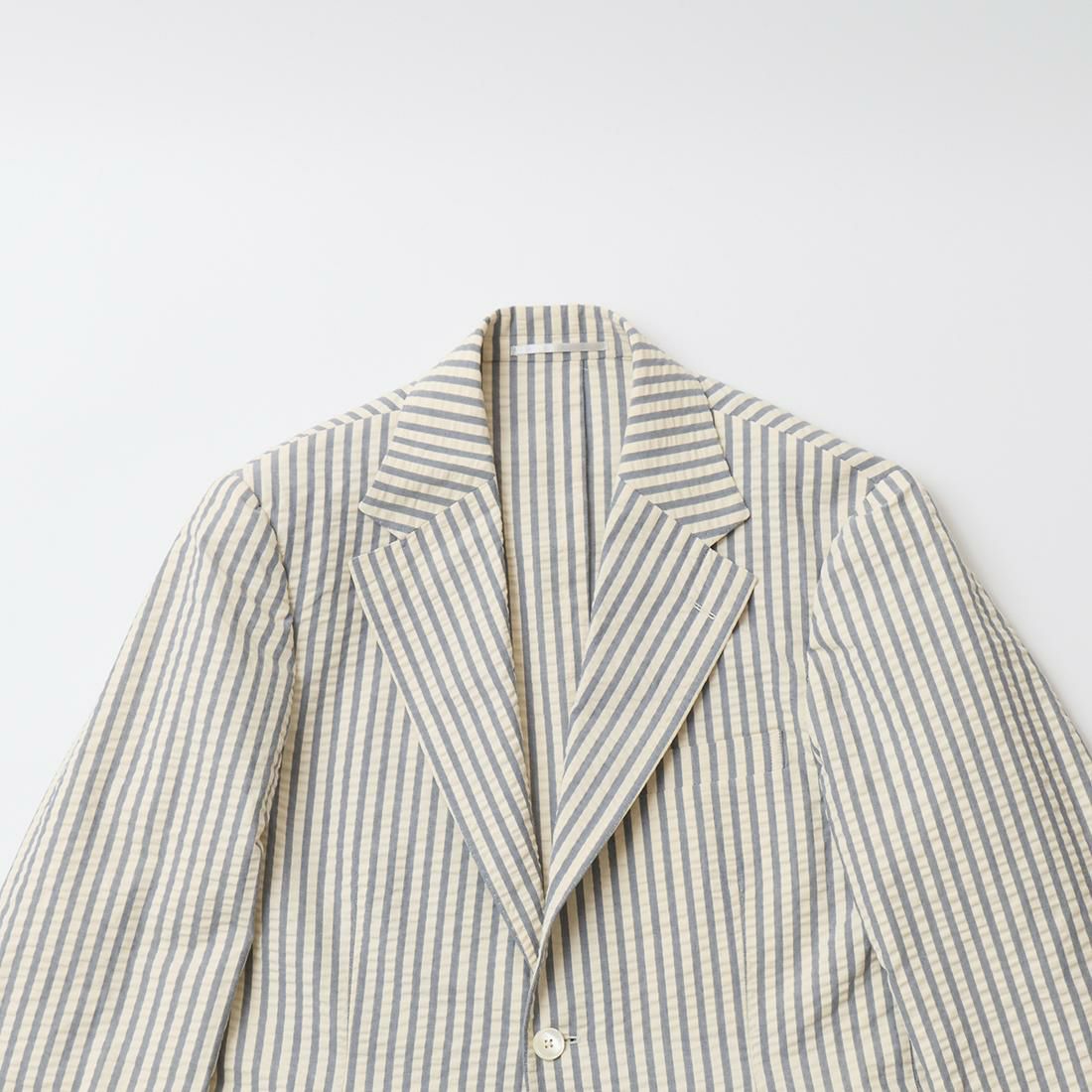 国内ブランドD.C. WHITE(ディーシーホワイト)の"PORTLAND" JACKET SEERSUCKER。シアサッカー素材を使用したポートランドジャケット。クラシックな雰囲気の広めのラペル幅。3ボタン仕様。左胸にポケット。腰の左右にカジュアルな雰囲気のパッチポケット。バックはセンターベント。清涼感のあるシアサッカー素材。