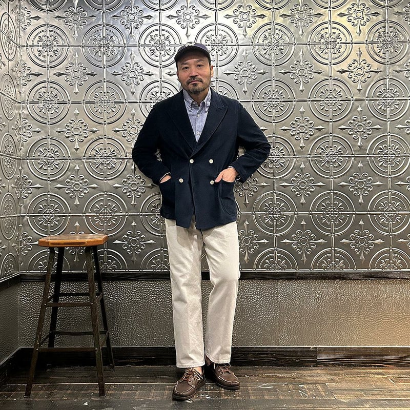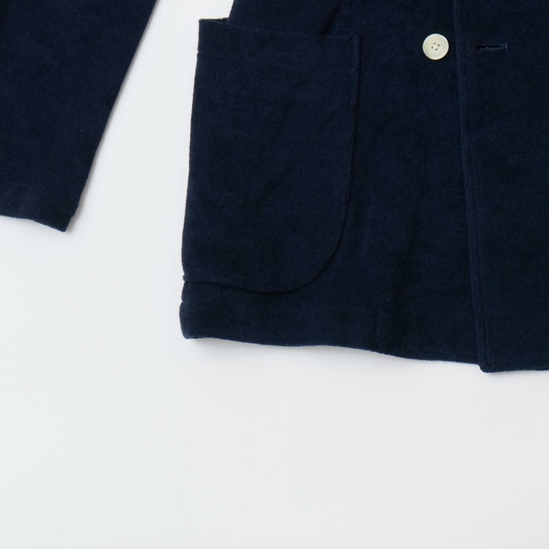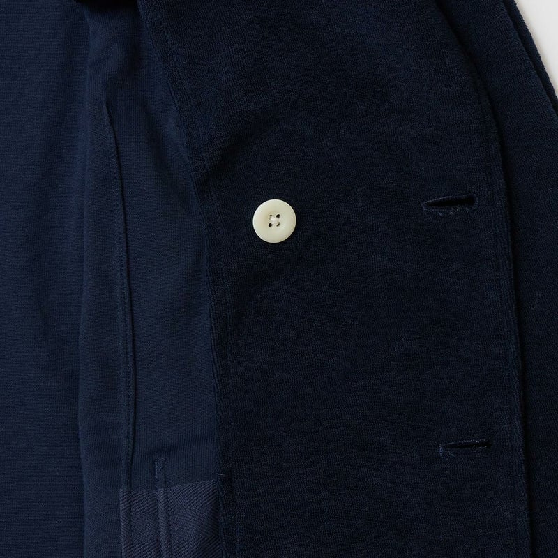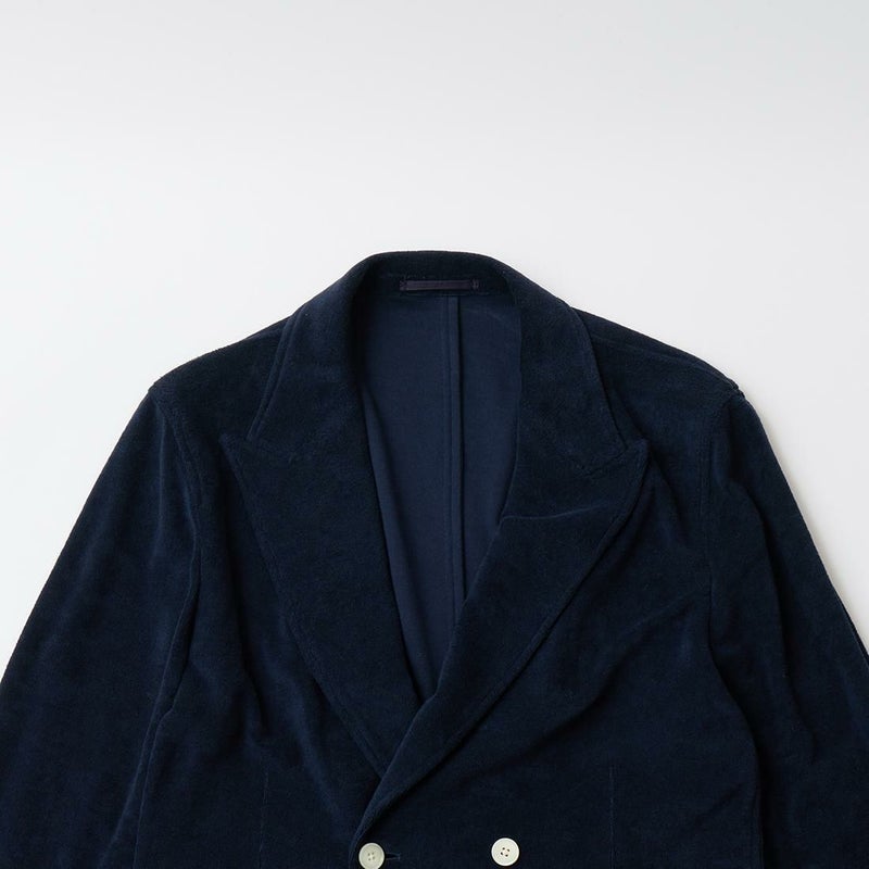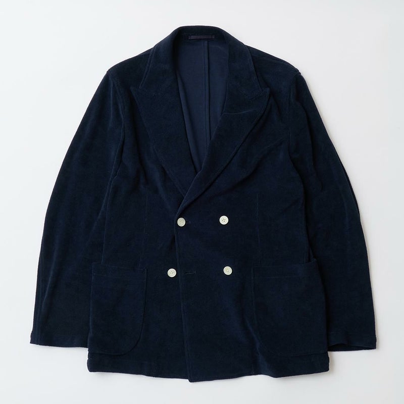 国内ブランドD.C. WHITE(ディーシーホワイト)のNEWPORT JACKET。85%コットン、15%ポリエステルのパイル素材を使用した4つボタンのダブルブレストジャケット。なだらかなカーブを描くナチュラルショルダー。胸ポケットはなし。腰は左右にパッチポケットを配置。バックはセンターベンツ。スペインのSIDOGRAS社のパイル生地を採用。カーディガン感覚で気軽に羽織れるジャケット。