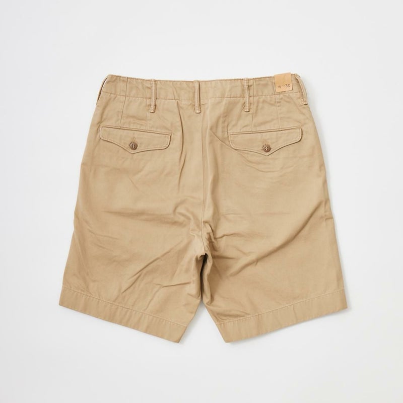 Double RL(ダブル アール エル)のOFFICERS SHORT CTN PIECE DYE TWILL。コットンツイルを使用したシンプルなチノショーツ。ボタンフライ、ダブルパイピングのコインポケット、ポケット部分の弓状のステッチ、バックのフラップポケットなど、シンプルながらオフィサーチノのディテールに細部までこだわった一本です。