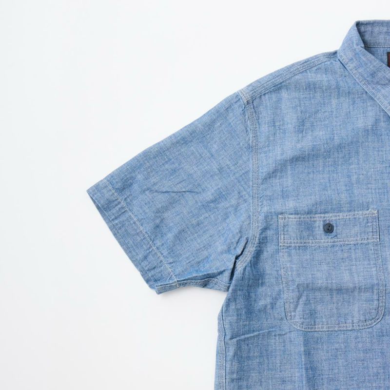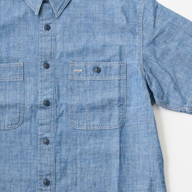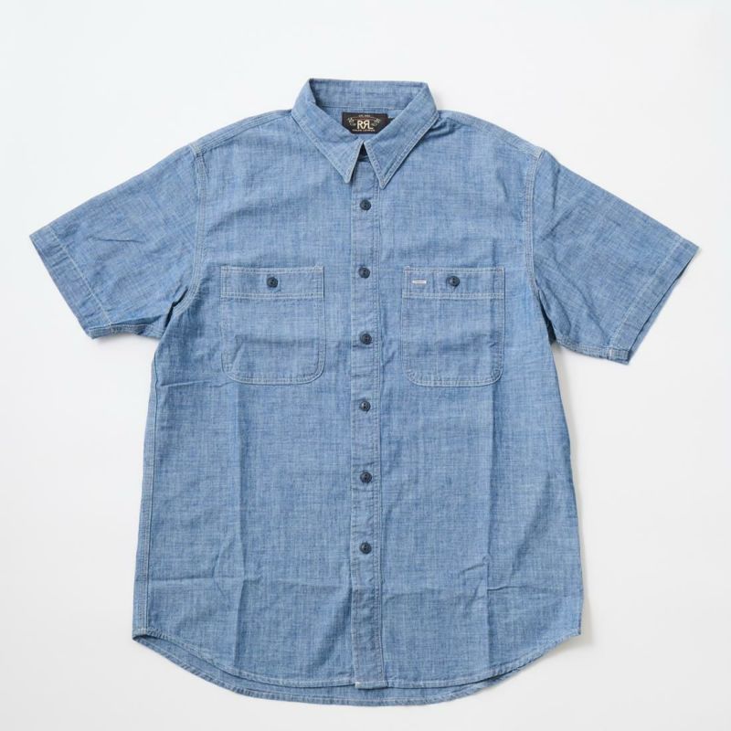 Double RL(ダブルアールエル)のCRAFTSMAN WS SHORT SLEEVE SPORT SHIRT CTN CHAMBRAY。日本製コットンシャンブレーを使用した半袖のワークシャツ。ポインテッドカラーや左右に配置されたワークシャツらしい大き目のボタン付きのパッチポケットが特徴的なデザインとなるシャツ。肩や部分はトリプルニードル(三本針)仕様となっています。本藍染めにウォッシュ加工が施されており既に雰囲気は出ていますが更なる経年変化も楽しんで頂ける1着です。