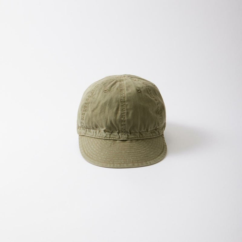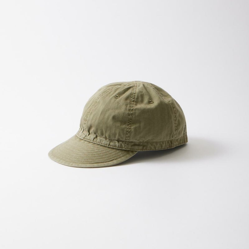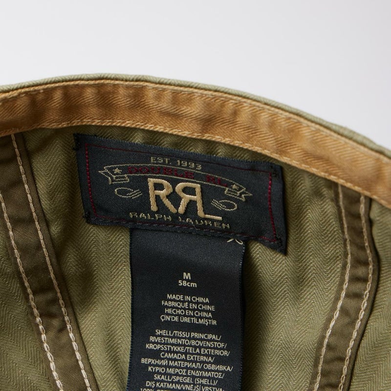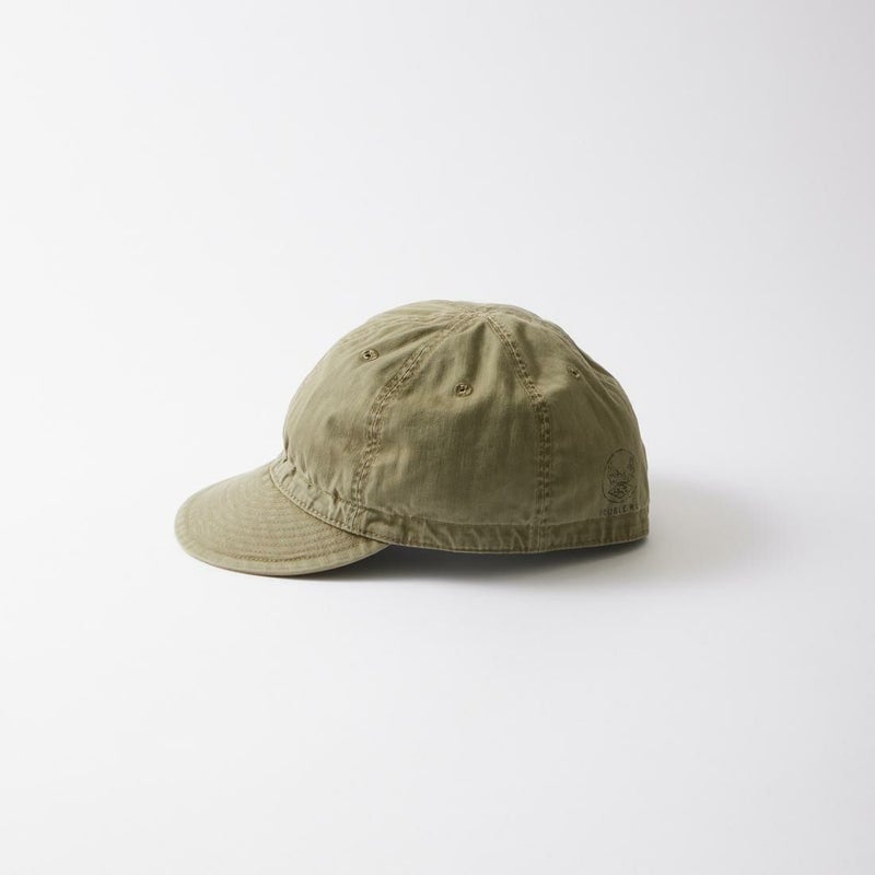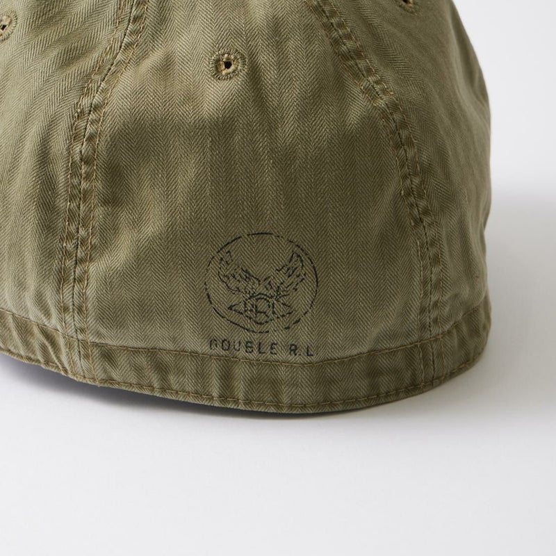 Double RL(ダブルアールエル)のSERVICE CAP HAT COTTON。コットンヘリンボーンツイル素材を使用したサービスキャップ。ツバ部分は芯なし仕様。カーキカラーのつば裏とスウェットバンド。背面に"Double R.L."のスタンプ。ウォッシュ加工が施されたヘリンボーン素材が雰囲気の抜群。既にヴィンテージ感のあるキャップに仕上がっていますが使い込む事により更なる経年変化も楽しみなアイテム。