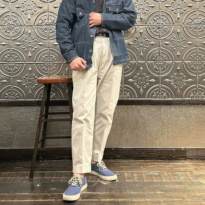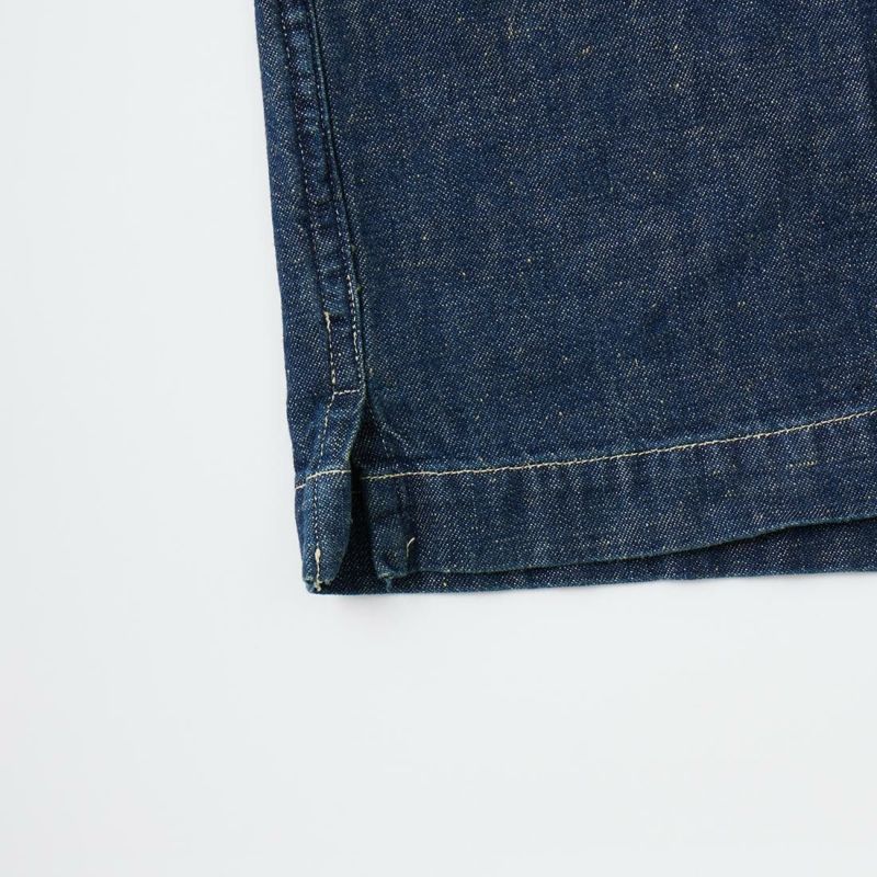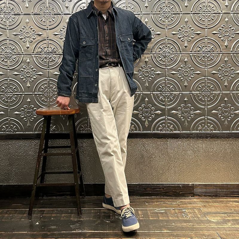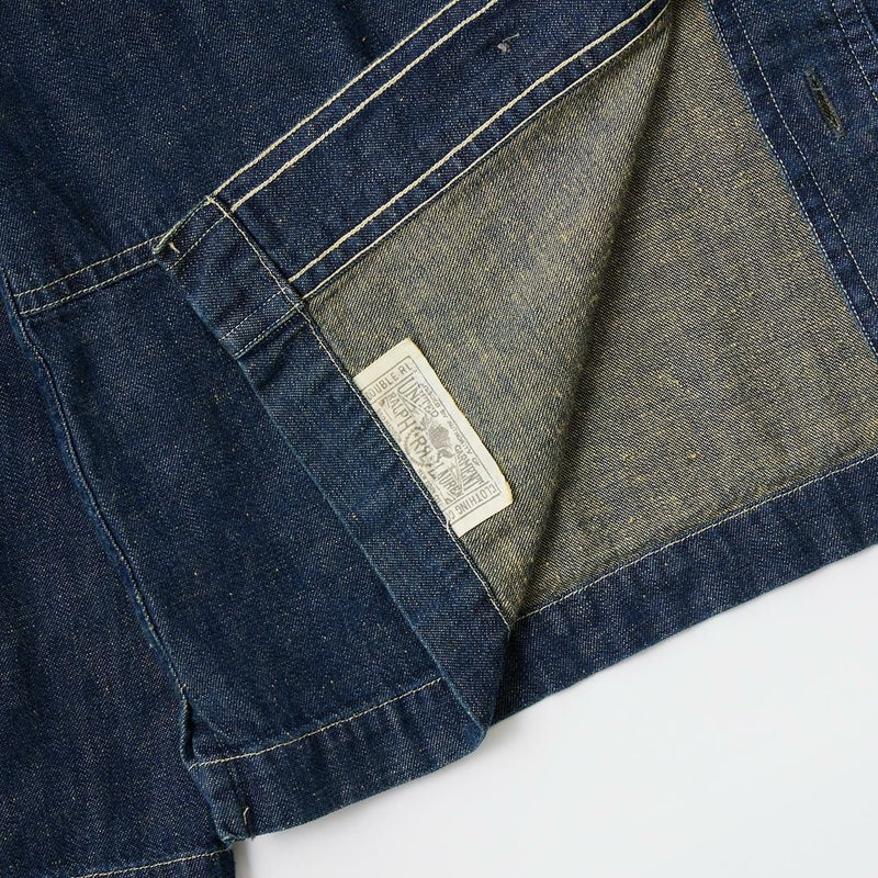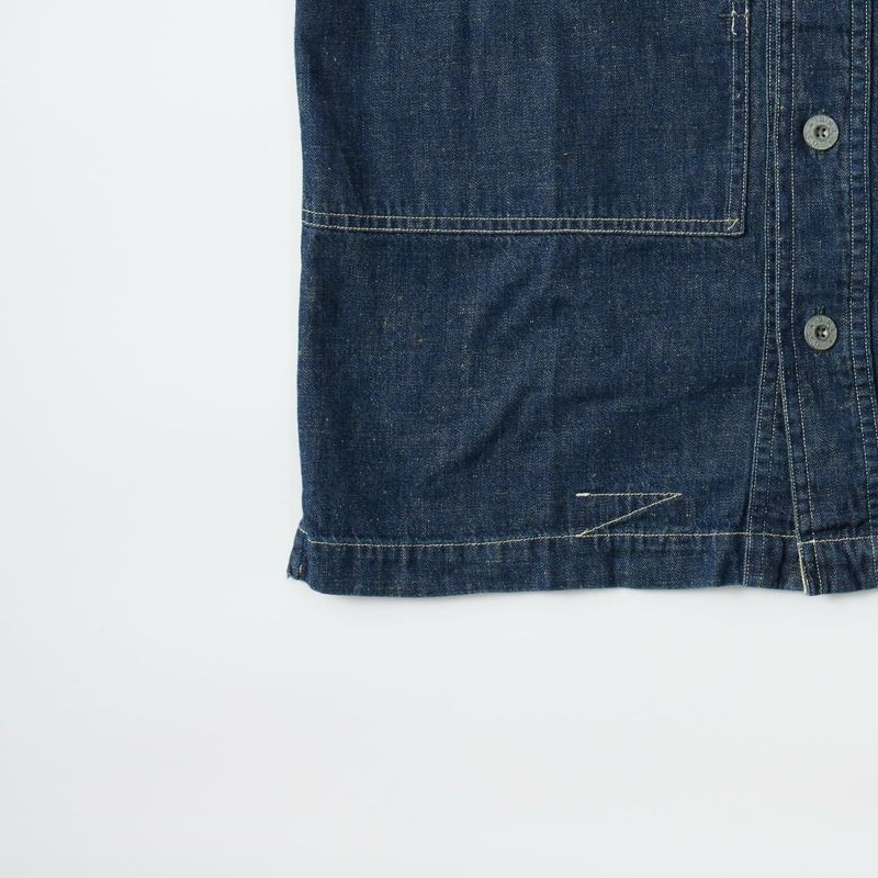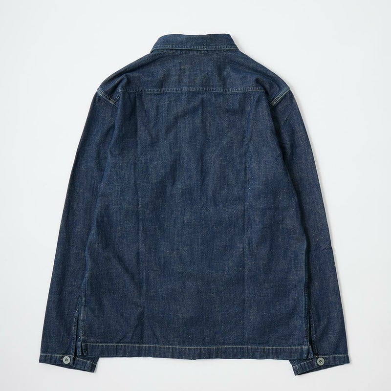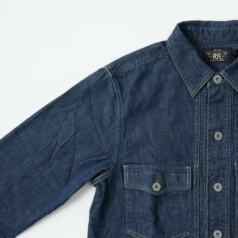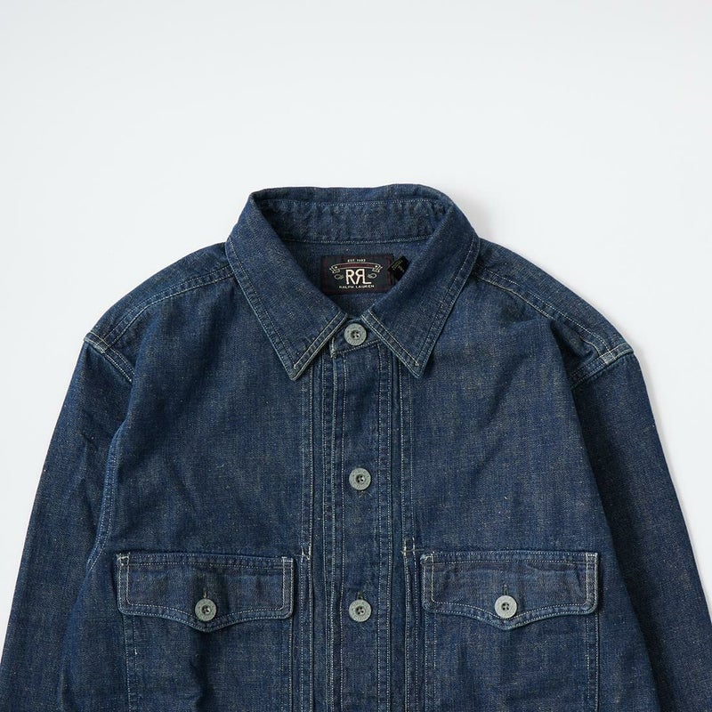 Double RL(ダブル アール エル)のMONTGOM CPO LONG SLEEVE SPORT SHIRT 2X1 DENIM。1940年代のサープラスウェアがデザインソースのカバーオールジャケット。胸の左右にボタン付きポケット2つフロント中央に縦長のポケット2つの計4つのポケットを装備。ボタンは雰囲気のあるオリジナルのメタルボタン。本藍染めのデニム素材を使用しており経年変化も楽しんで頂ける1着。
