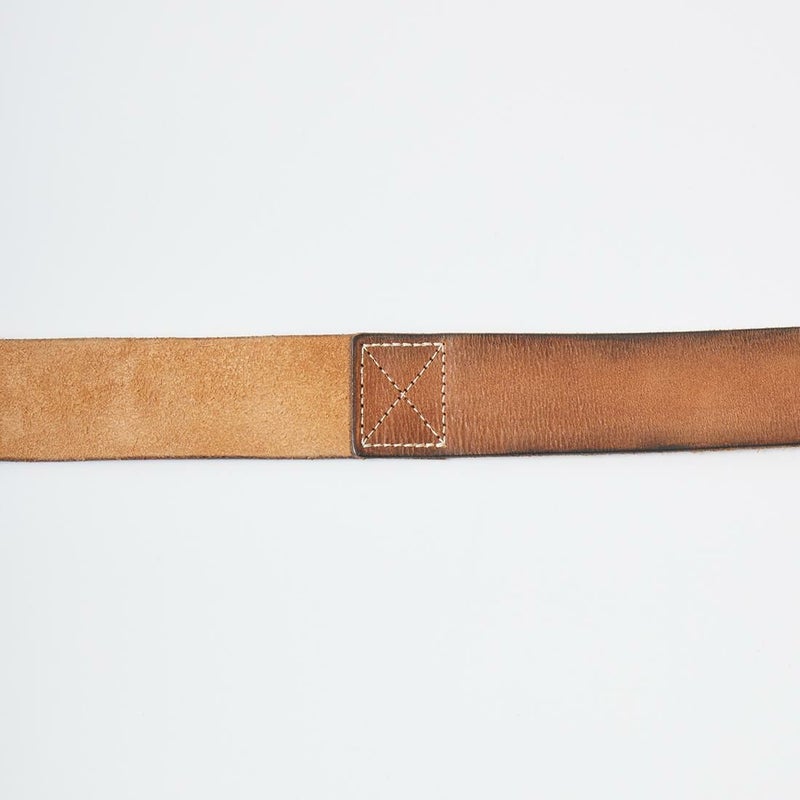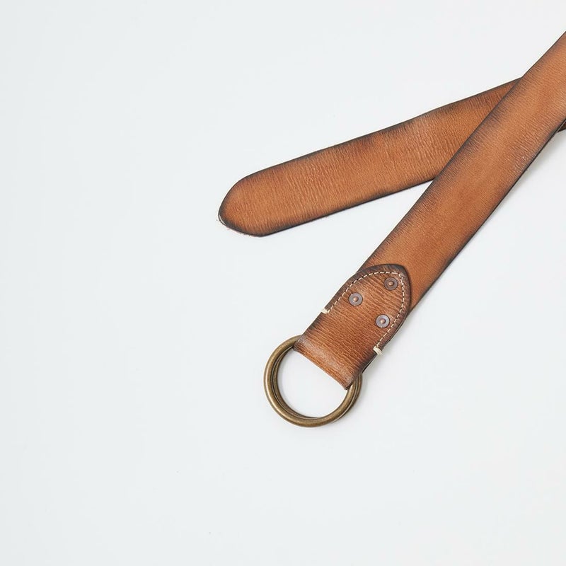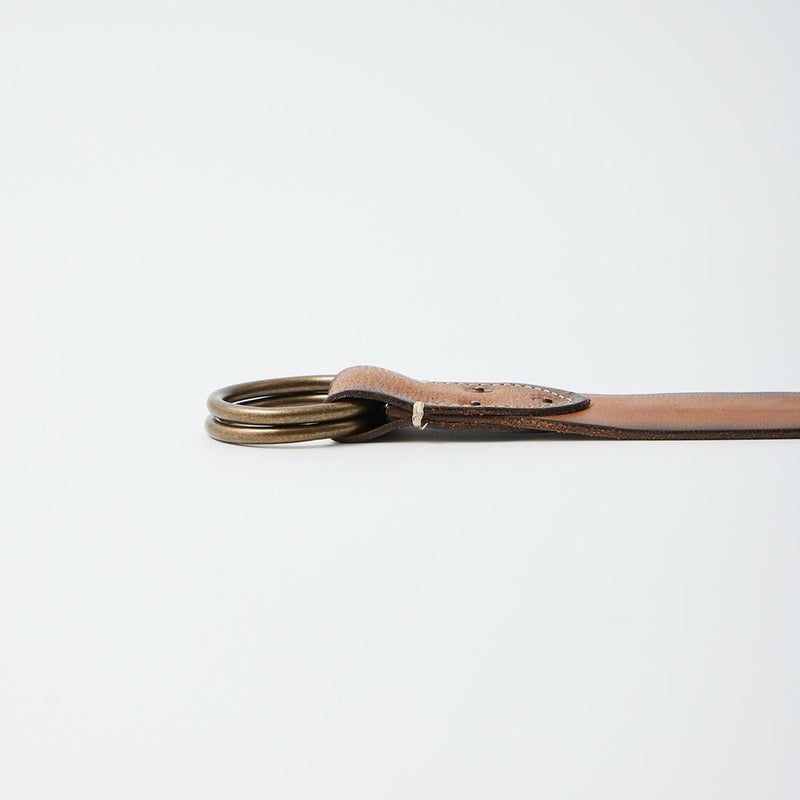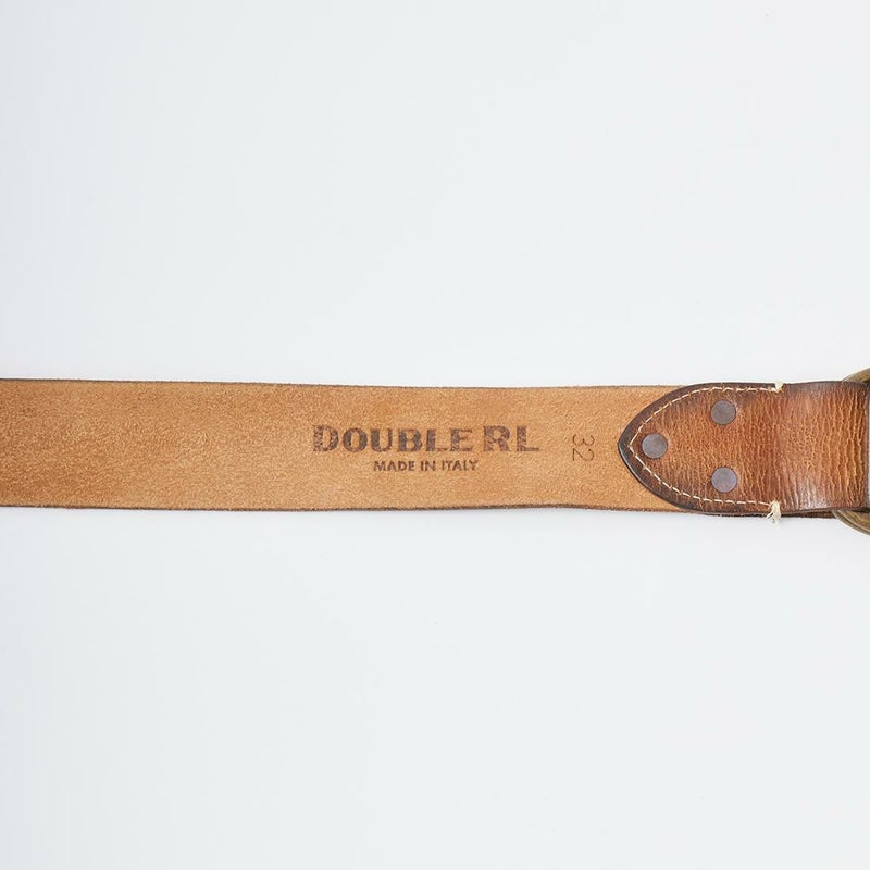 Double RL(ダブルアールエル)のOO RING BELT CASUAL TUMBLED LEATHER。タンニンなめし革のイタリア製のダブルリングベルト。リング部分はラッカー仕上げをしていないブラス。腐食加工の施されたブラスリベット。ヴィンテージ感たっぷりのベルト。