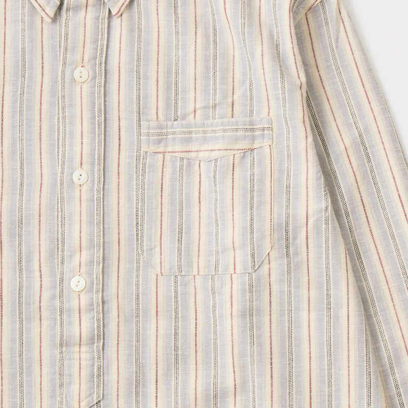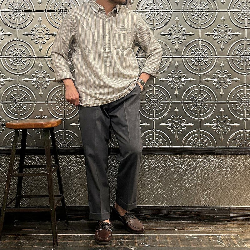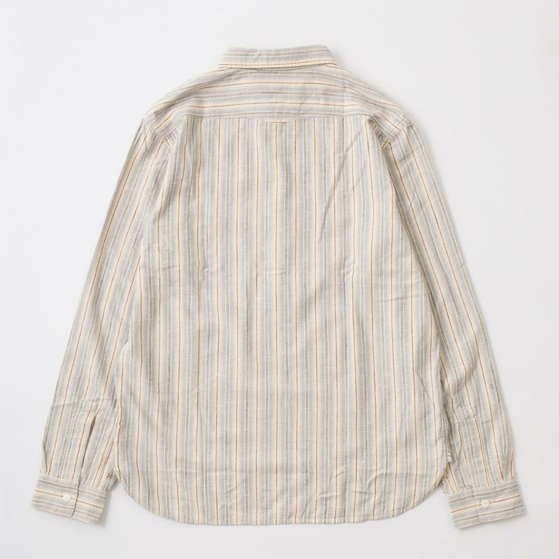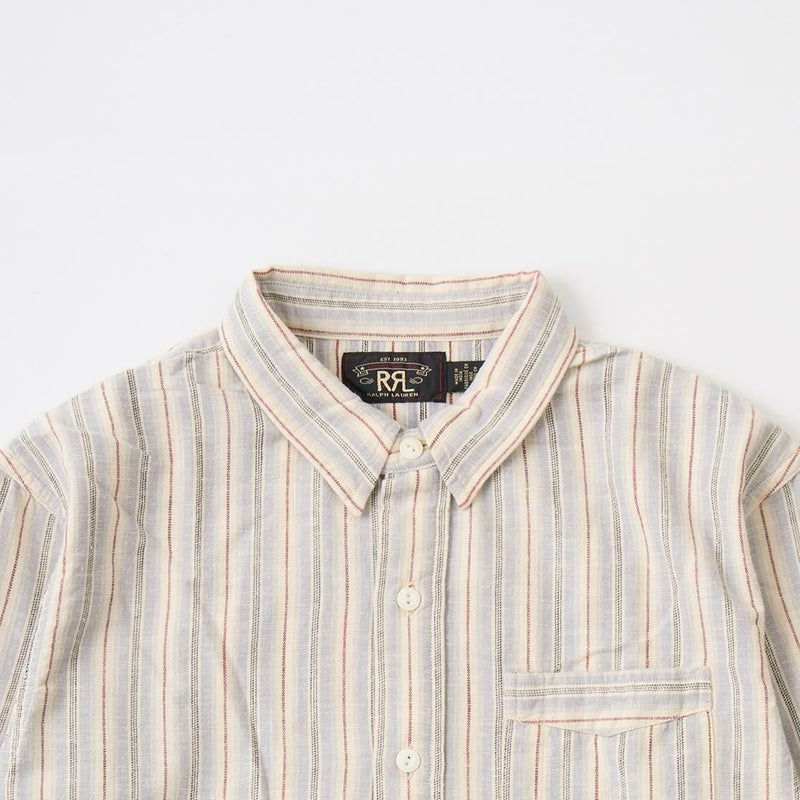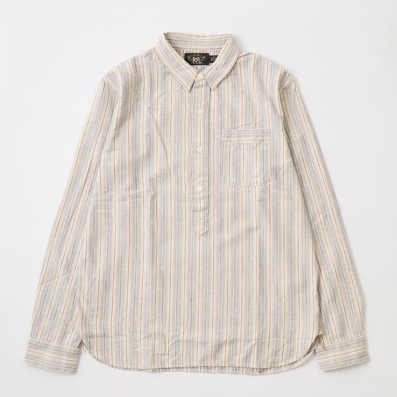 Double RL(ダブルアールエル)のBULLDOG PO LONG SLEEVE SPORT SHIRT CTN Y/D STRP。コットンツイル生地のプルオーバーの長袖シャツ。ヴィンテージ風ネップを実現するように織り上げた特別な生地。1900年代初頭のワークシャツがデザインソース。左胸にパッチポケット。チンストラップ付の小振りな襟。2本針環縫い。ヴィンテージのテキスタイルをもとにした糸染めのストライプパターンが雰囲気の良い1着。