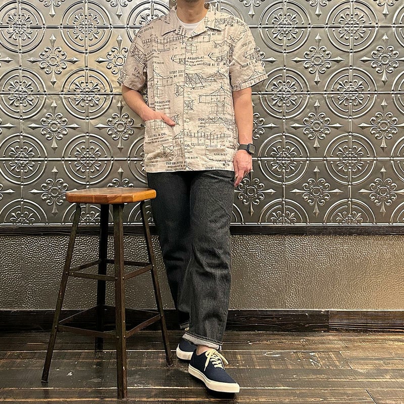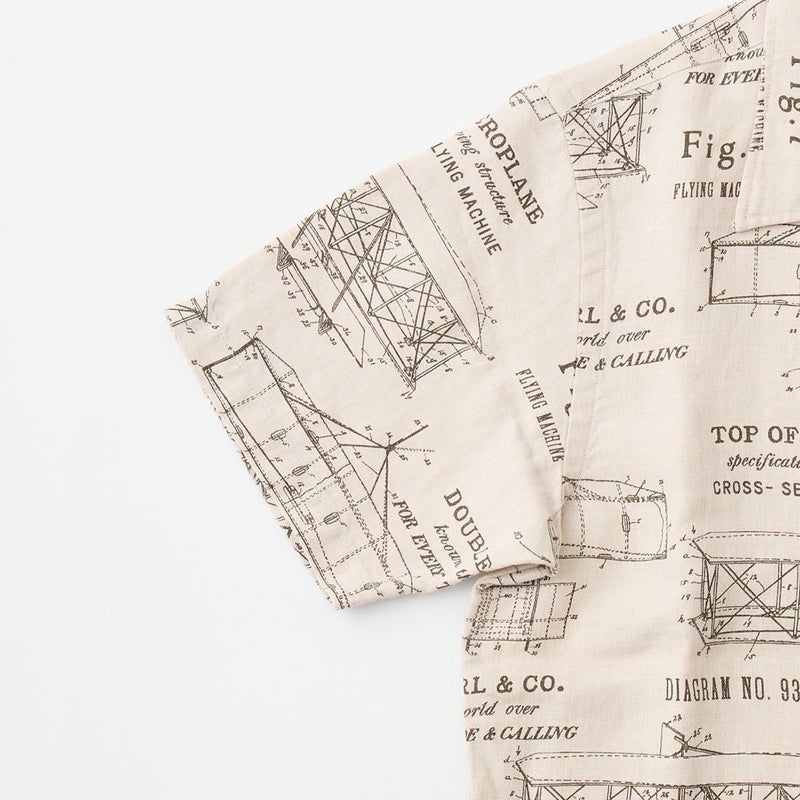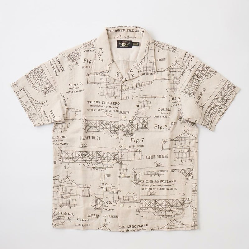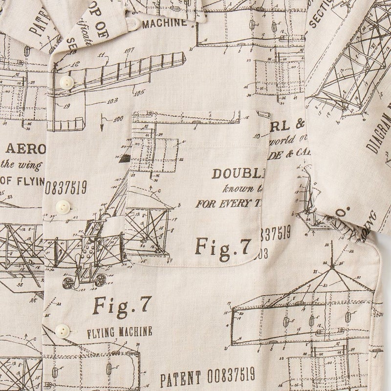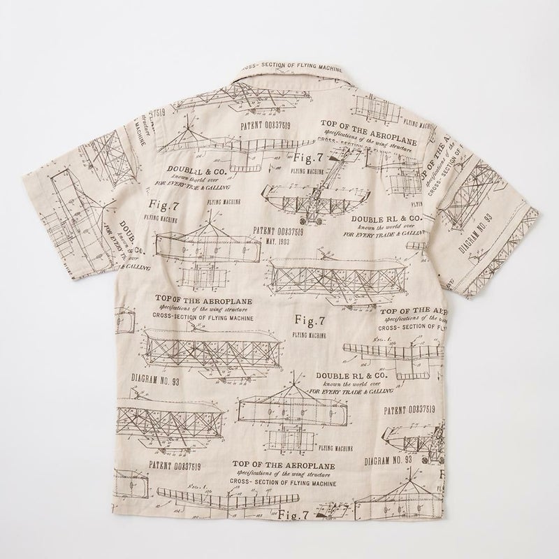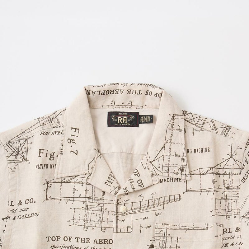 Double RL(ダブルアールエル)の3 PKT CAMP SHORT SLEEVE SPORT SHIRT COTTON LINEN PLNWV。リネン素材を使用した半袖のキャンプカラーシャツ。左胸に1つ、腰上の左右にパッチポケット。飛行機の設計図のプリント。裾はストレートカット。ウォッシュ加工によりヴィンテージのシャツの様な仕上がり。