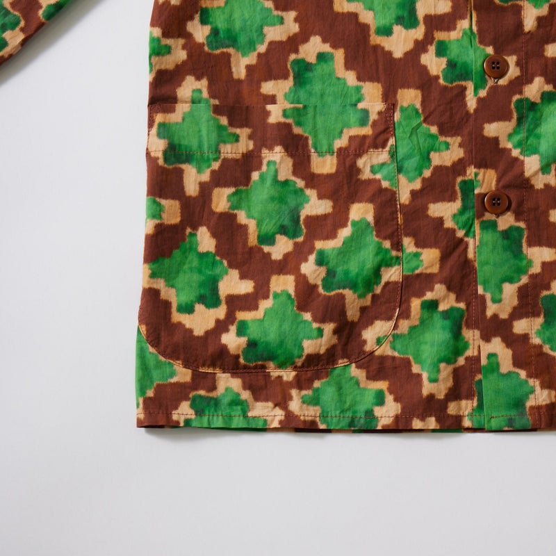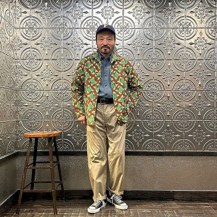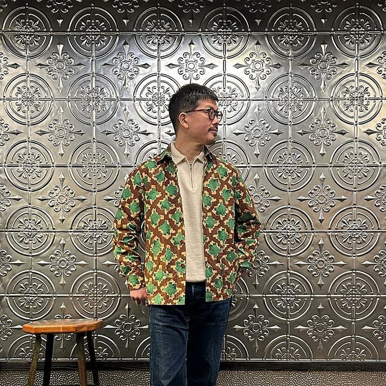 EAST HARBOUR SURPLUS(イーストハーバーサープラス)のHADLEY SHIRT JACKET PRINT。イタリア軍のプリズナーシャツ(囚人服)がデザインソース。コットン仕様のシャツジャケット。小さめの襟や腰部分の大きめのパッチポケット、袖口のカフ仕上げが特徴的なデザイン。薄手で程よいハリコシ感のあるコットン素材。インパクトのあるプリントがスタイリングの主役になってくれる1着。
