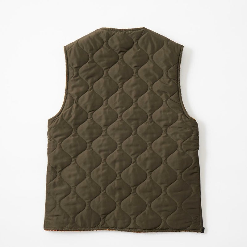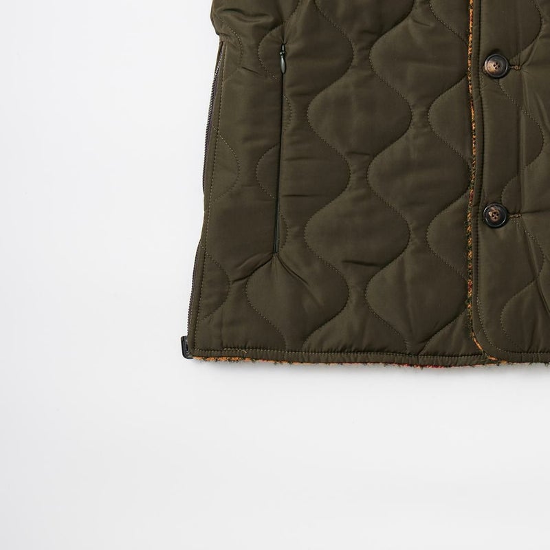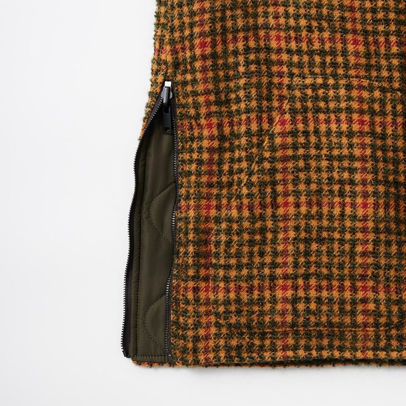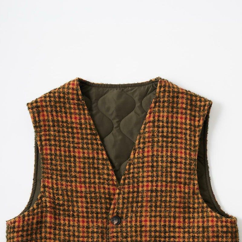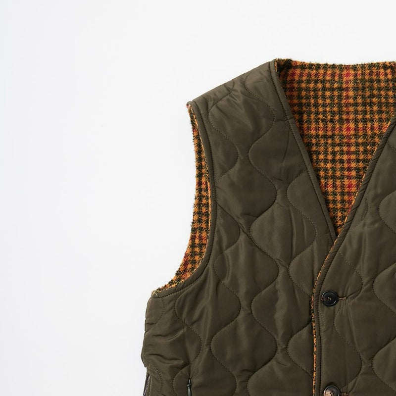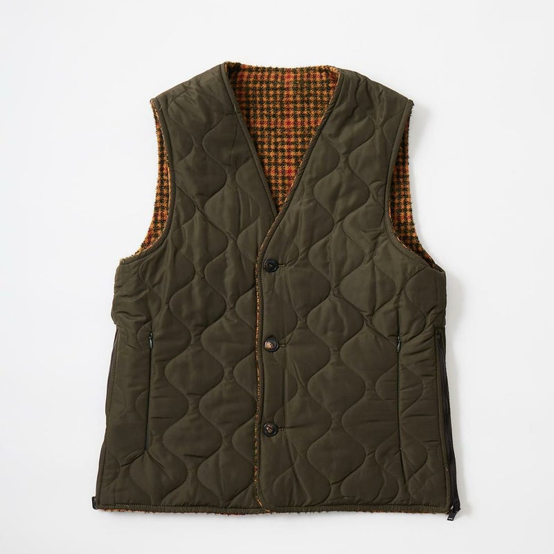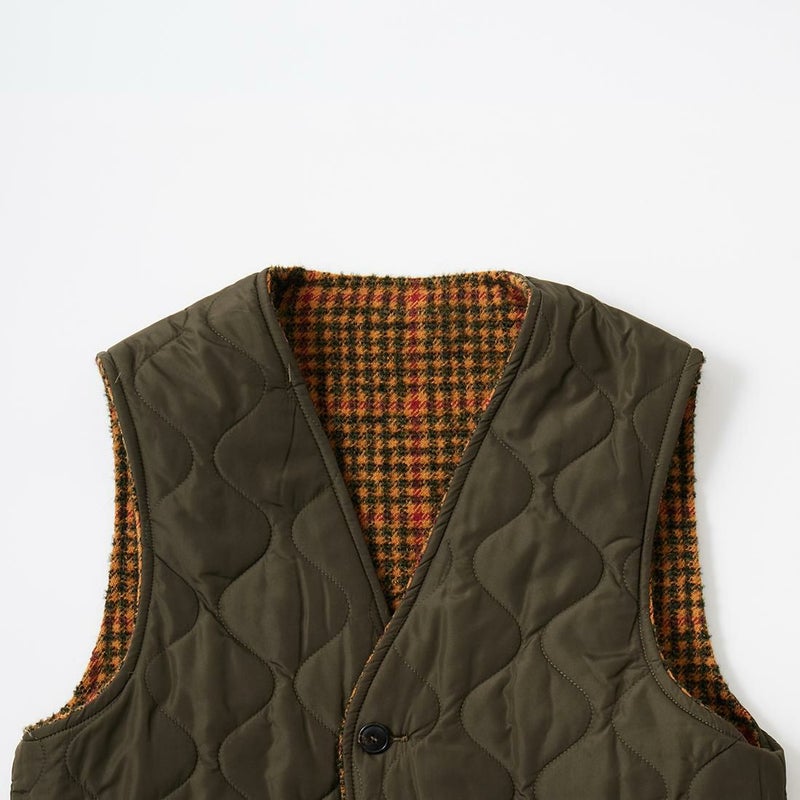 EAST HARBOUR SURPLUS(イーストハーバーサープラス)のBRISTOL REVERSIBLE VEST MILITARY STITCH。ウールフェイスとナイロンフェイスのリバーシブル仕様の中綿入りベスト。ブリティッシュな雰囲気のガンクラブチェックのウールフェイス。ミリタリーアウターを彷彿とさせるナイロンフェイス。サイドにジップが付けられておりシルエットアレンジが可能。単体でもレイヤードアイテムとしても使える便利な1着。