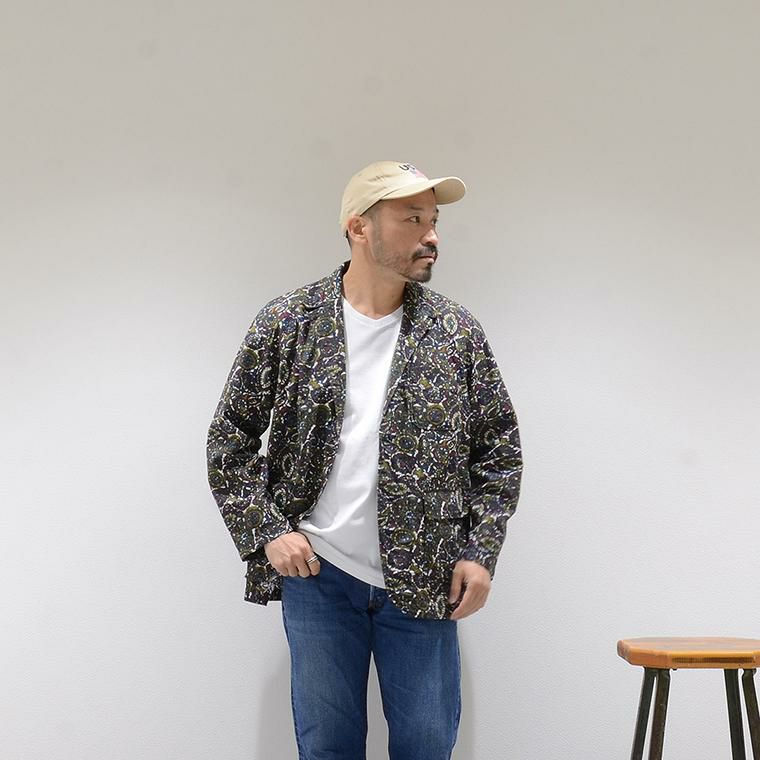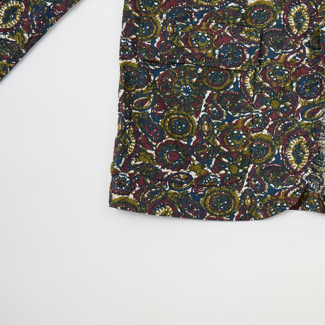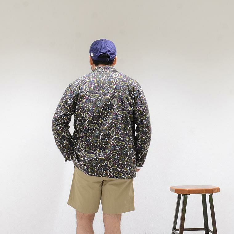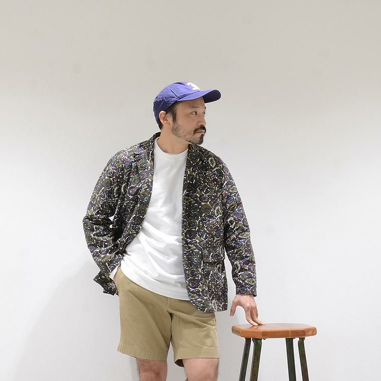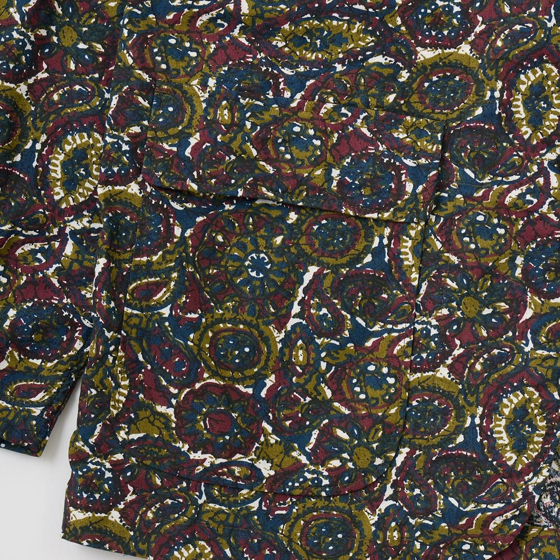 ENGINEERED GARMENTS(エンジニアド ガーメンツ)のLOITER JACKET COTTON BATIK。今シーズンのコレクションを象徴するバティックプリント素材を使用したロイタージャケット。襟にはストラップが付けられ、ラペルを寝かせればテーラード、立てればマオカラーにできる仕様のジャケット。フロントはパッチポケットが3つ付き、バックはノーベントでウエストにシルエット調整のできるアジャスターボタンを装備。ジャケットとシャツの中間のような仕上がりのアイテム。バティックプリントがシンプルなスタイリングのアクセントになってくれる1着です。
