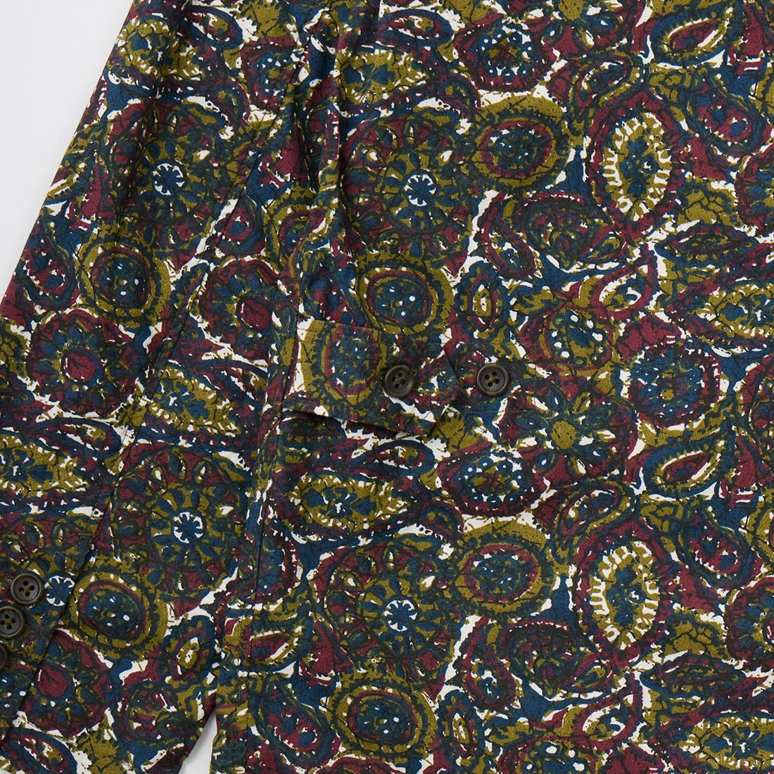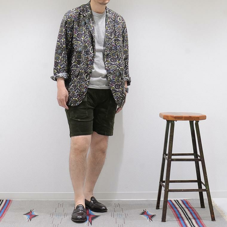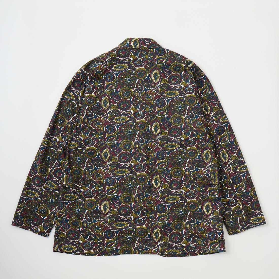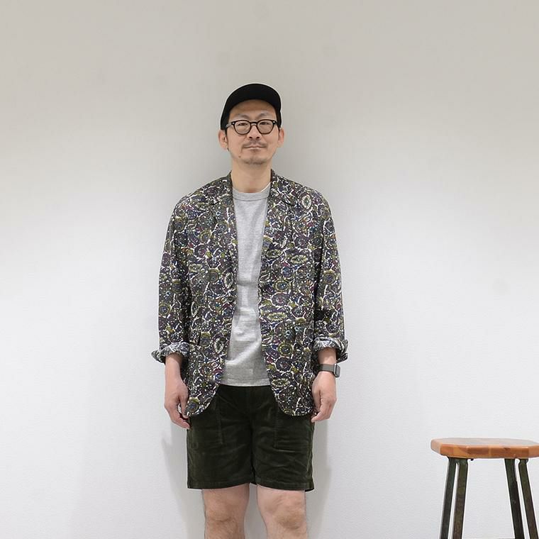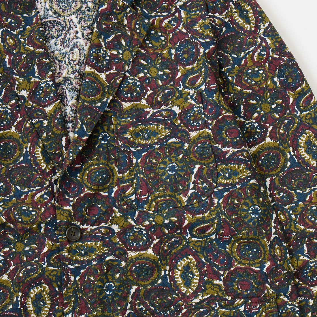 ENGINEERED GARMENTS(エンジニアド ガーメンツ)のLOITER JACKET COTTON BATIK。今シーズンのコレクションを象徴するバティックプリント素材を使用したロイタージャケット。襟にはストラップが付けられ、ラペルを寝かせればテーラード、立てればマオカラーにできる仕様のジャケット。フロントはパッチポケットが3つ付き、バックはノーベントでウエストにシルエット調整のできるアジャスターボタンを装備。ジャケットとシャツの中間のような仕上がりのアイテム。バティックプリントがシンプルなスタイリングのアクセントになってくれる1着です。