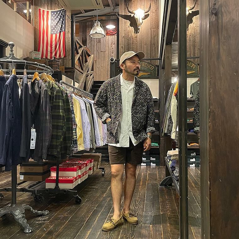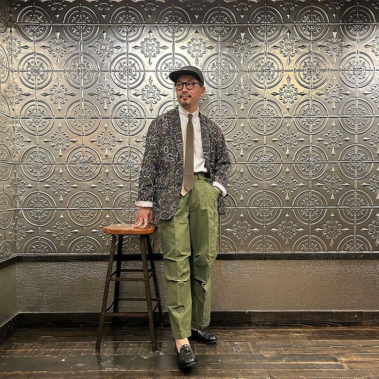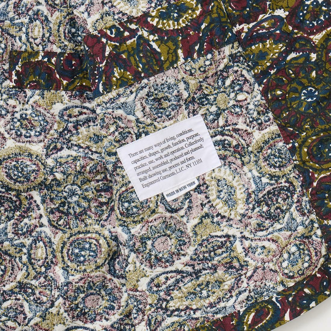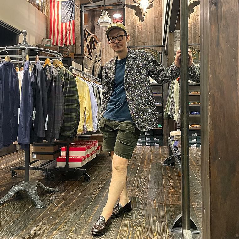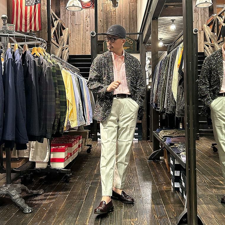ENGINEERED GARMENTS(エンジニアド ガーメンツ)のLOITER JACKET COTTON BATIK。今シーズンのコレクションを象徴するバティックプリント素材を使用したロイタージャケット。襟にはストラップが付けられ、ラペルを寝かせればテーラード、立てればマオカラーにできる仕様のジャケット。フロントはパッチポケットが3つ付き、バックはノーベントでウエストにシルエット調整のできるアジャスターボタンを装備。ジャケットとシャツの中間のような仕上がりのアイテム。バティックプリントがシンプルなスタイリングのアクセントになってくれる1着です。