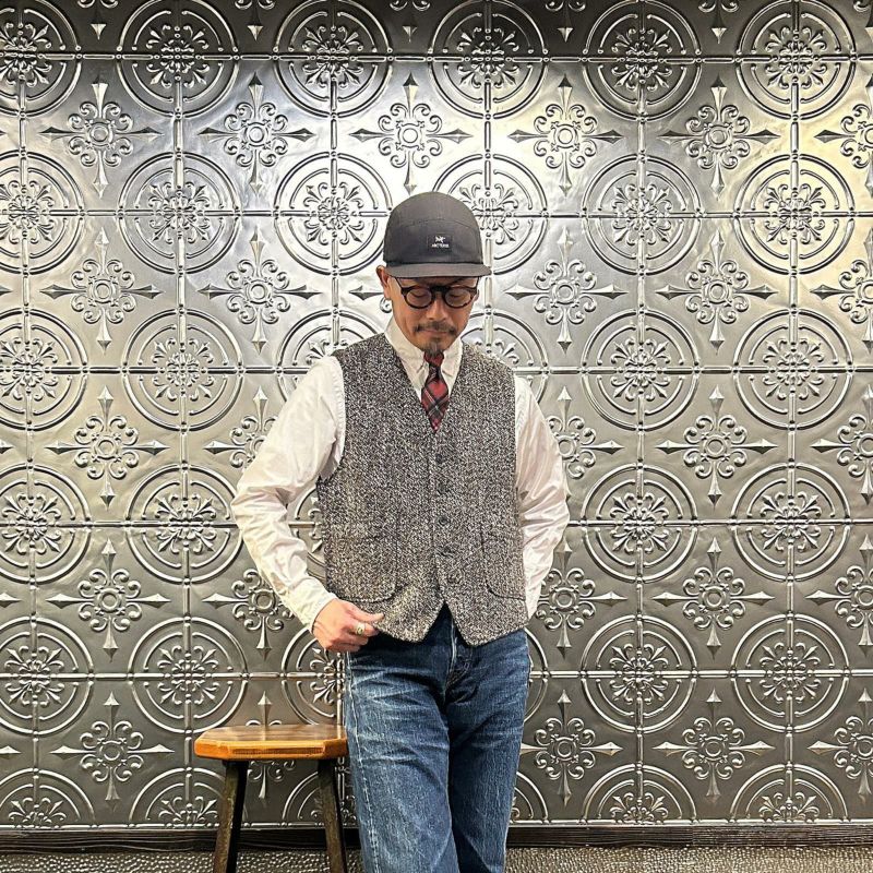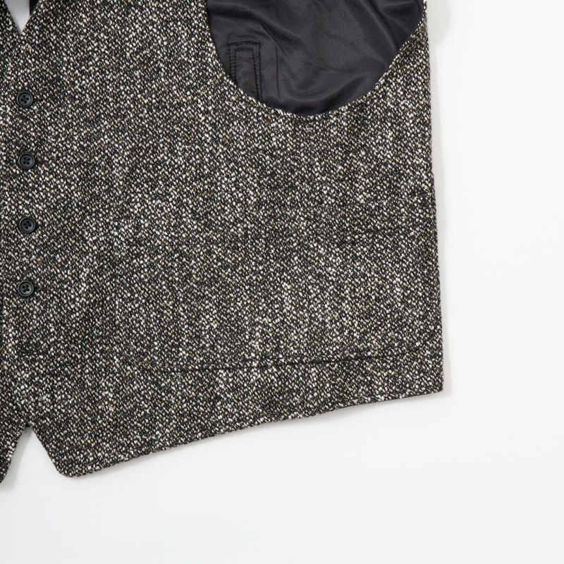 ENGINEERED GARMENTS(エンジニアドガーメンツ)のODD VEST WOOL HOMEPUN。エンジニアドガーメンツの中ではドレッシーな雰囲気のベスト。ボタンフロントで腰部分の左右にパッチポケットを装備したシンプルなデザイン。背面にジップが装備されておりデザイン的なポイント。ジップを開閉する事でシルエットのアレンジが可能。素材はブラウンとブラックのミックス感のあるホームスパン素材を使用。クラシカルで温かみを感じさせる1着。