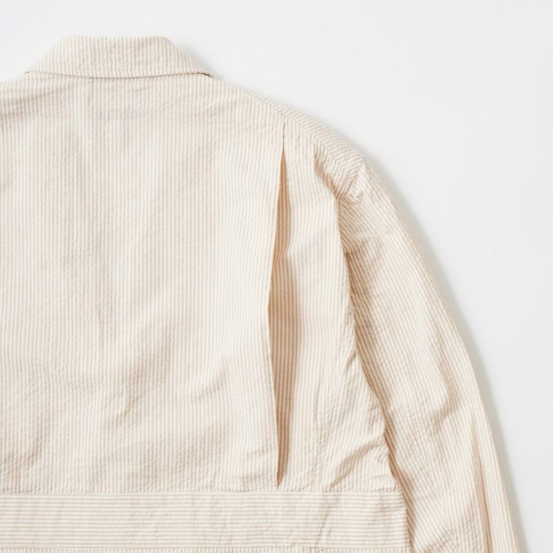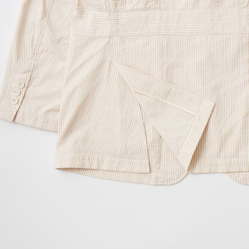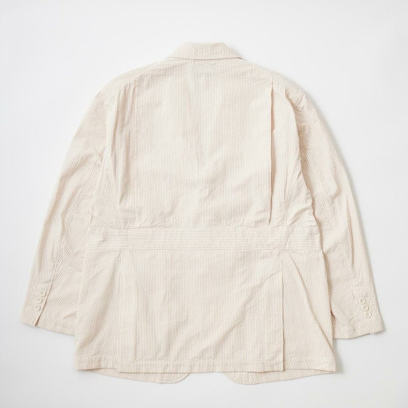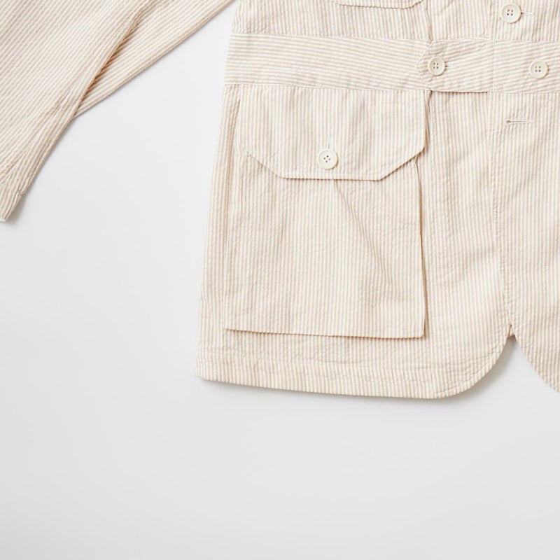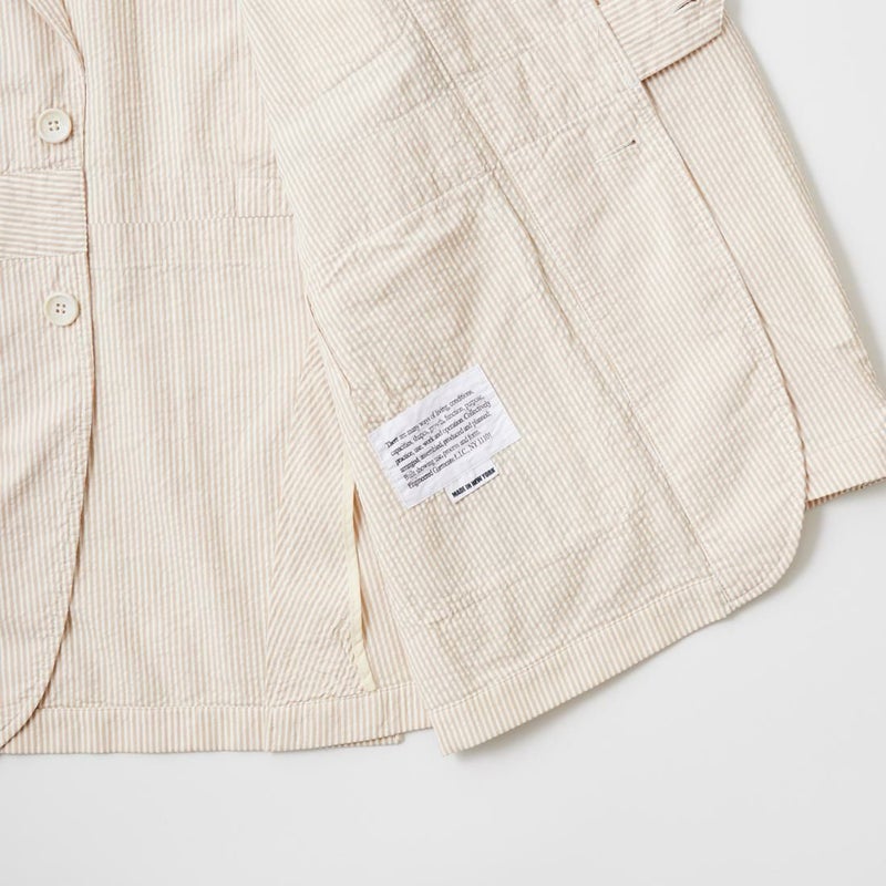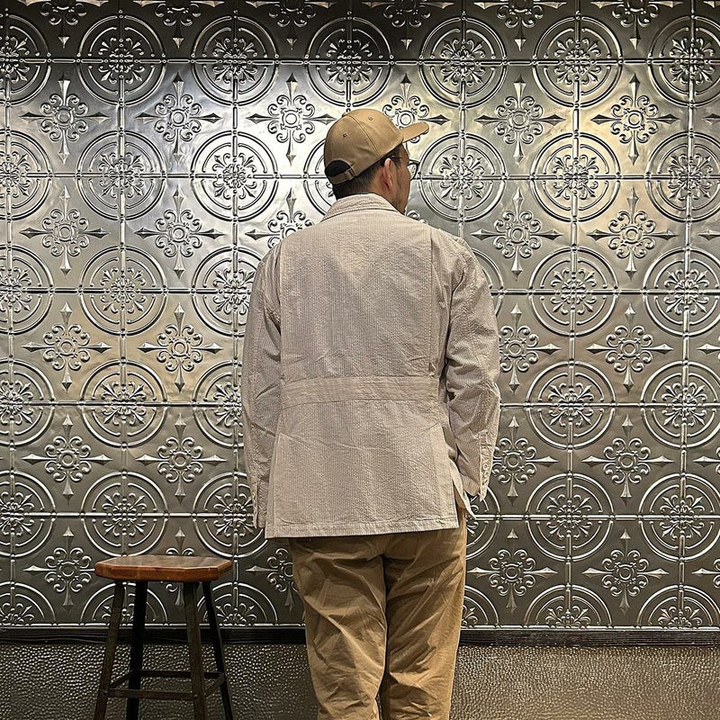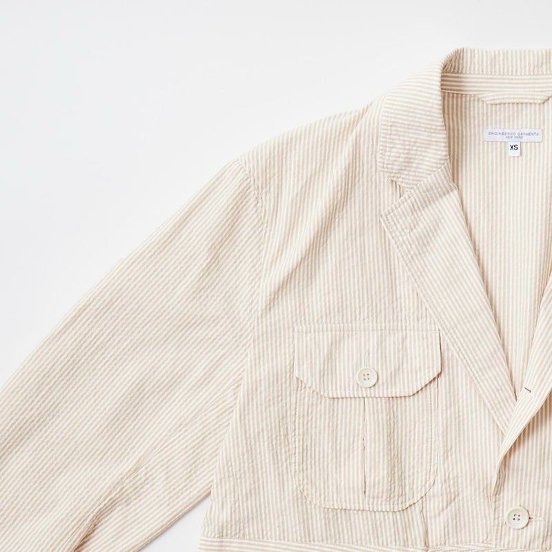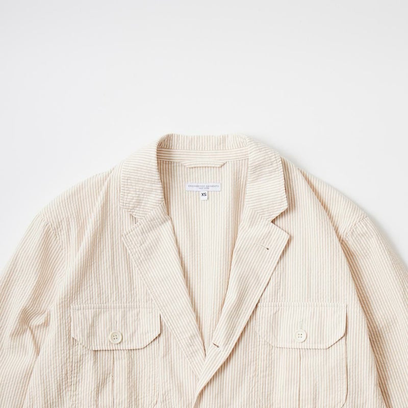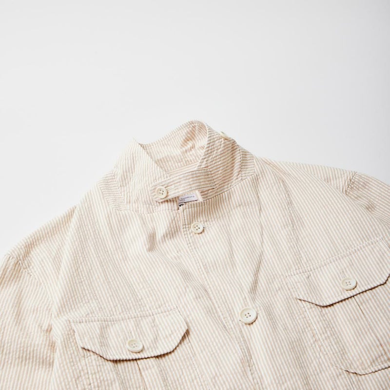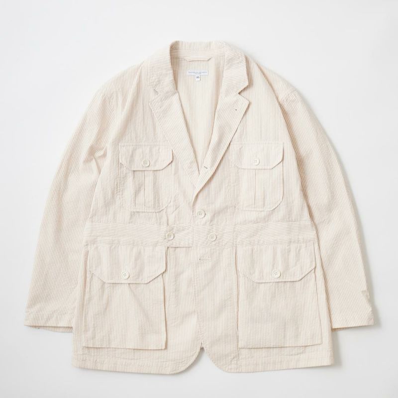 ENGINEERED GARMENTS(エンジニアド ガーメンツ)のFOLK JACKET COTTON SEERSUCKER STRIPE。春夏の定番素材シサッカーを使用したフォークジャケット。襟にはチンストラップを装備。フロントに4つのフラップポケット。ウエストベルトが特徴的なデザイン。シーズンテーマのシティーサファリを体現したようなカントリーディテール。身幅にゆとりのあるリラックスシルエット。生地表面の凹凸が涼清涼感のある夏でも肌触りの良いシアサッカー素材を使用。