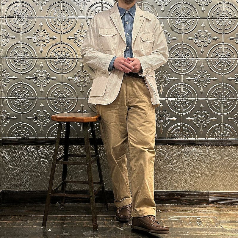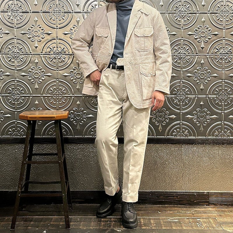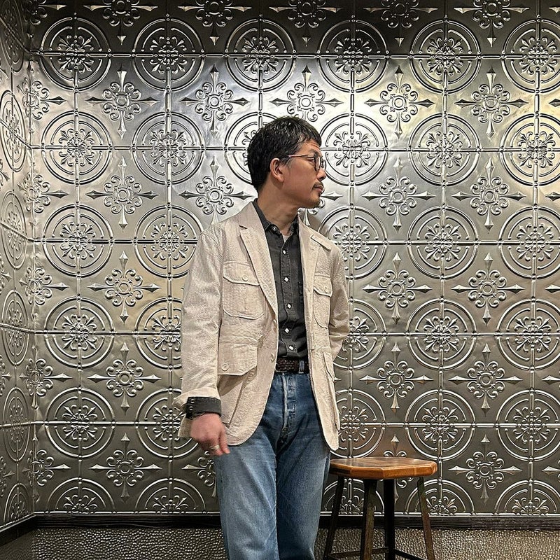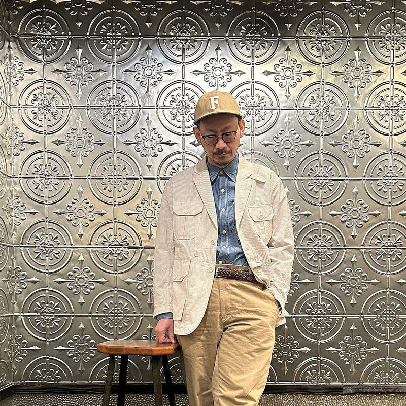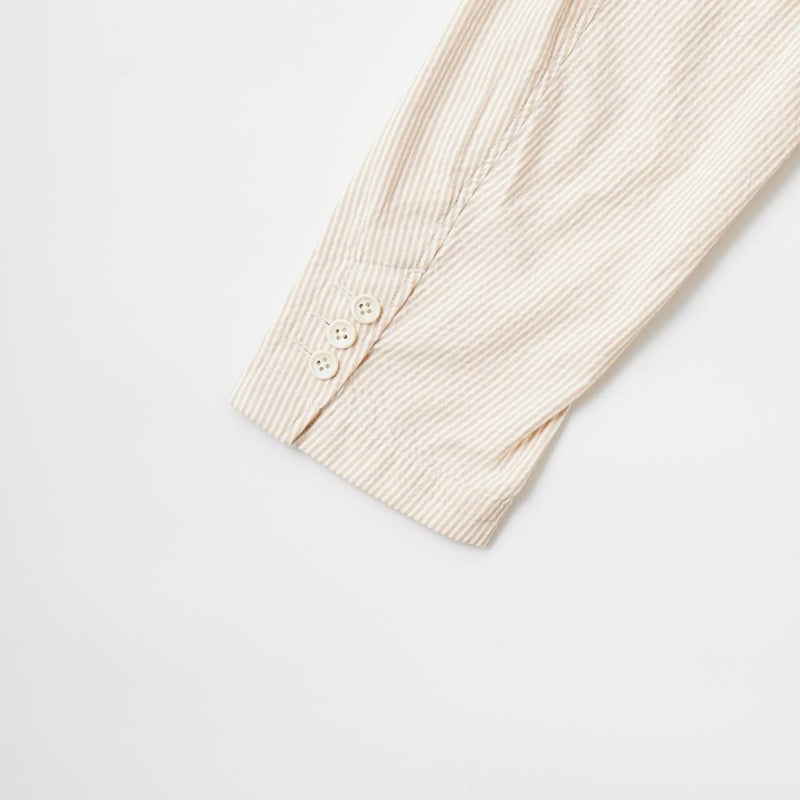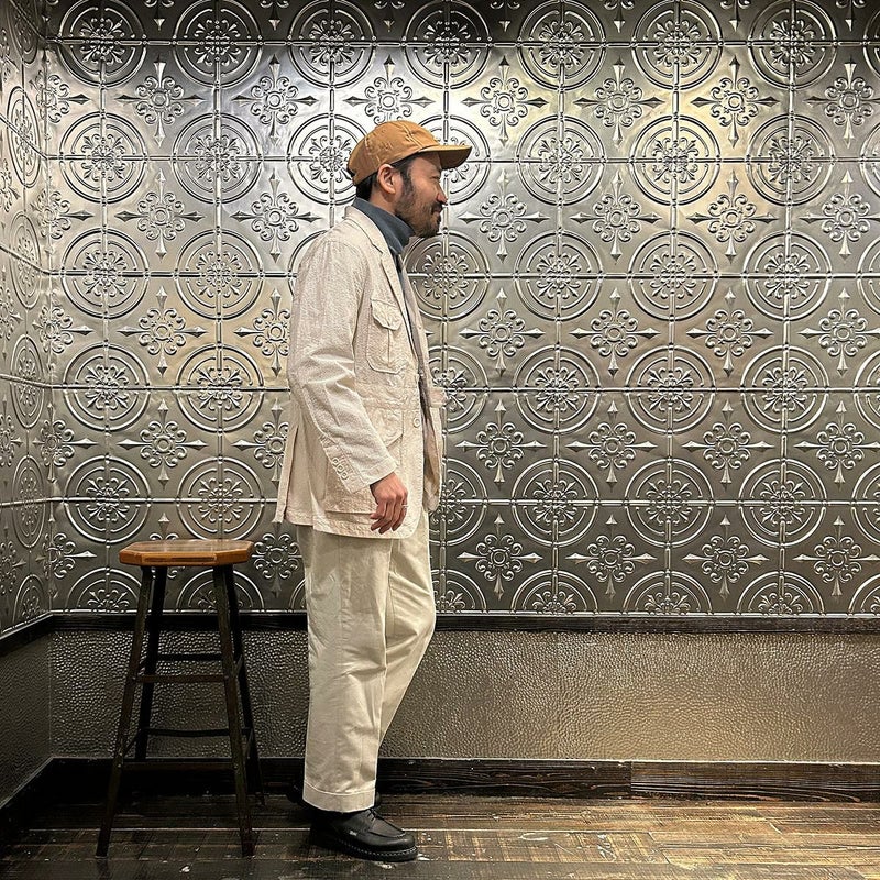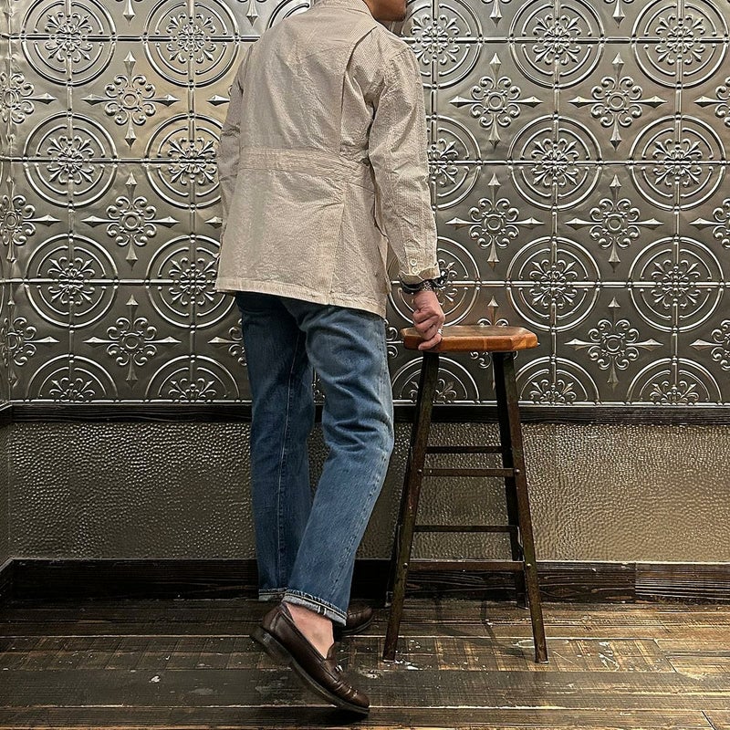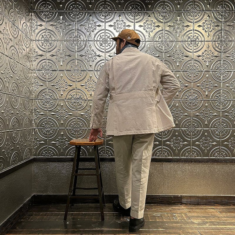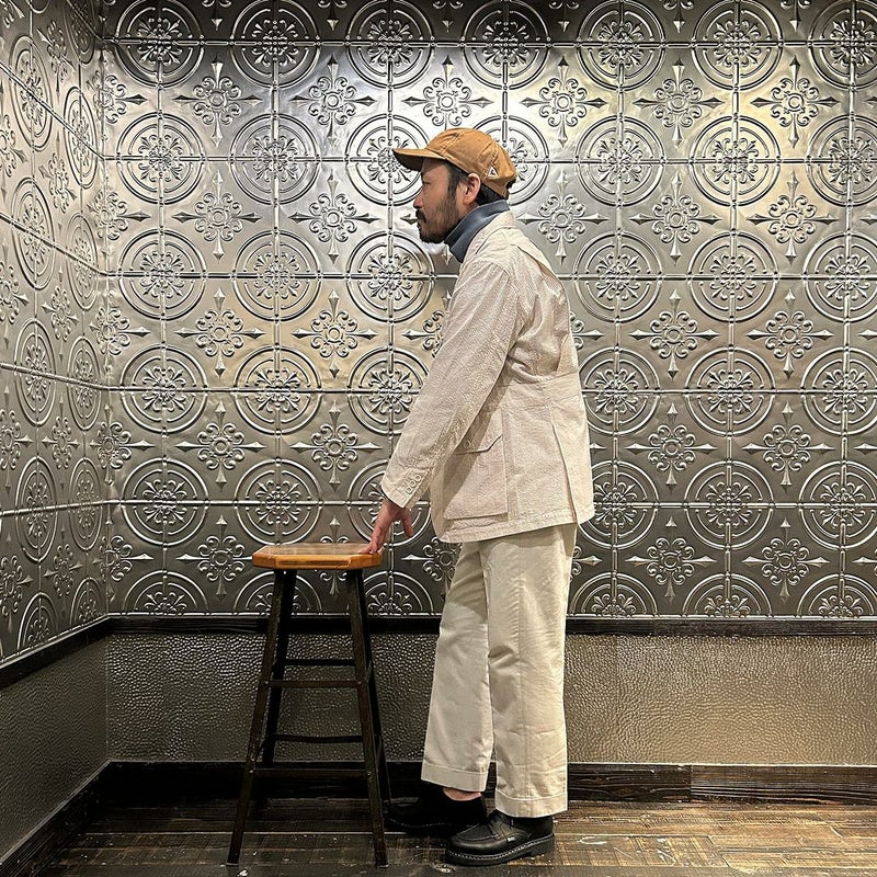 ENGINEERED GARMENTS(エンジニアド ガーメンツ)のFOLK JACKET COTTON SEERSUCKER STRIPE。春夏の定番素材シサッカーを使用したフォークジャケット。襟にはチンストラップを装備。フロントに4つのフラップポケット。ウエストベルトが特徴的なデザイン。シーズンテーマのシティーサファリを体現したようなカントリーディテール。身幅にゆとりのあるリラックスシルエット。生地表面の凹凸が涼清涼感のある夏でも肌触りの良いシアサッカー素材を使用。