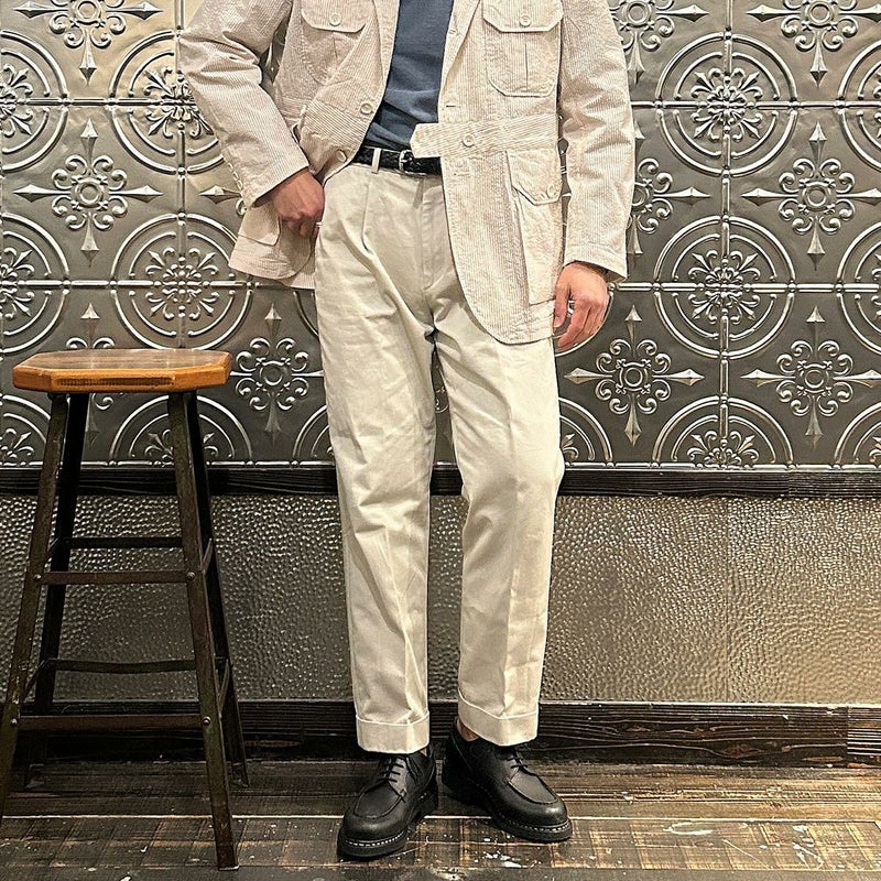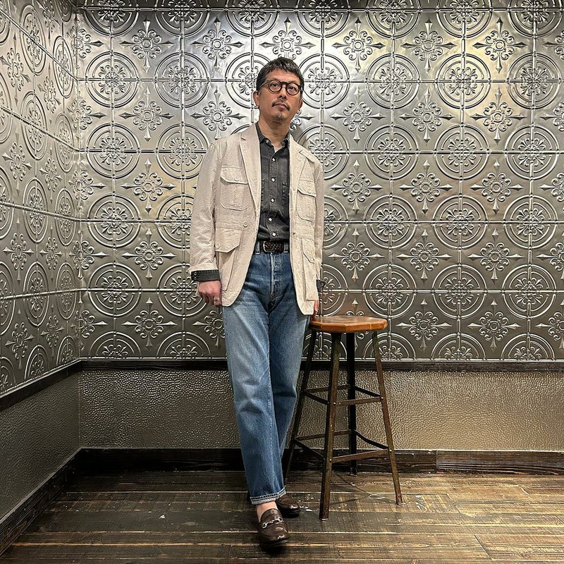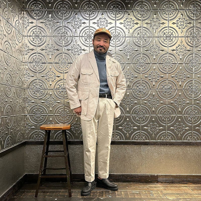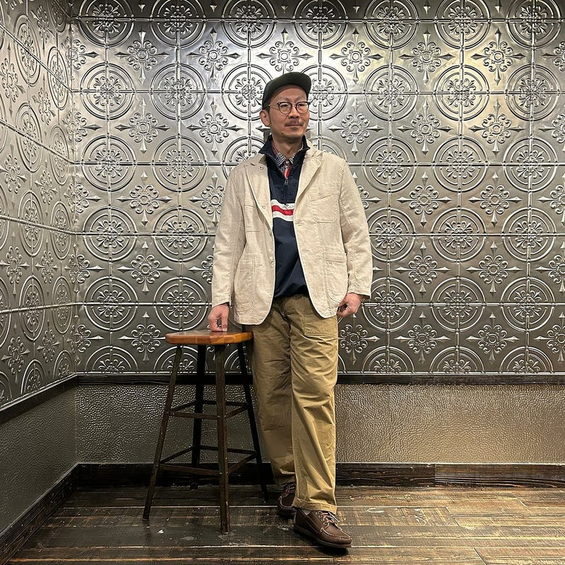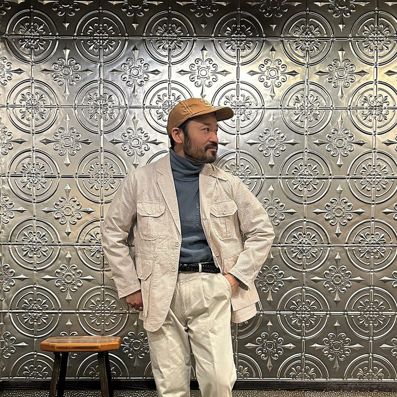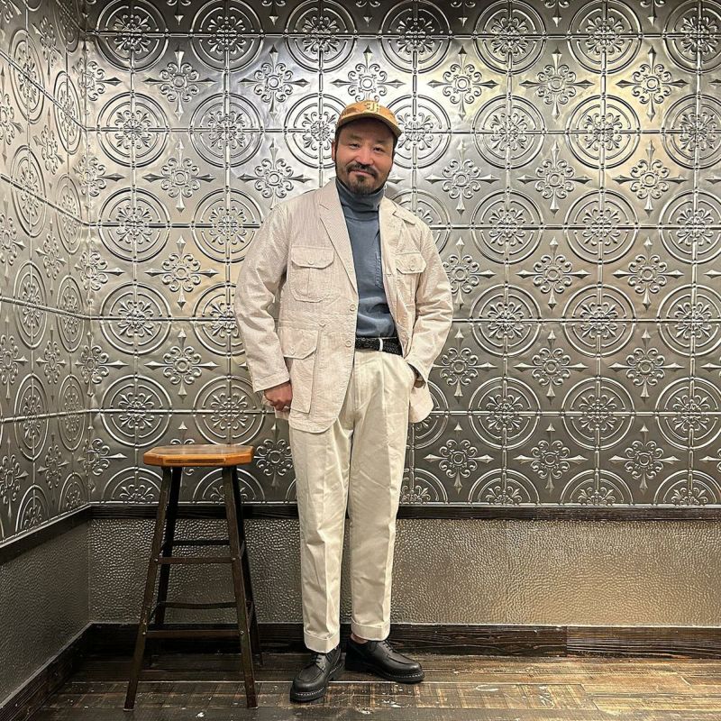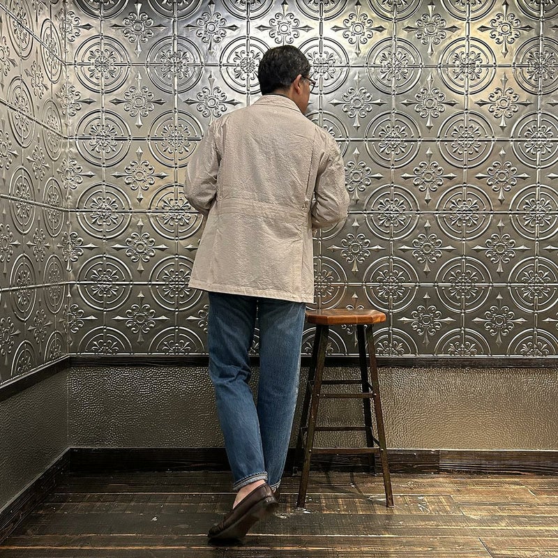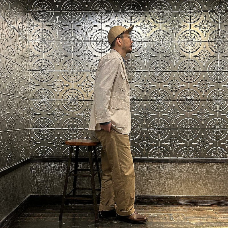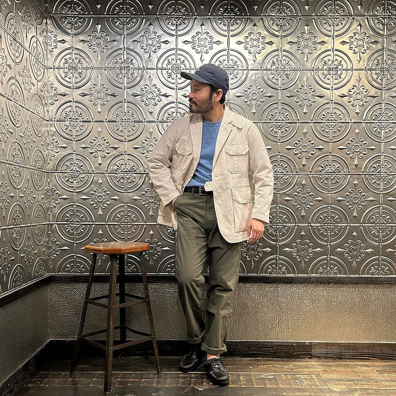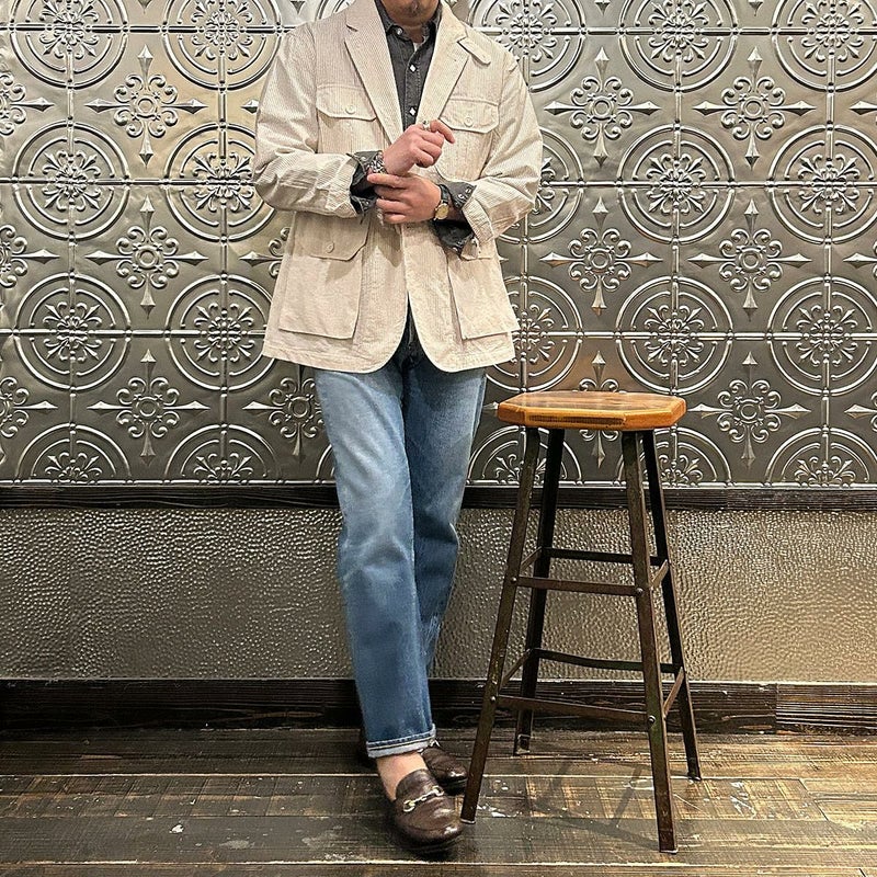 ENGINEERED GARMENTS(エンジニアド ガーメンツ)のFOLK JACKET COTTON SEERSUCKER STRIPE。春夏の定番素材シサッカーを使用したフォークジャケット。襟にはチンストラップを装備。フロントに4つのフラップポケット。ウエストベルトが特徴的なデザイン。シーズンテーマのシティーサファリを体現したようなカントリーディテール。身幅にゆとりのあるリラックスシルエット。生地表面の凹凸が涼清涼感のある夏でも肌触りの良いシアサッカー素材を使用。