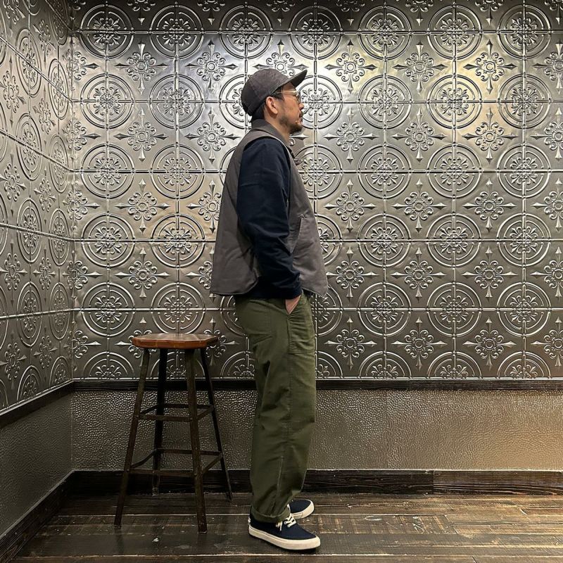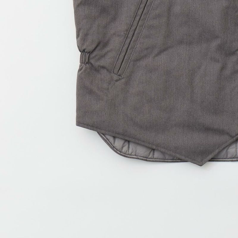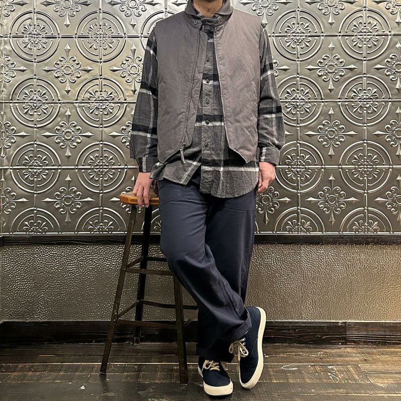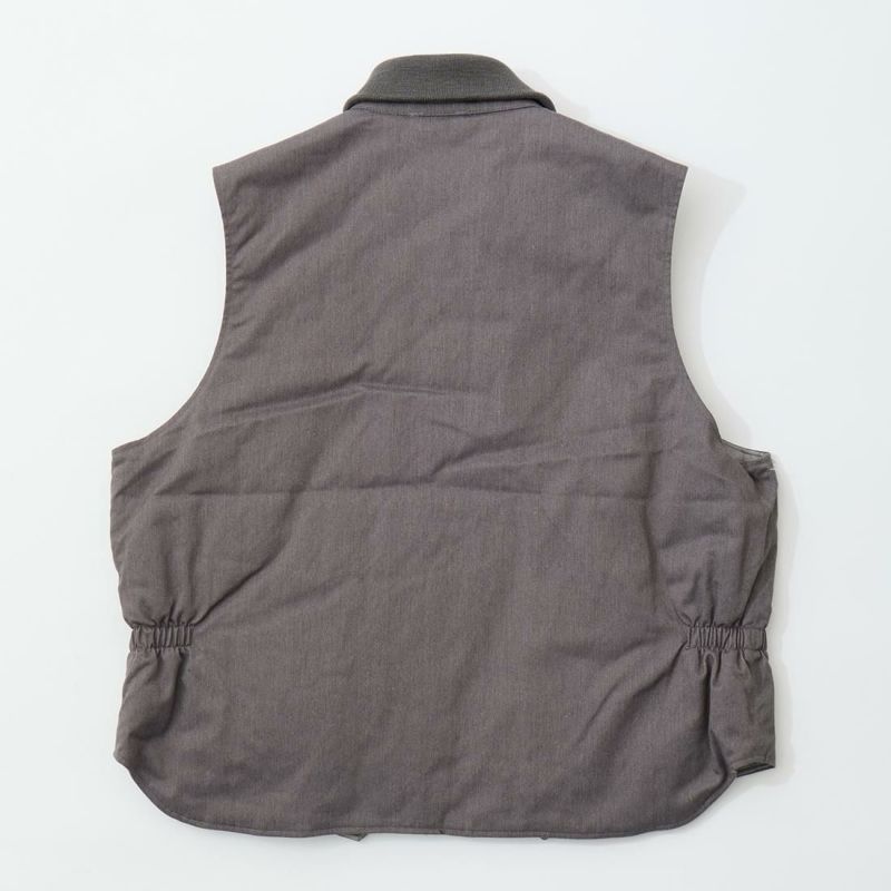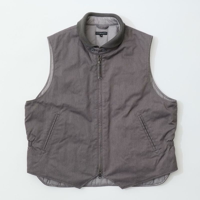 ENGINEERED GARMENTS(エンジニアドガーメンツ)のLL VEST PC TANKER TWILL。コットンポリエステルのツイル素材を使用したエルエルベスト。首元はリブのショールカラーでチンストラップも装備。中綿入りのパデッド仕様でボリュームは感じさせないものの保温性も高いベスト。アウター、インナーと使い勝手の良い1着。