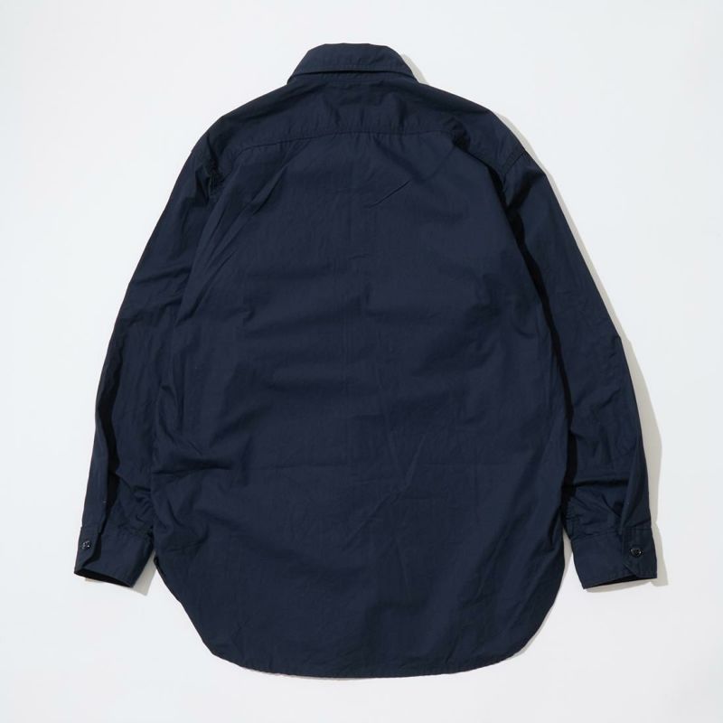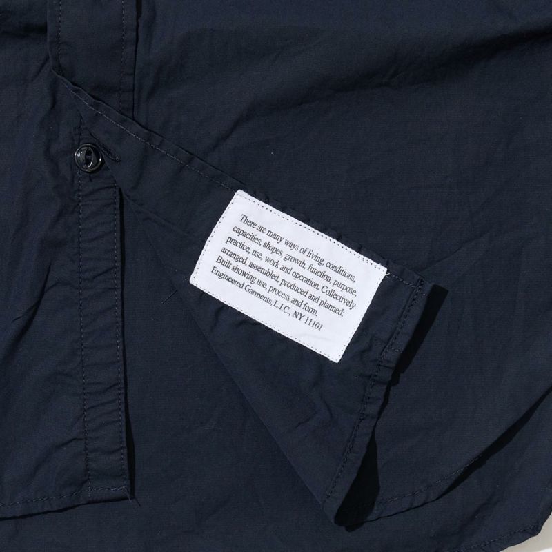 ENGINEERED GARMENTS(エンジニアド ガーメンツ)のWORK SHIRT COTTON BROADCLOTH。肩や袖、脇はトリプルニードルで縫製され、肘の当て布やサイドのガゼット、カンヌキステッチなどワークなディテールがふんだんに盛り込まれている定番シャツ。左右非対称の胸ポケット。素材は光沢があり上品な雰囲気のブロードクロスを使用。