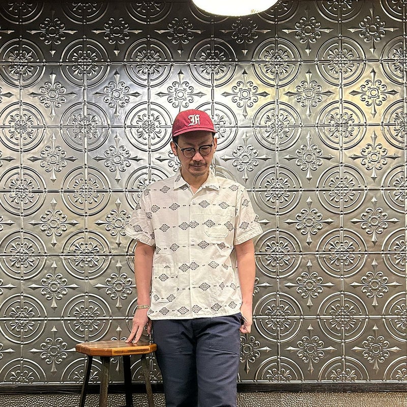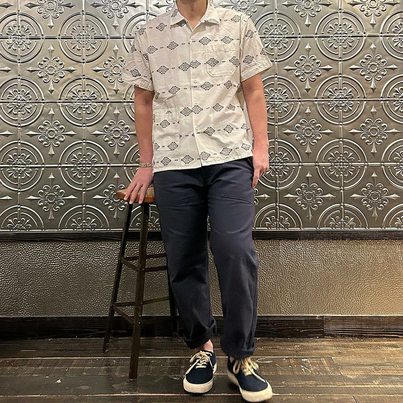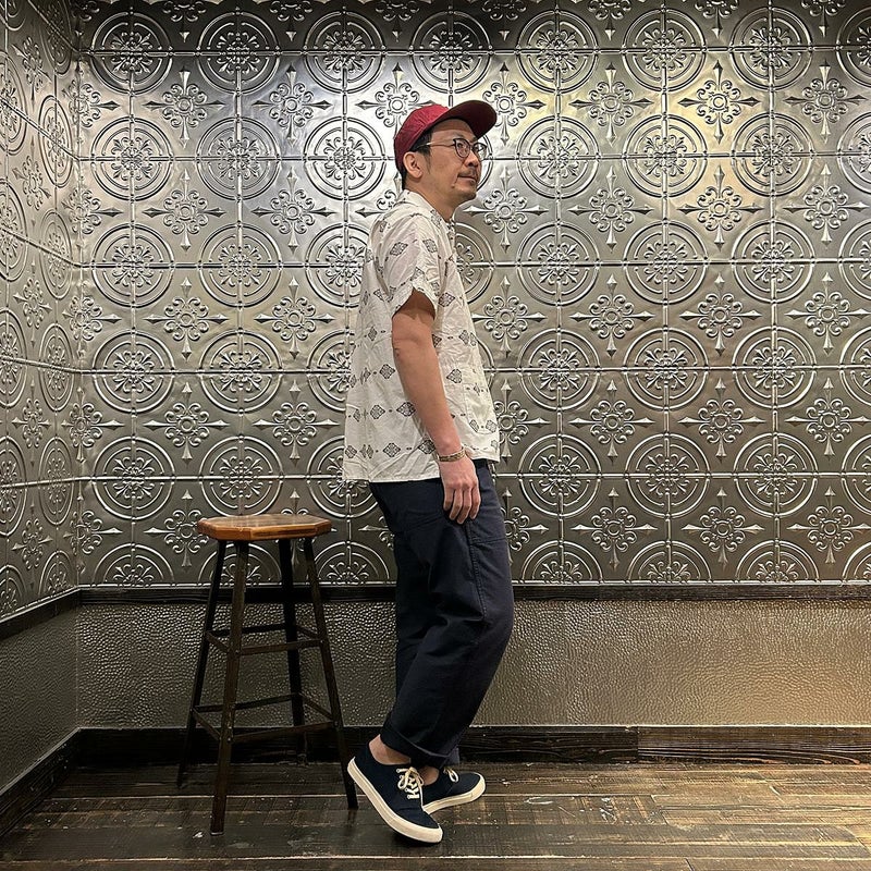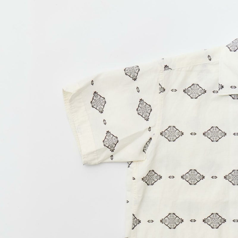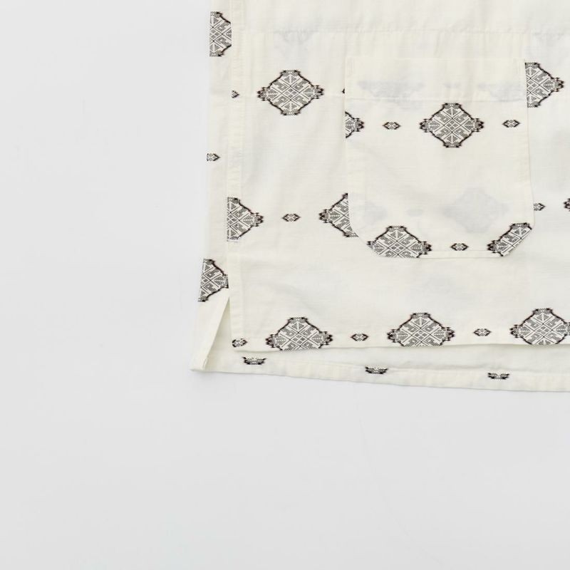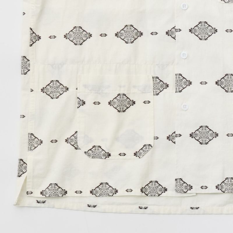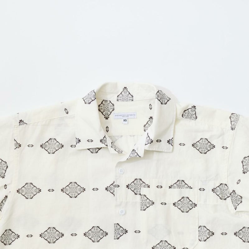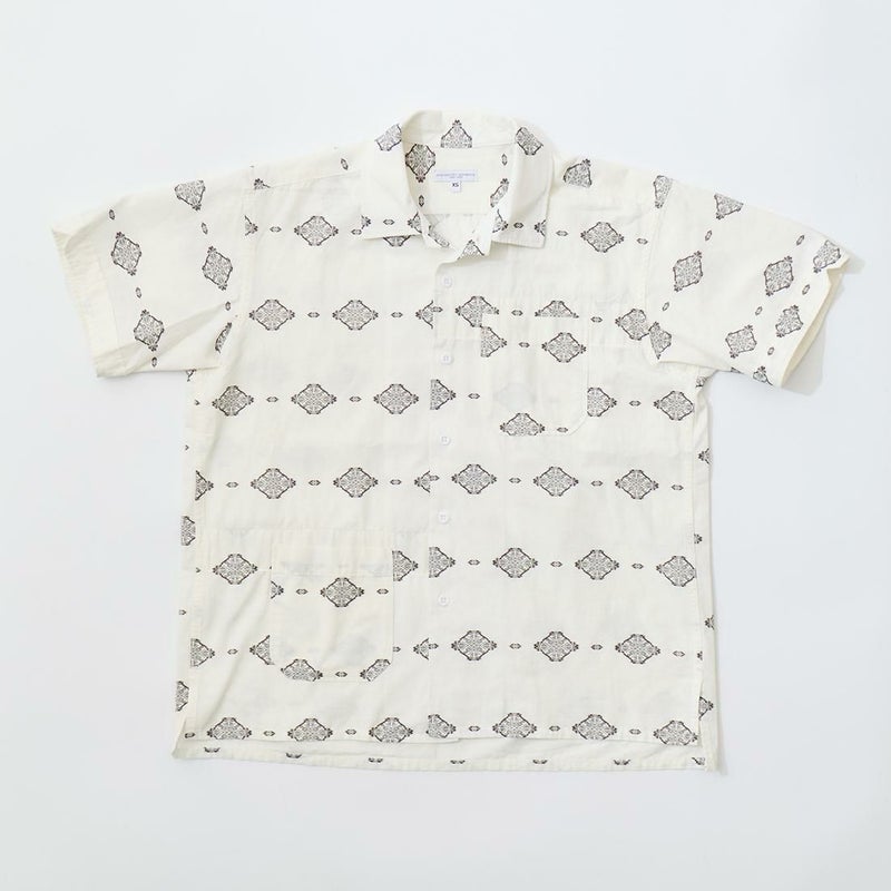 ENGINEERED GARMENTS(エンジニアド ガーメンツ)のCAMP SHIRT COTTON IKAT PRINT。オープンカラーにボックスシルエットのクラシックなデザインのキャンプシャツ。左胸と右下にポケットが配置された左右非対称なデザイン。腰周りの絞りがないボックスシルエット。素材は今シーズンのテーマであるブラックとホワイトの2色を用いたイカットパターン。夏のスタイリングに最適な1着。
